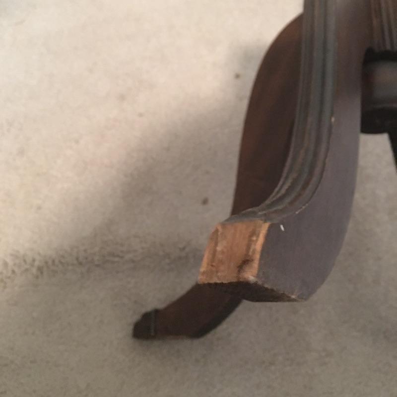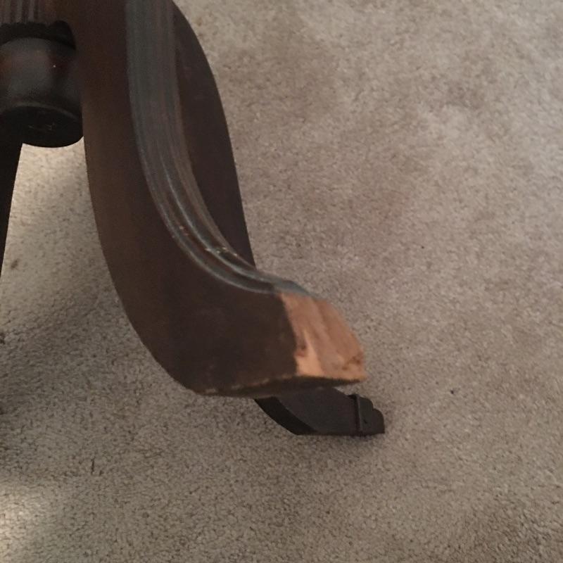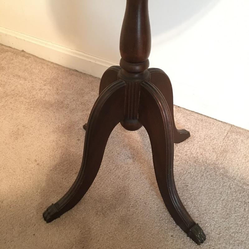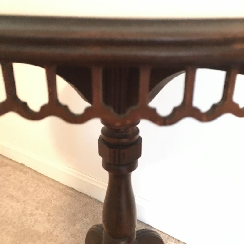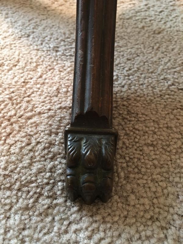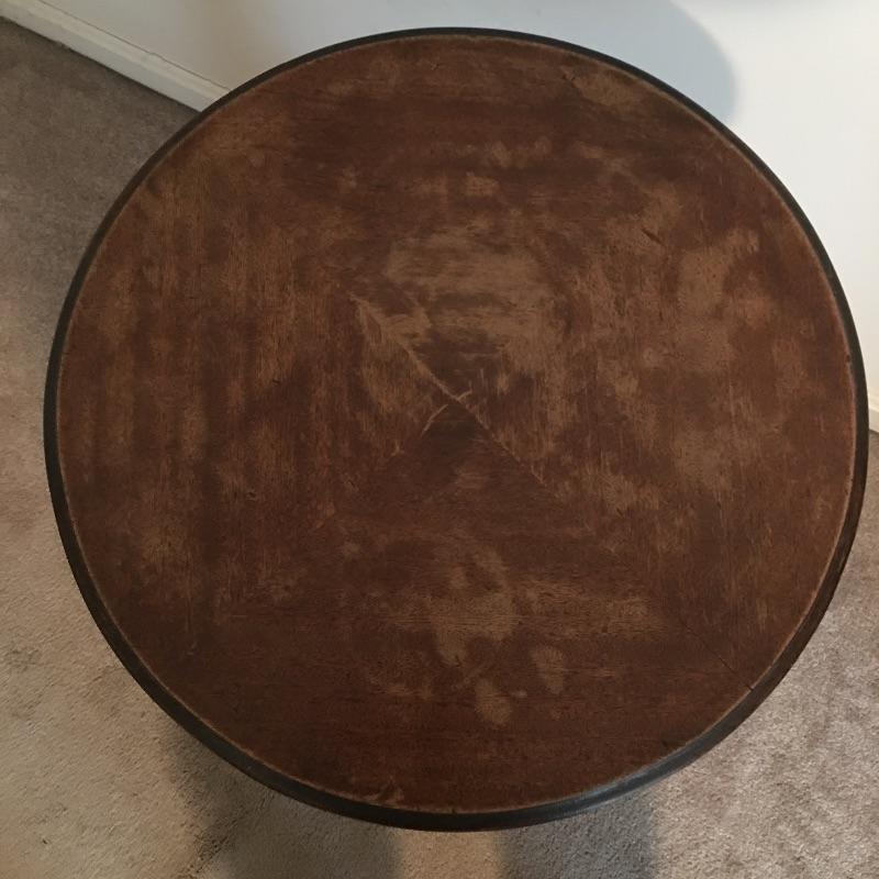 Wow! What a treasure find here! One small antique side table with a curved wooden trim under top and four legs. Table has been well loved and is missing two of the metal feet and the finish on top is worn, see pictures. A beautiful piece to use as is or refinish. Doily included. Table measures 18”D x 26” tall.