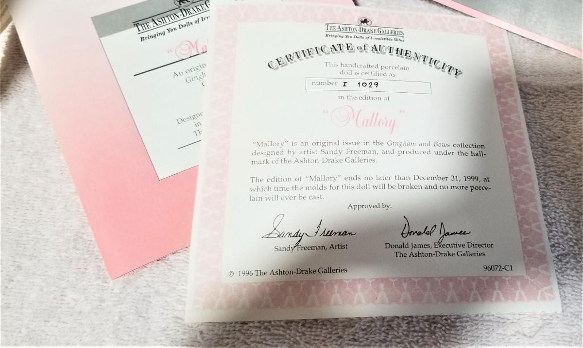 From the "Gingham and Bows" series - "Mallory" - all original, new/never removed from box. About 20" tall. #1029 in this limited series, retired in 1999. Note: Box top has a tear in it. These dolls were expensive when purchased.