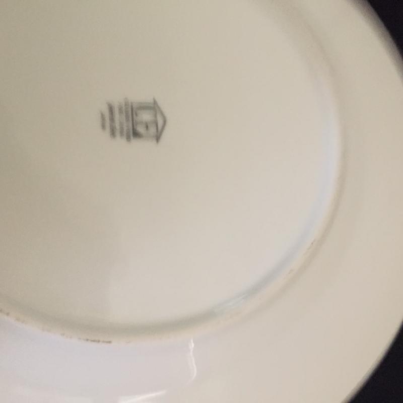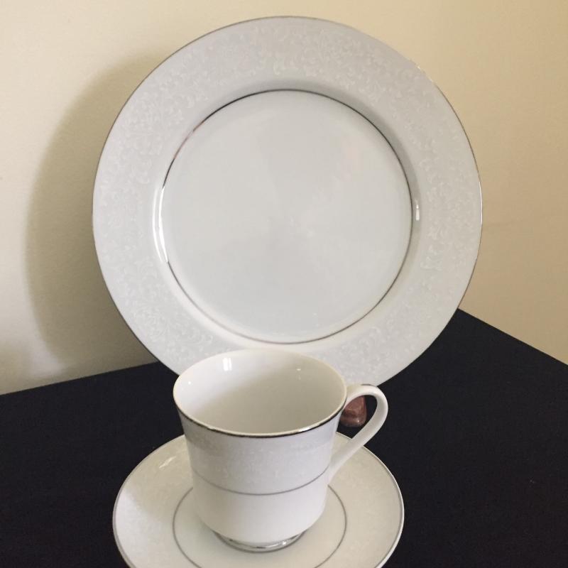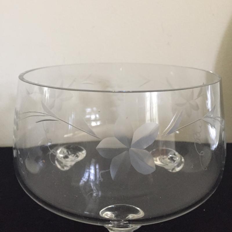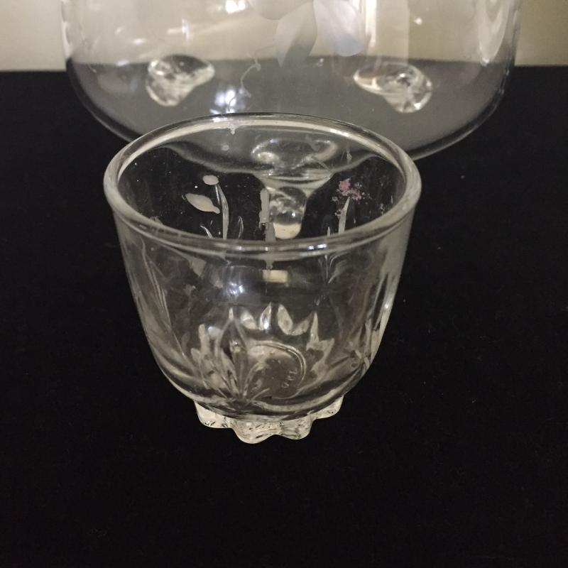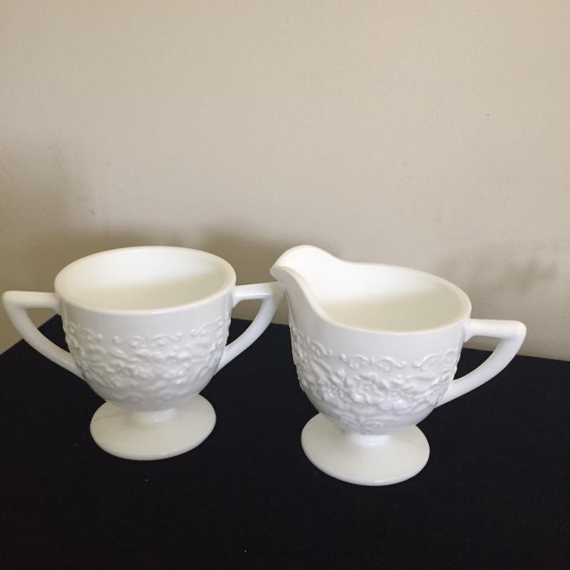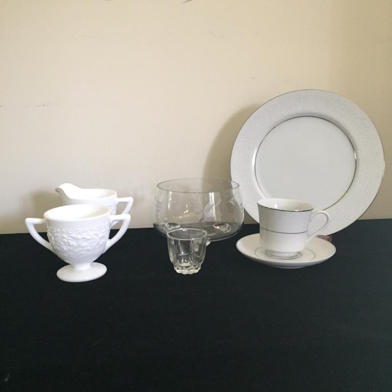 China plate, cup, and saucer. Milk glass cream and sugar set. Etched glass bowl and small glass.