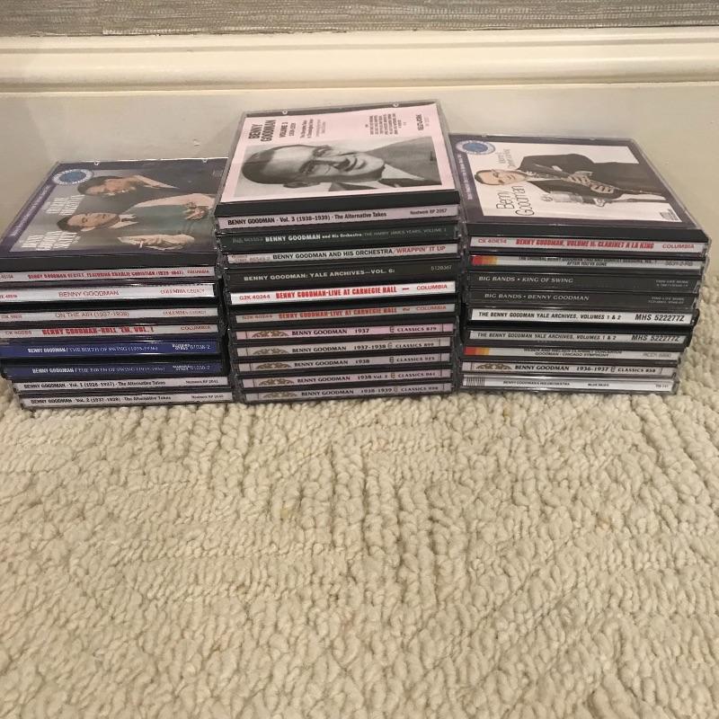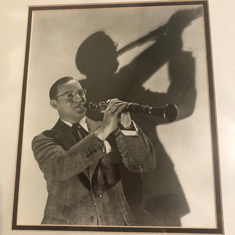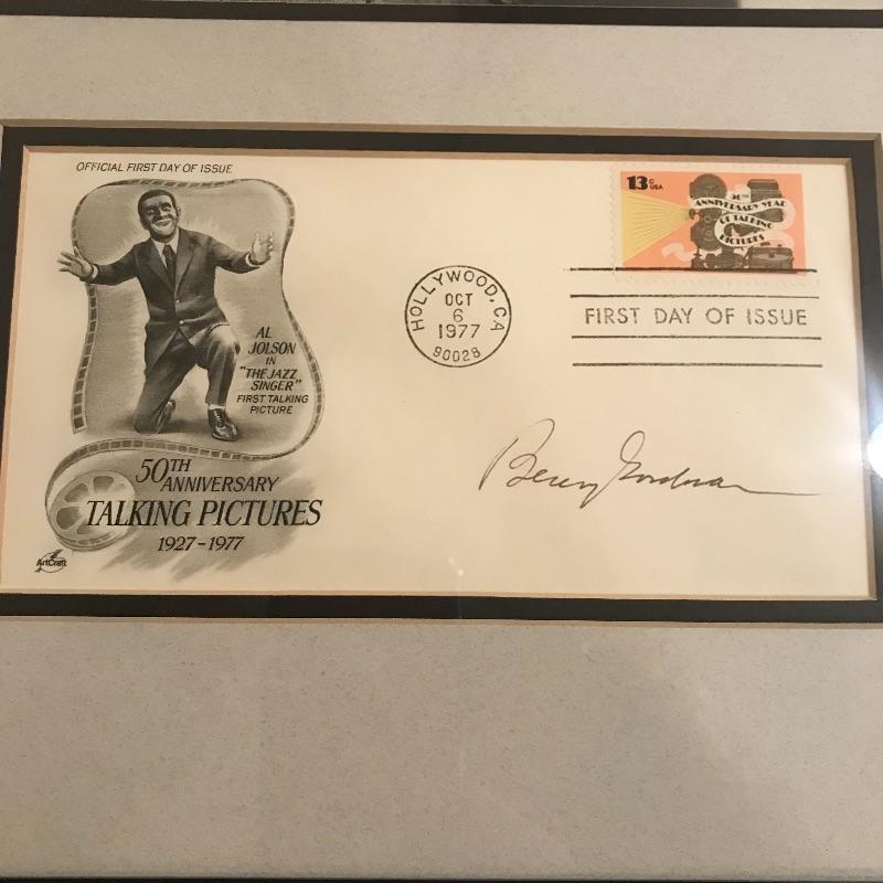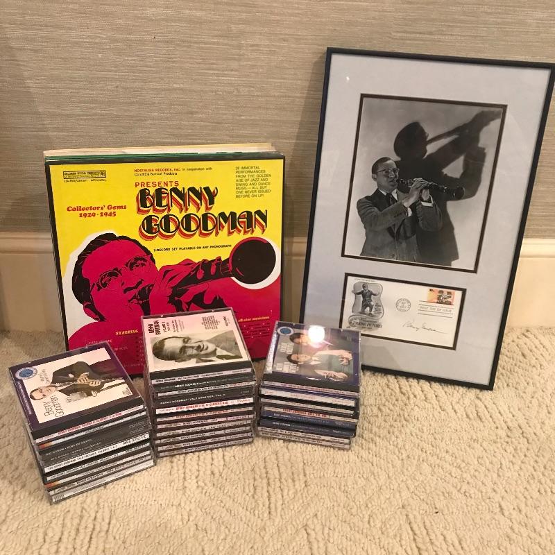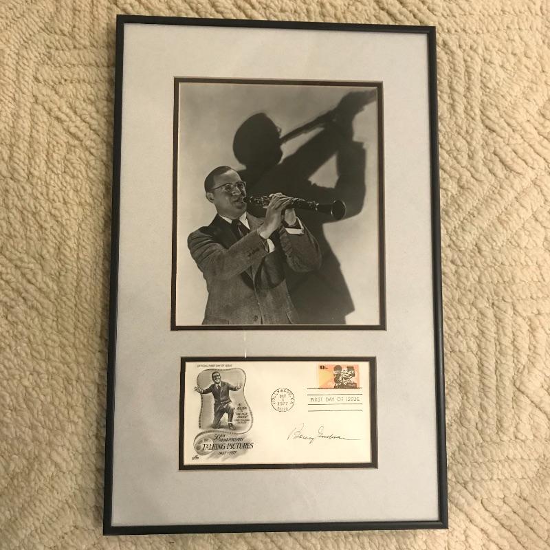 Nicely framed and double Matted photograph of Benny Goodman framed with an autographed stamped envelope from 1977 50th anniversary of “Talking Pictures”. Frame measures 18” x 12”. No COA. Lot also includes collection of CD’s of Benny Goodman’s work and fourteen LPs of the same. Shipping available.