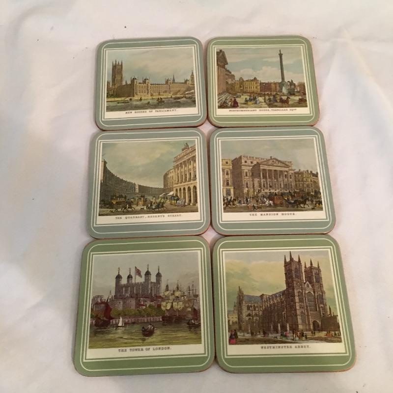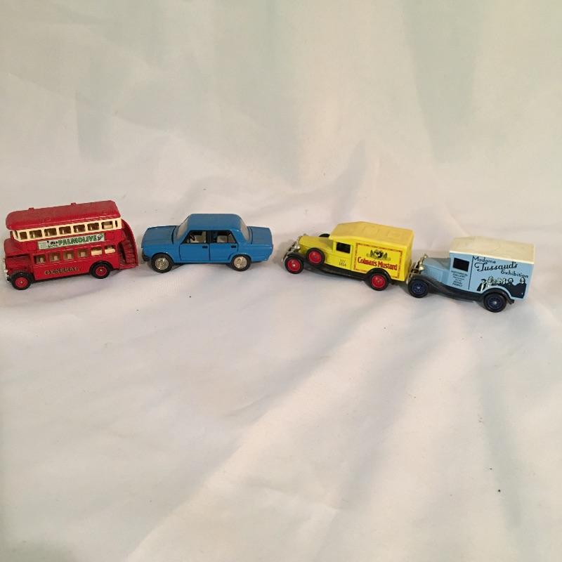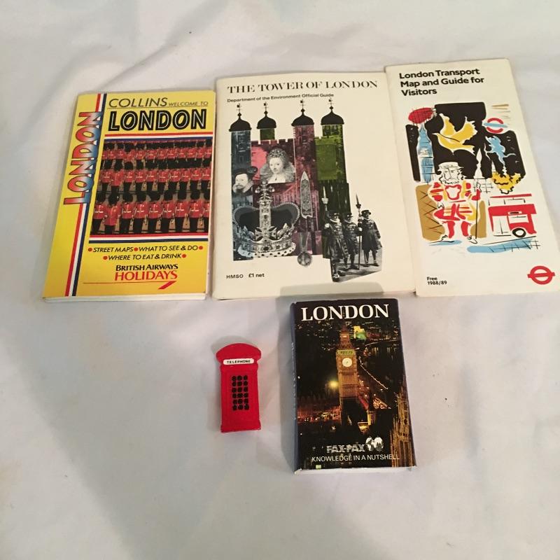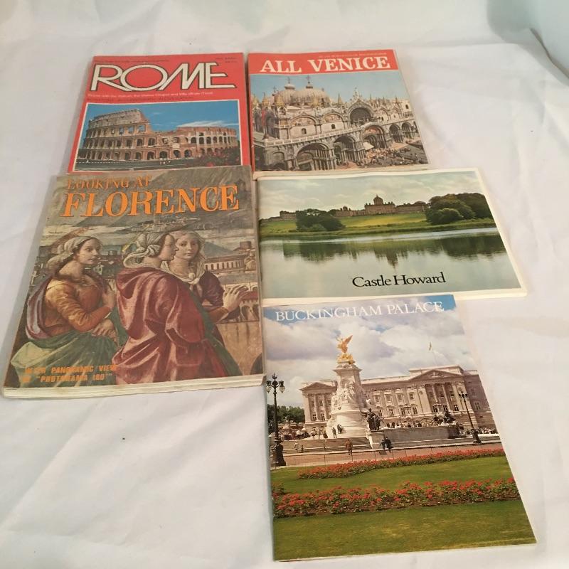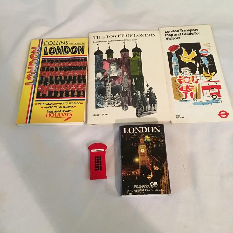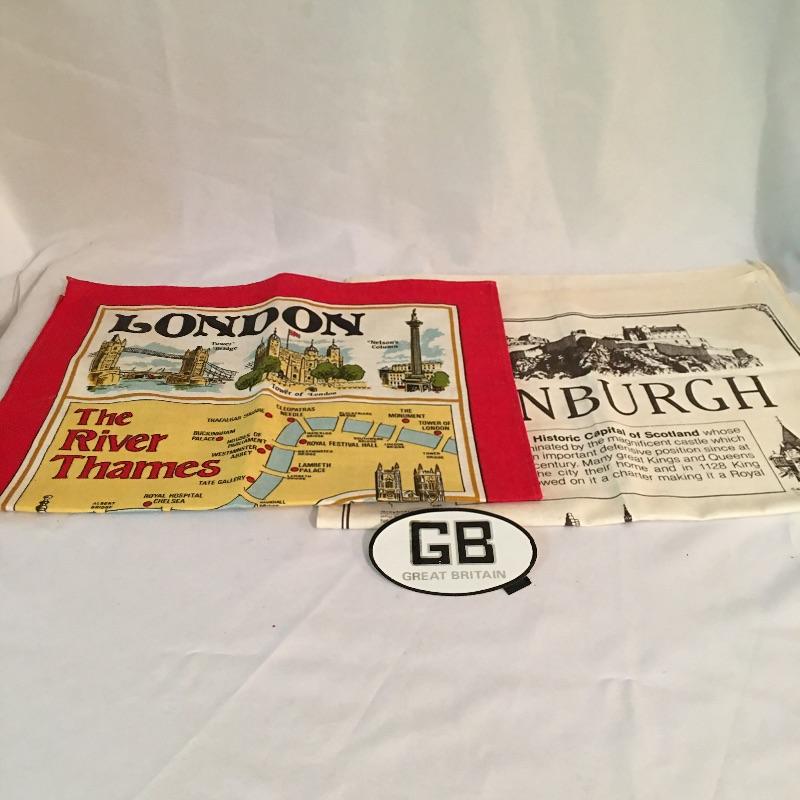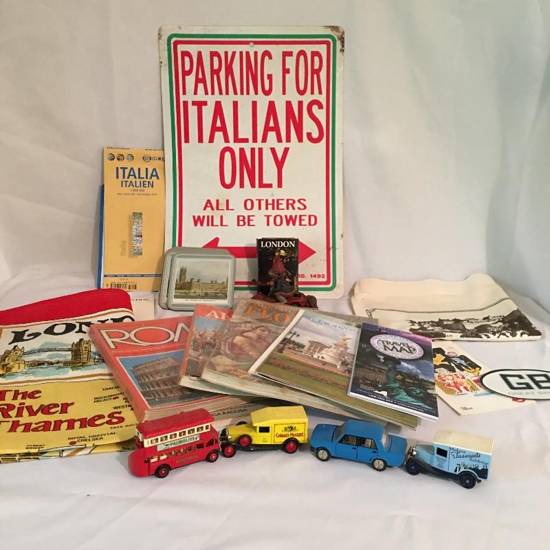 European swag. Lot includes tea towels from London and Edinburgh, Italian travel books, Tom Clark Resin figurine “Monty”, plastic Italian only parking sign, four model cars and more.