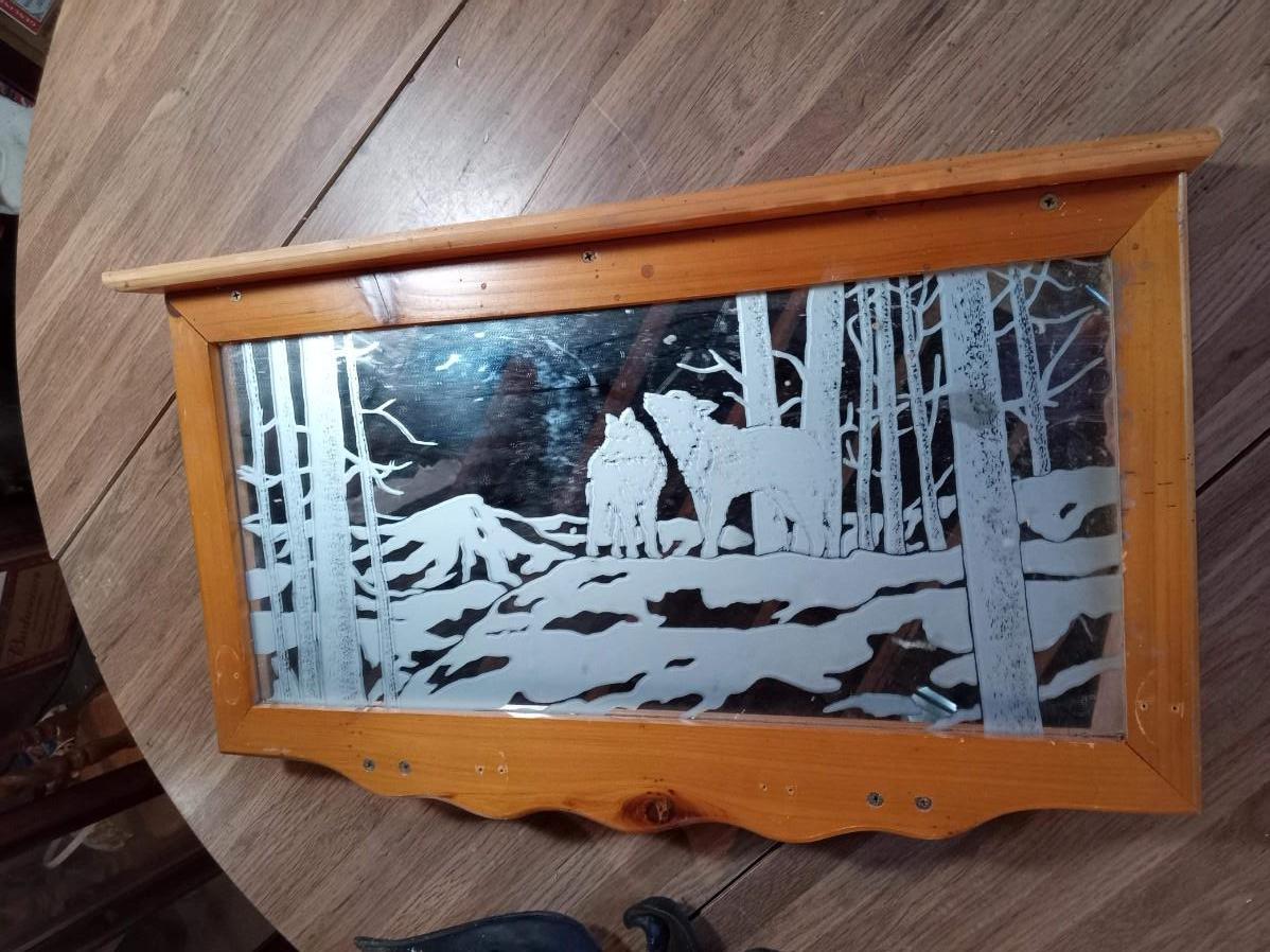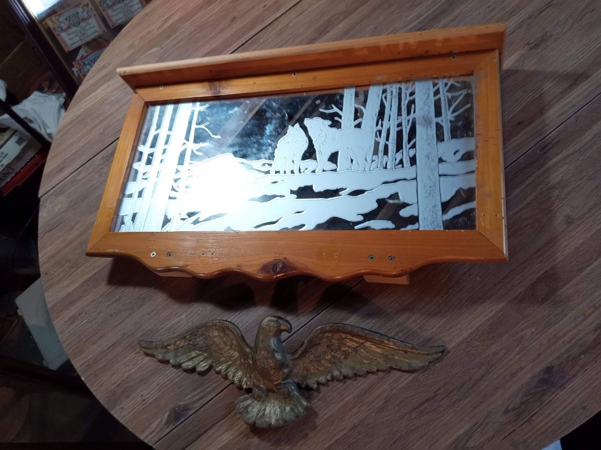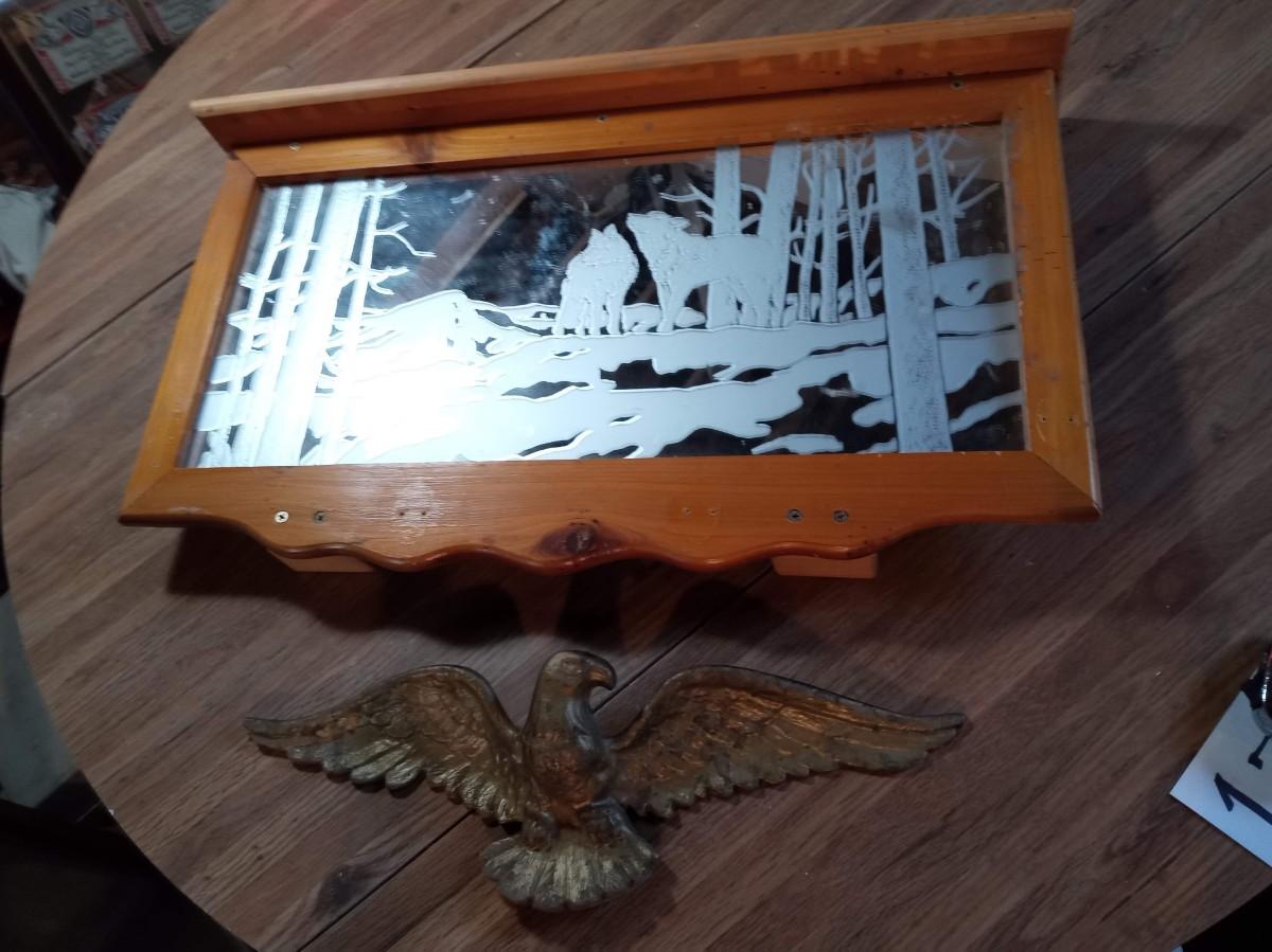 FROSTED GLASS PICTURE OF TWO WOLVES IN THE FOREST DESIGNED EXCLUSIVELY BY COLLECTIONS ETC. MEASURED AT 23×14 AND A BRASS EAGLE PLAQUE
