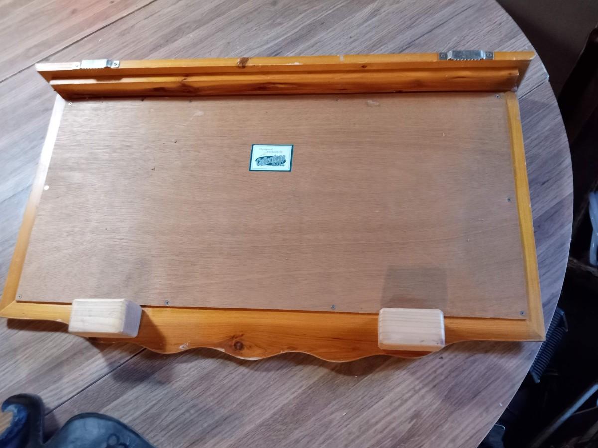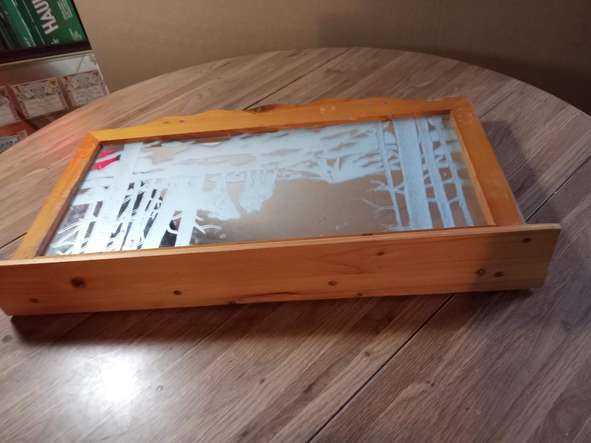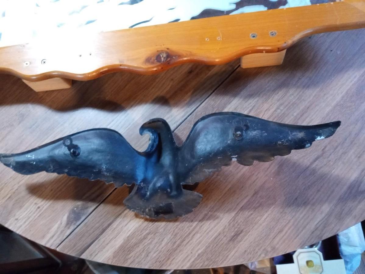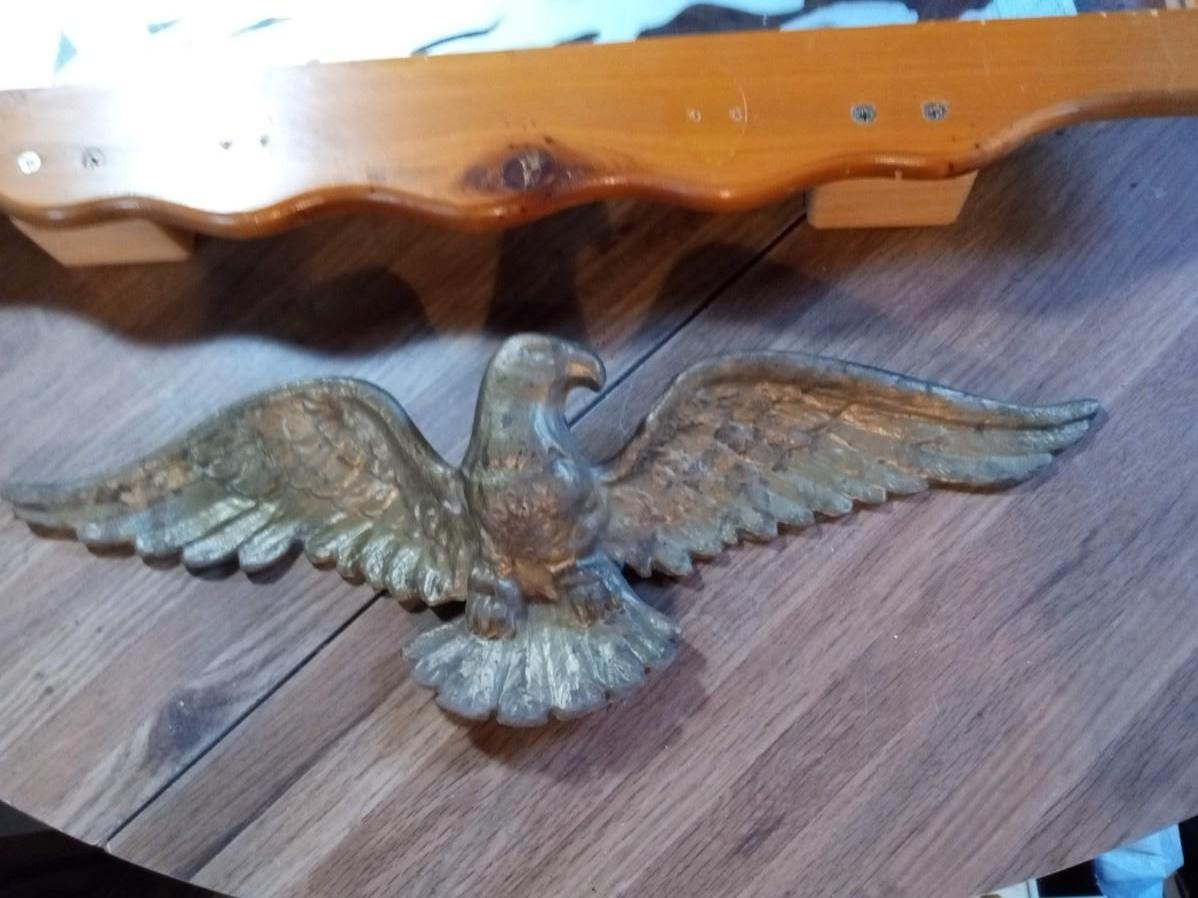 FROSTED GLASS PICTURE OF TWO WOLVES IN THE FOREST DESIGNED EXCLUSIVELY BY COLLECTIONS ETC. MEASURED AT 23×14 AND A BRASS EAGLE PLAQUE