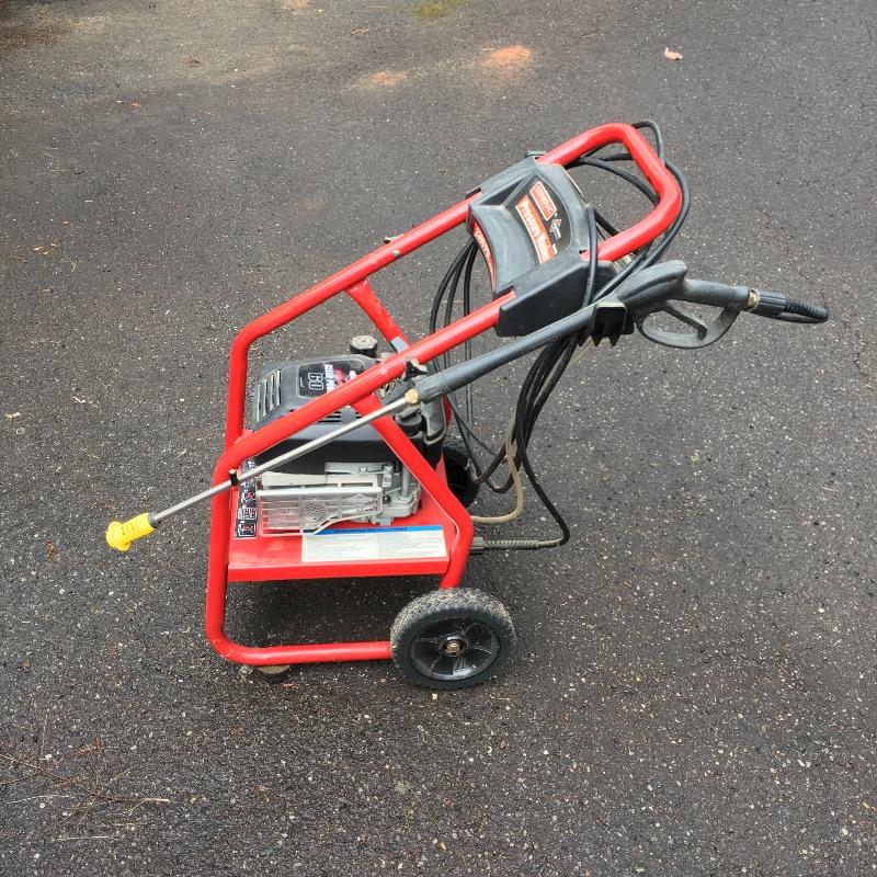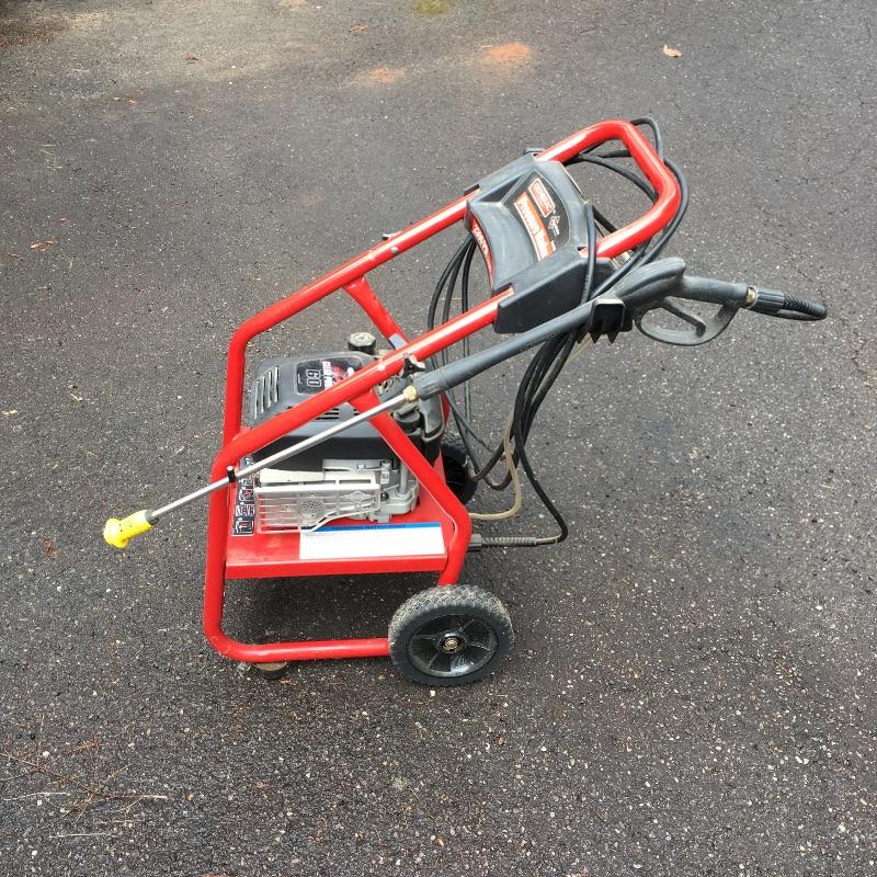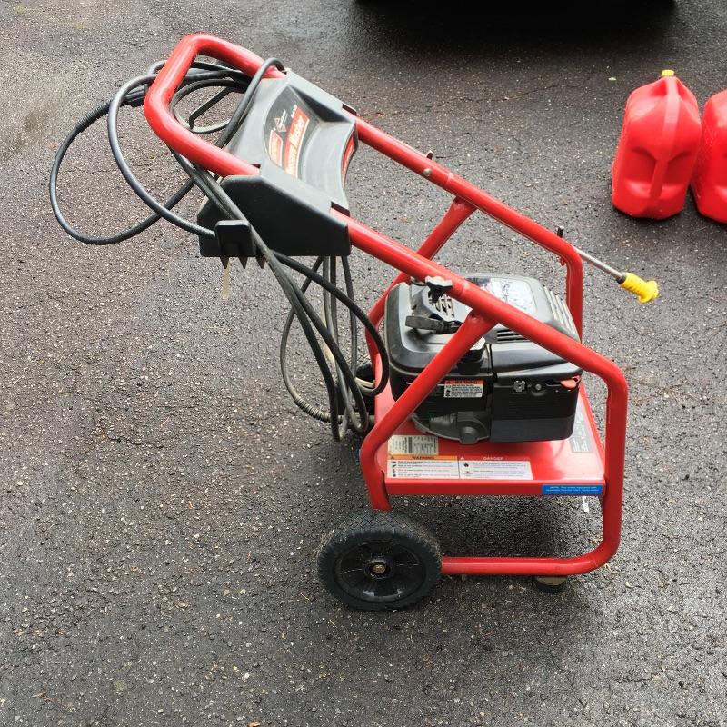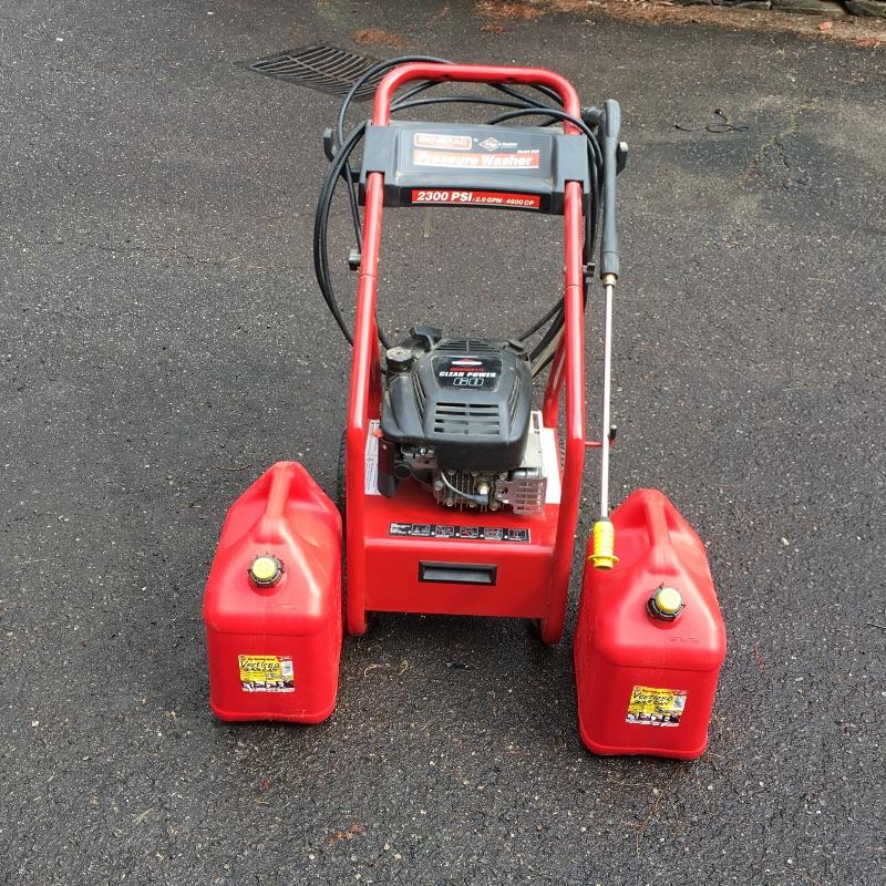 Generac pressure washer 2300 PSI model # G23 with a Briggs & Stratton 6.0 HP motor and two five gallon gas cans. Machine was not tested as it has no gas, but it appears to be in great shape, just dusty.