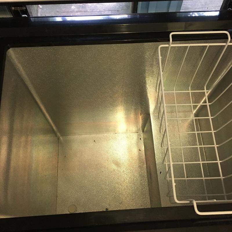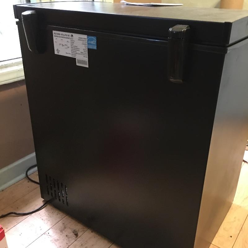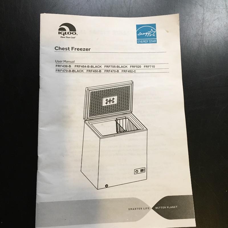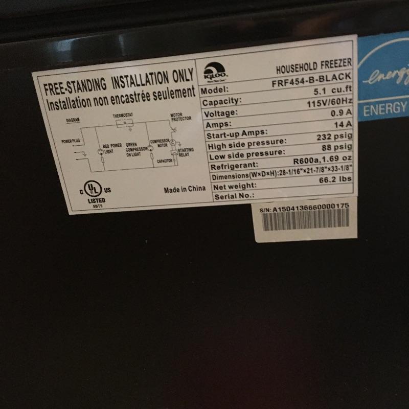 Igloo model# FRF-454 5.1 cubic feet chest freezer in black. Give yourself the room you need to store that extra quarantine food. Freezer worked when tested. Freezer measures 22” x 29” x 33”. Bring help item is substantial.