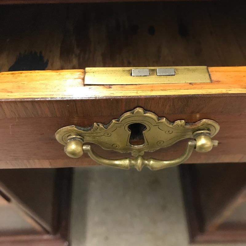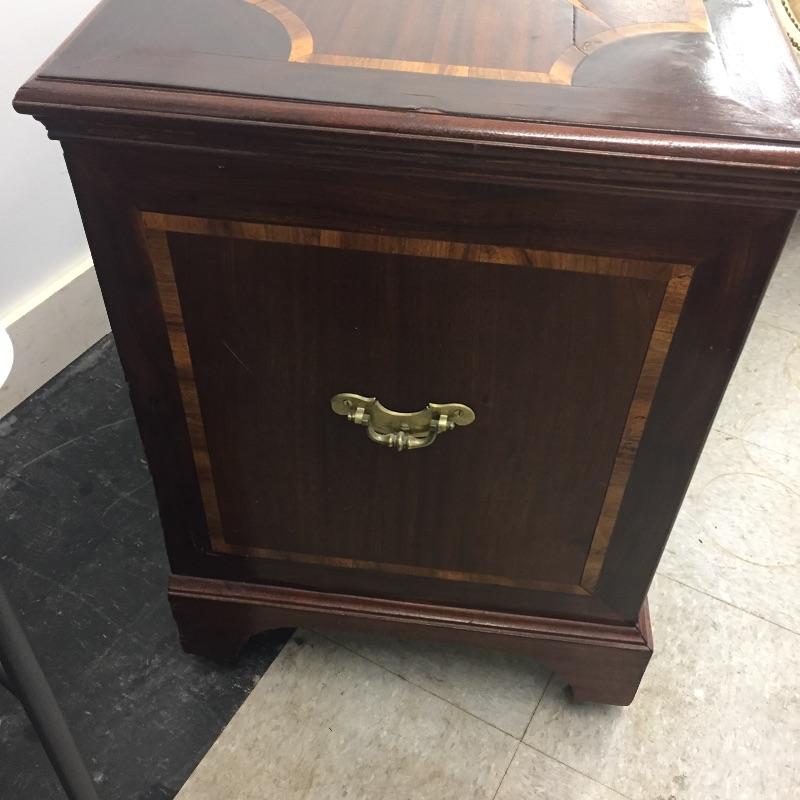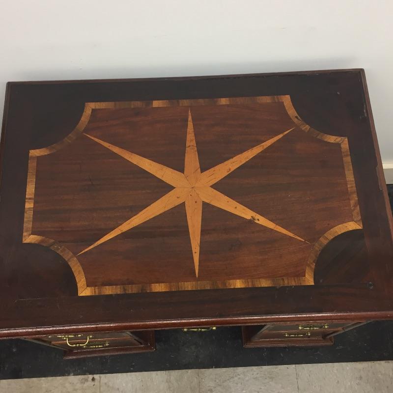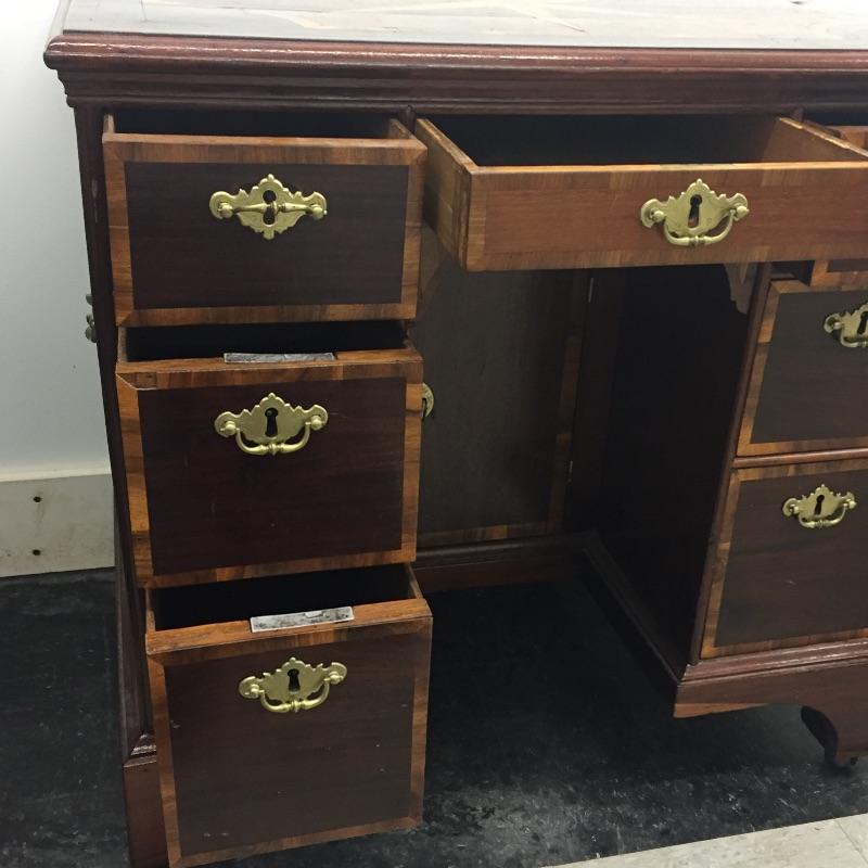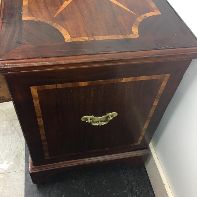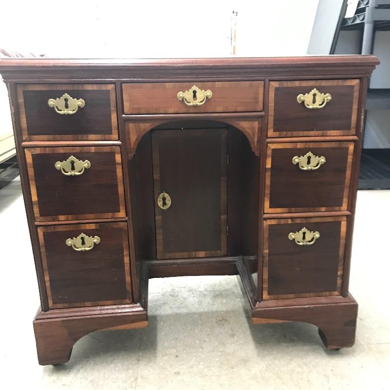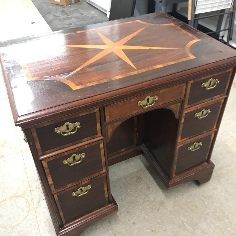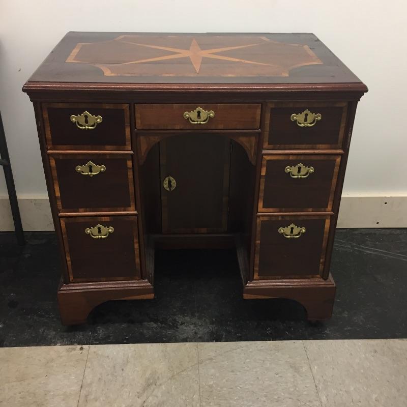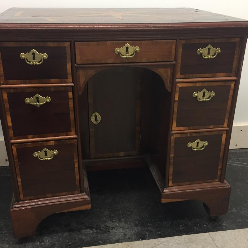 Handsome desk with inlaid designs, dovetail drawers with five locking drawers and one locking cabinet(all with one key). Brass hardware. A beautiful piece of furniture sure to enhance the beauty of any room. Desk has split on one side-See pictures. This is a small piece that would not fit a chair underneath. See measurements. Desk measures 21.5” x 31” x 29.5”.