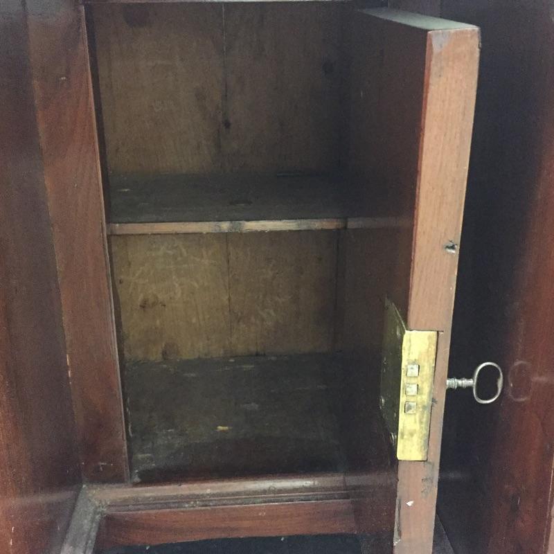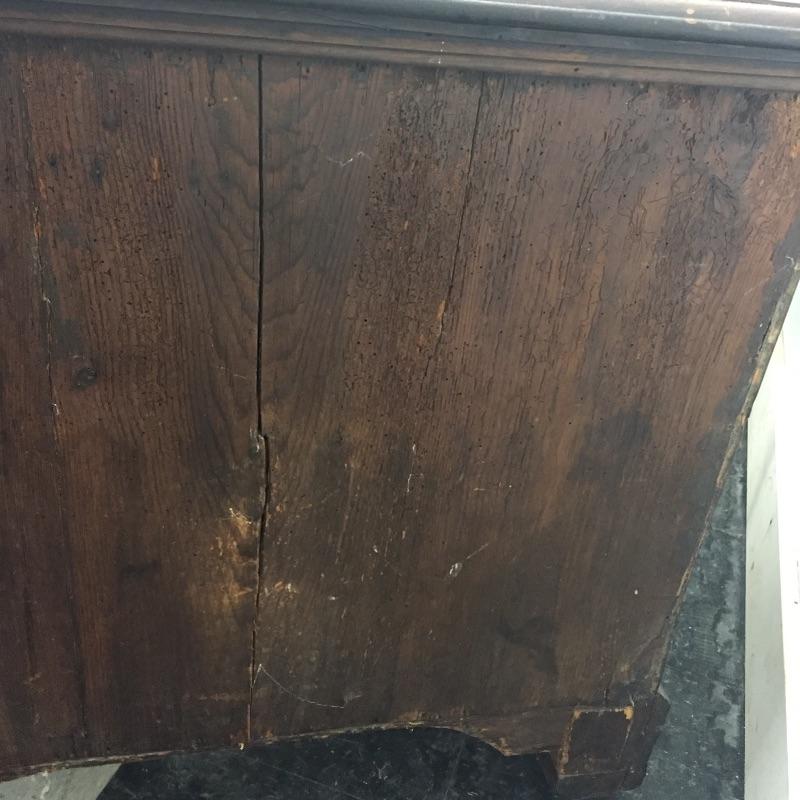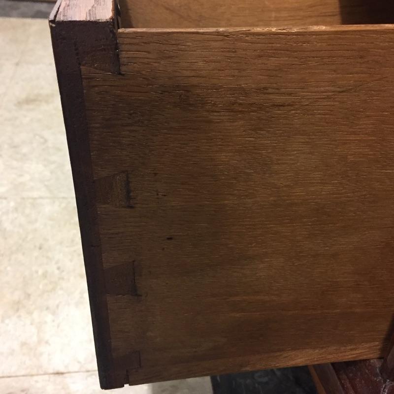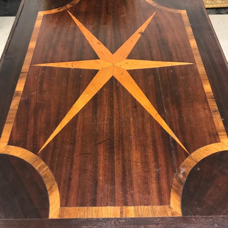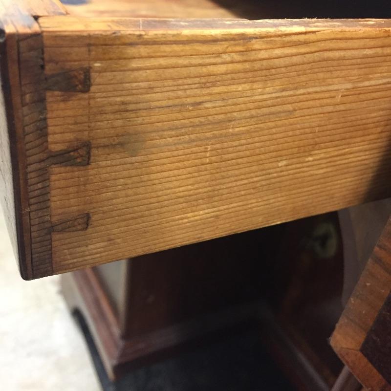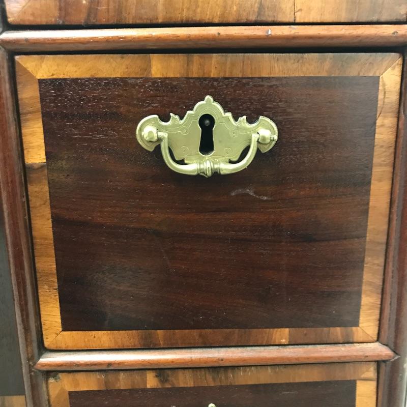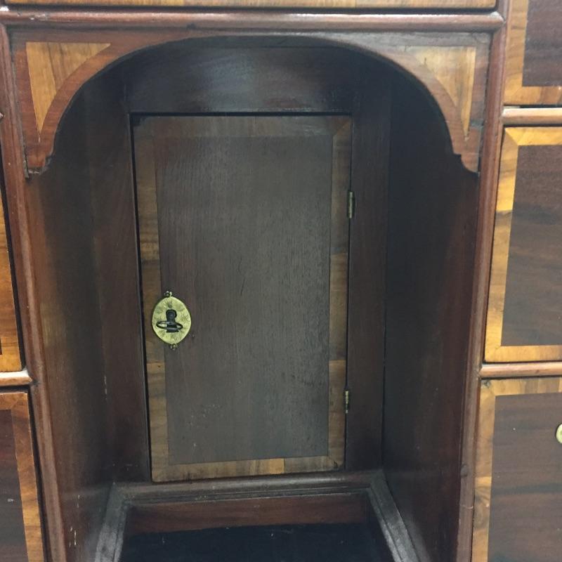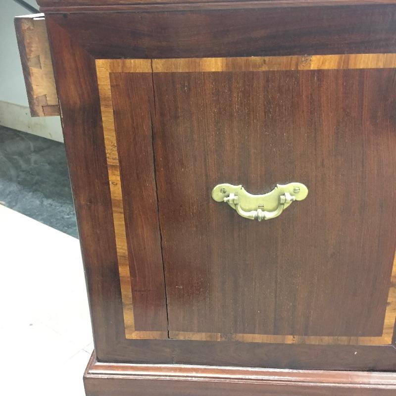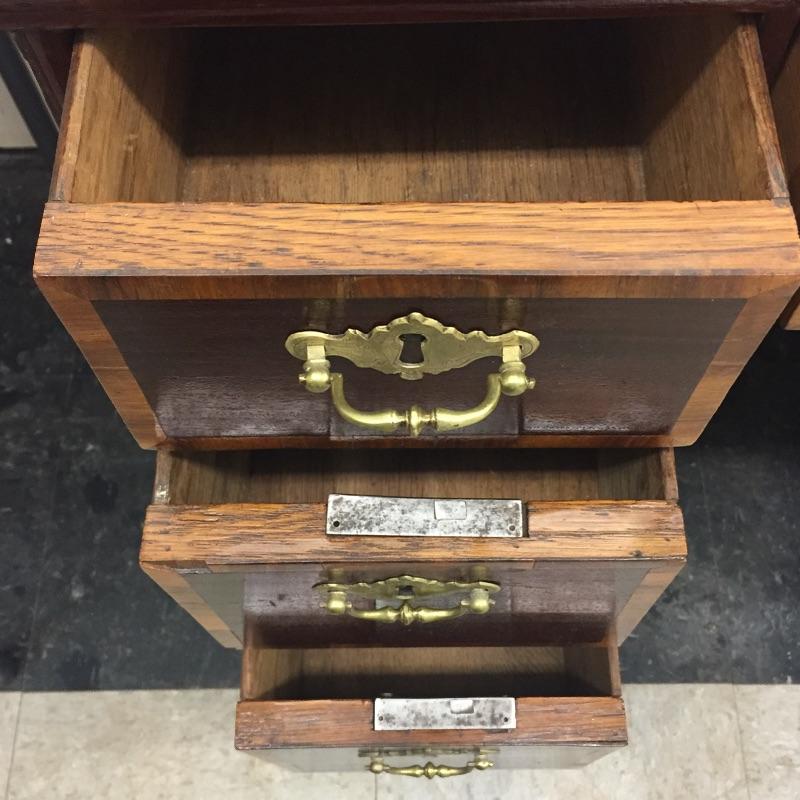 Handsome desk with inlaid designs, dovetail drawers with five locking drawers and one locking cabinet(all with one key). Brass hardware. A beautiful piece of furniture sure to enhance the beauty of any room. Desk has split on one side-See pictures. This is a small piece that would not fit a chair underneath. See measurements. Desk measures 21.5” x 31” x 29.5”.