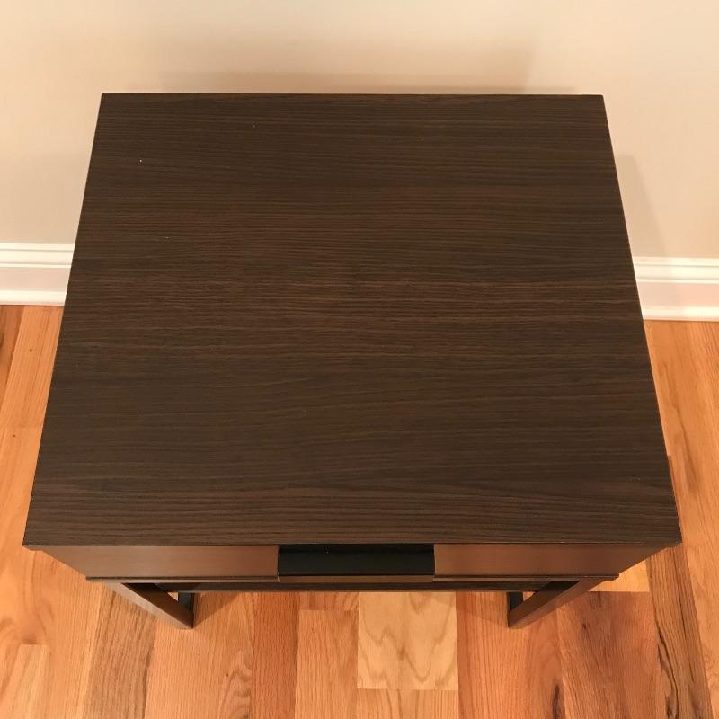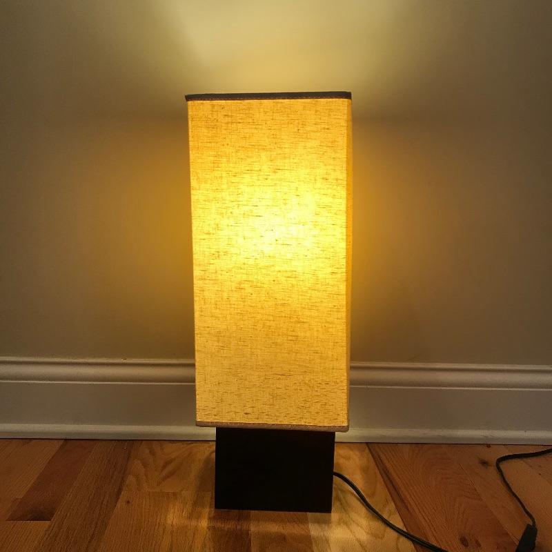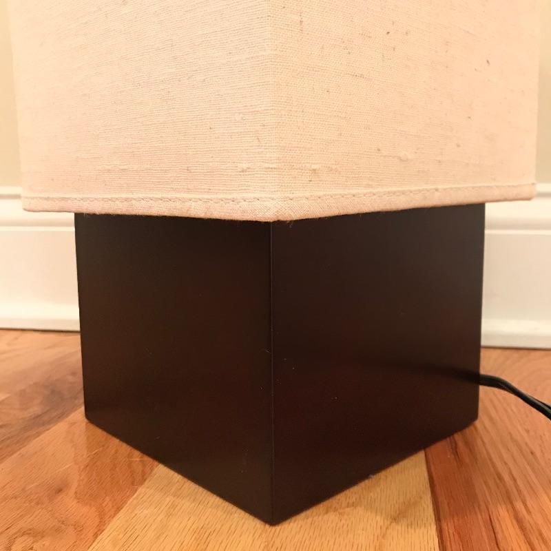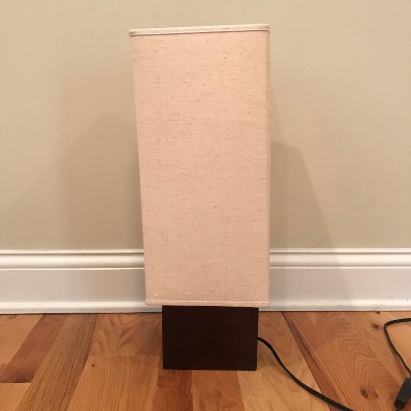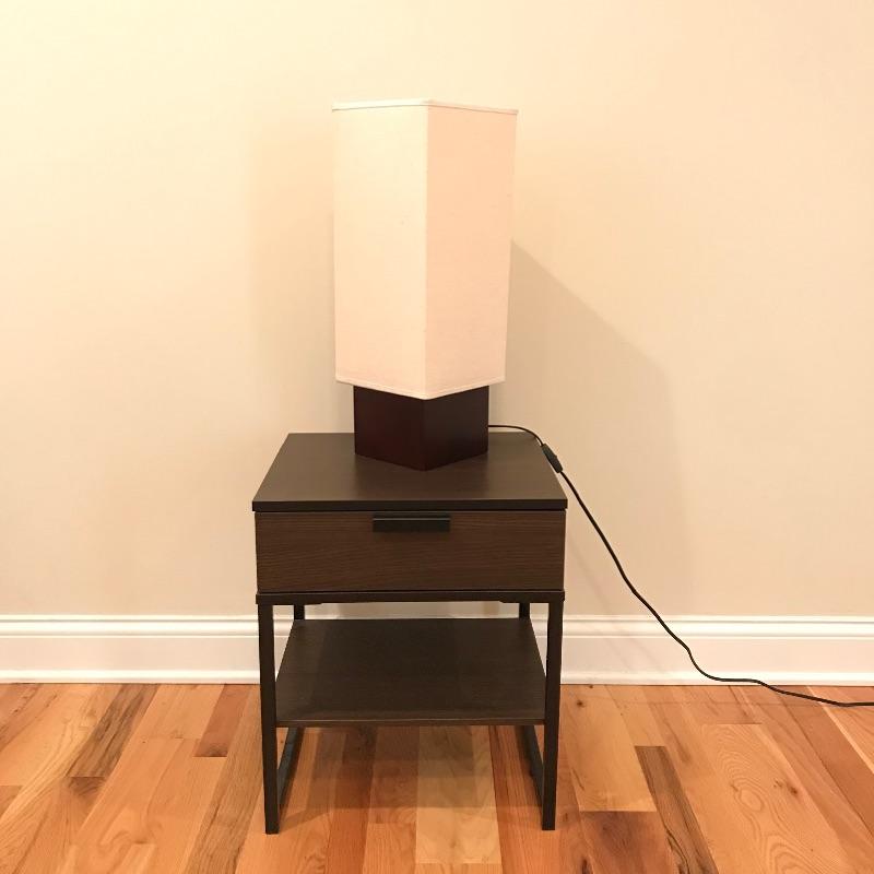Cool dark MCM style side table and lamp. Table appears to be dark wood laminate with a black metal pull. Drawer rolls out easily with metal rails. Table measures approximately 17.75” x 15.75” x 21.25”. Unique rectangle lamp accompanied table and the pair look great together. The lamp base is also darker wood with a reddish hue. The lamp has a modern cord and power switch. Lamp has an aftermarket removable Defiant dimmer socket and Phillips LED dimming bulb. Lamp measures approximately 6.5”sq x 22”. No shipping.