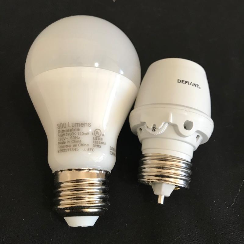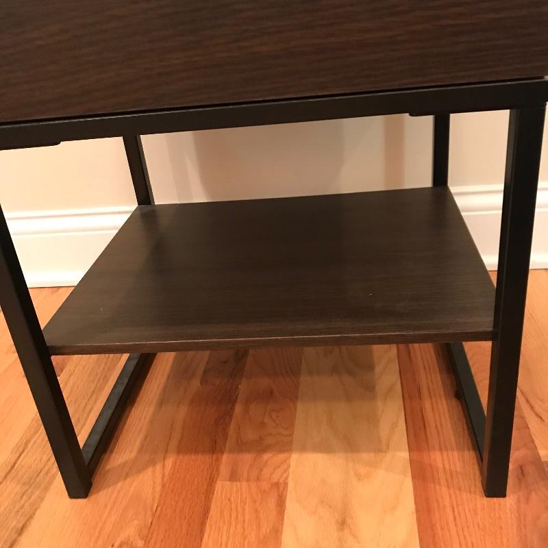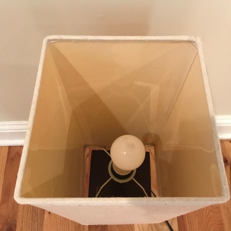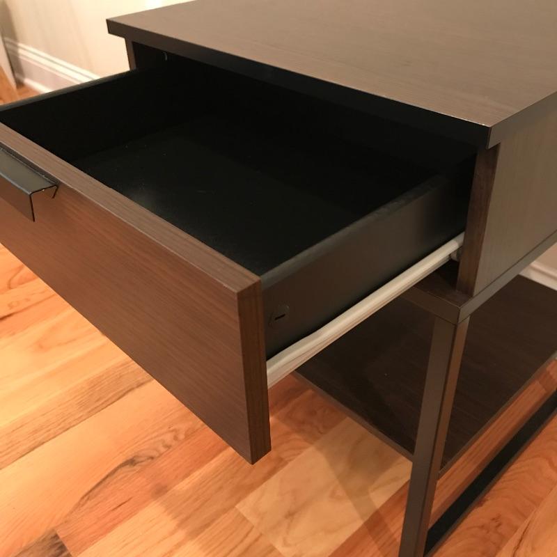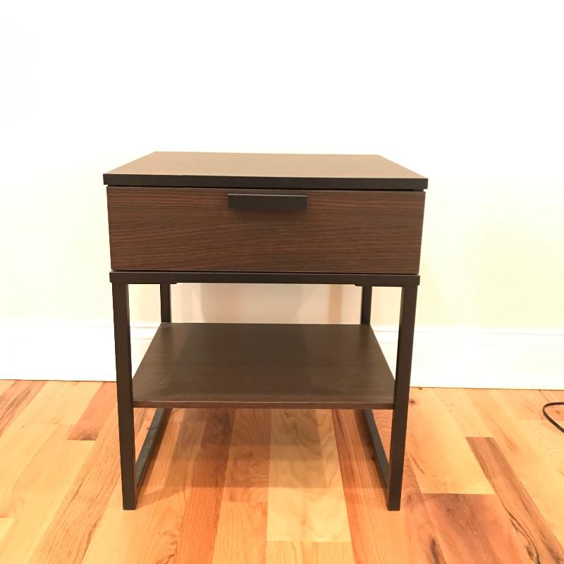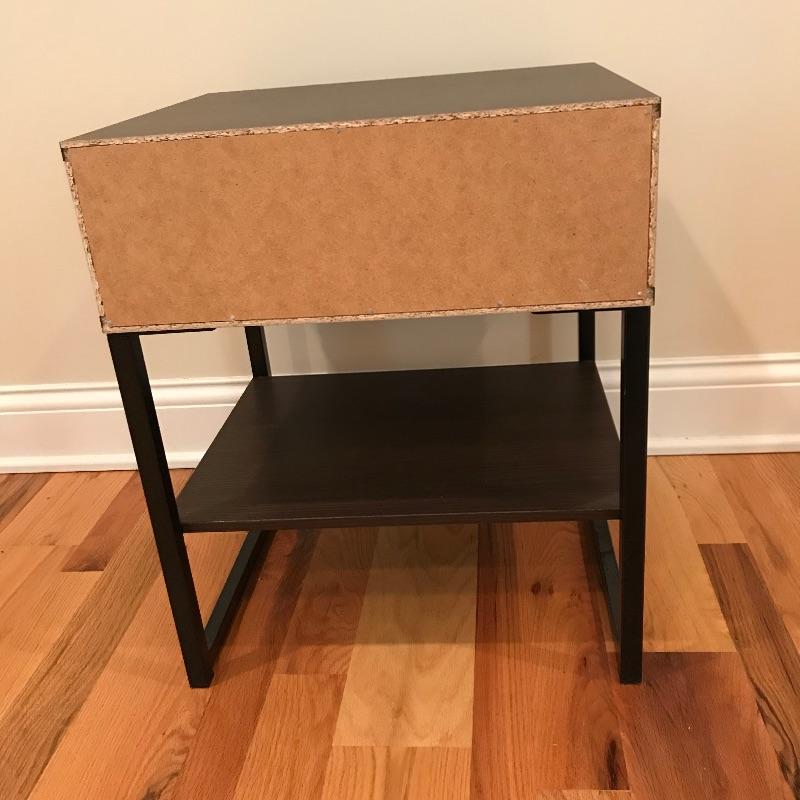 Cool dark MCM style side table and lamp. Table appears to be dark wood laminate with a black metal pull. Drawer rolls out easily with metal rails. Table measures approximately 17.75” x 15.75” x 21.25”. Unique rectangle lamp accompanied table and the pair look great together. The lamp base is also darker wood with a reddish hue. The lamp has a modern cord and power switch. Lamp has an aftermarket removable Defiant dimmer socket and Phillips LED dimming bulb. Lamp measures approximately 6.5”sq x 22”. No shipping.