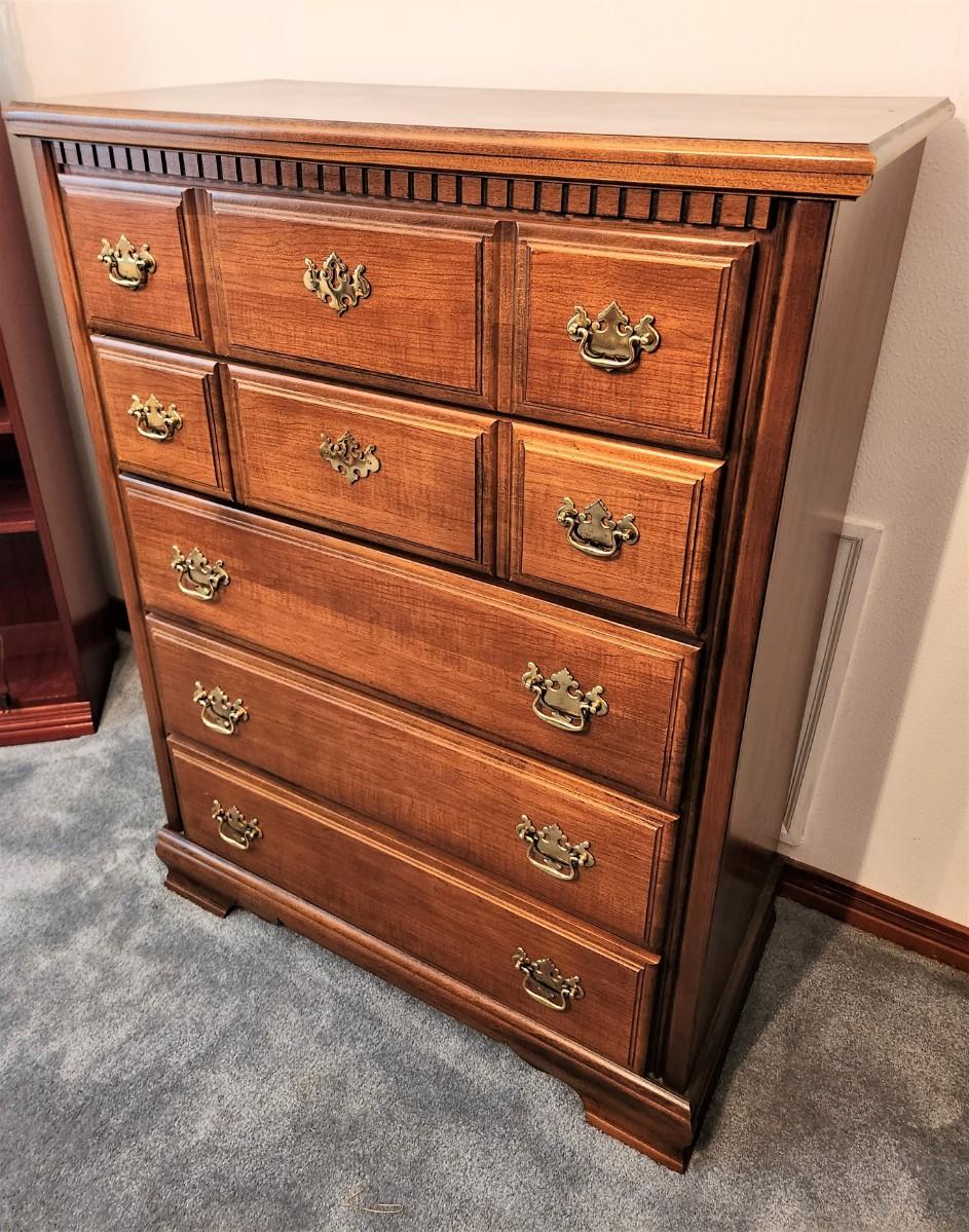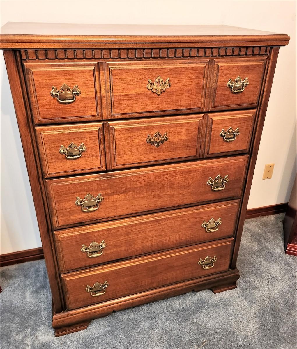 Nice oak finish chest of drawers, 5 drawers. No maker noted. 36" across, 18" deep, 48" tall. Great condition - clean. Note: this item is upstairs so you will need to be prepared to move it.