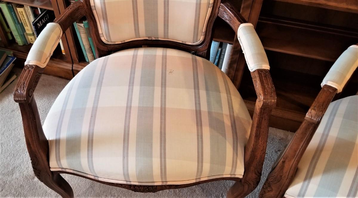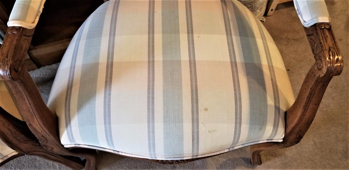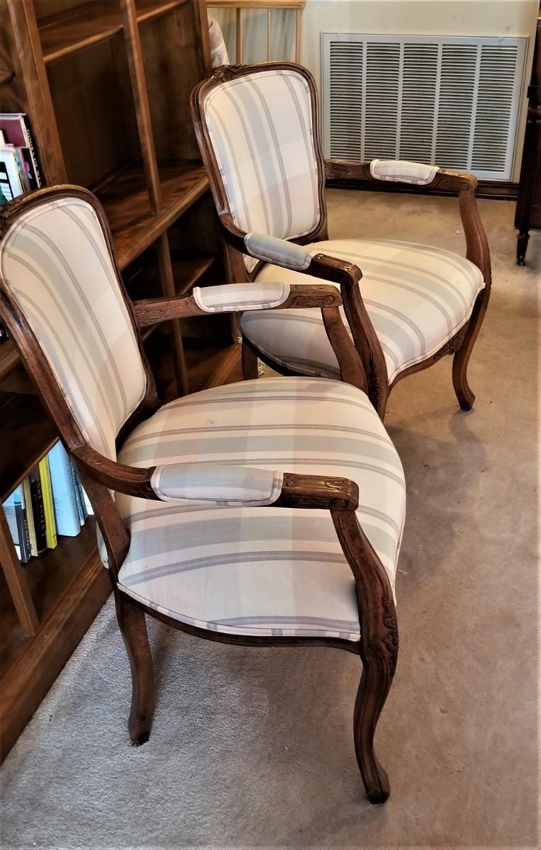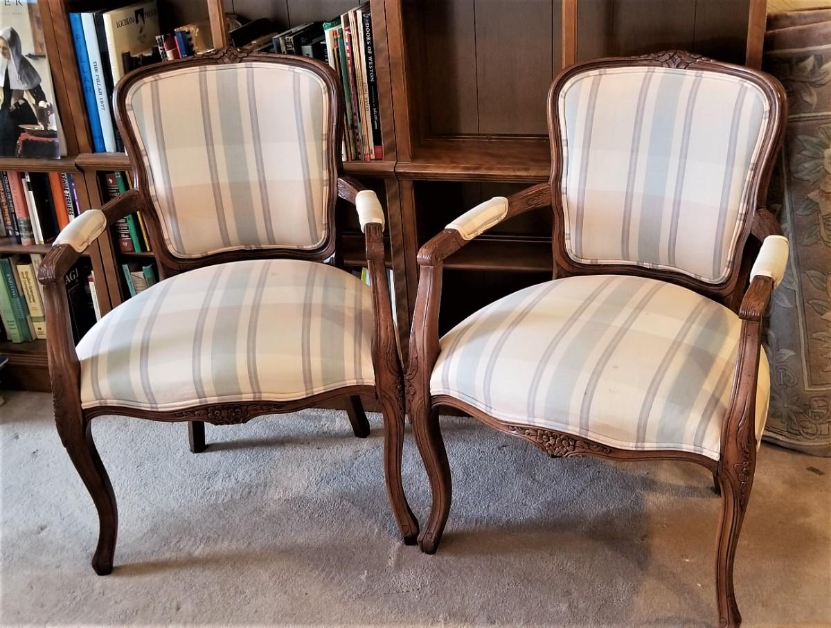 Nice pair of French-style fauteuil armchairs by the Chair Craft Company. Sturdy and comfortable. Each measures 35" tall, 24" across. Seats have a few small spots and could use a clean.