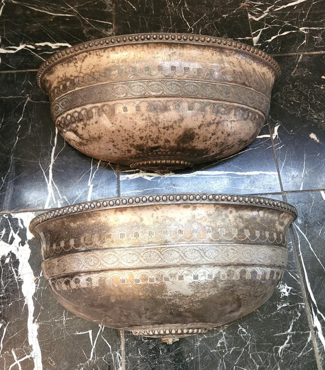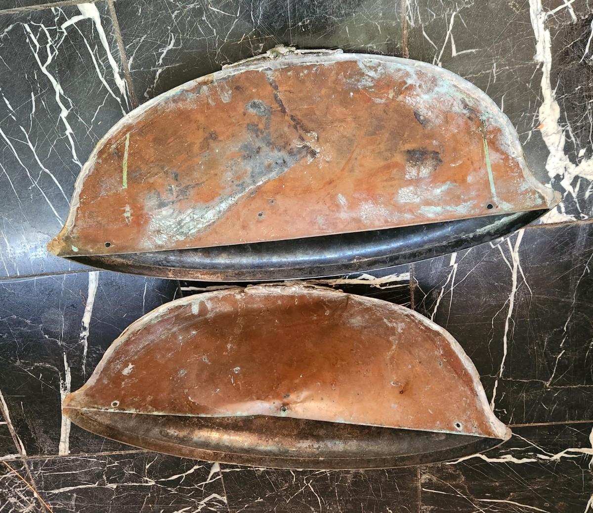 Vintage pair of silvered garden planters - wall/fence mounted. Demi-lune. Back looks like copper. They have metal liners. Used condition, but a great shabby chic look.8" tall, 18.5" across.