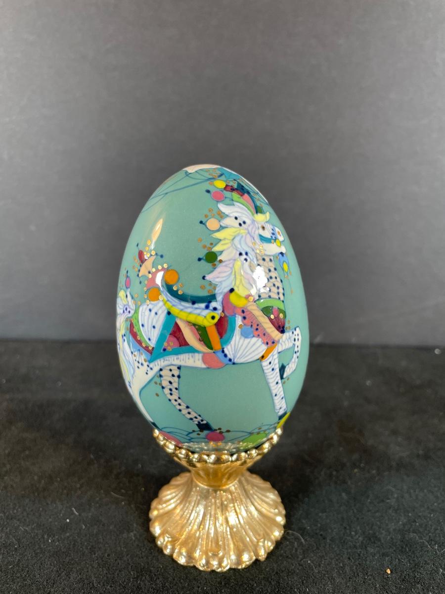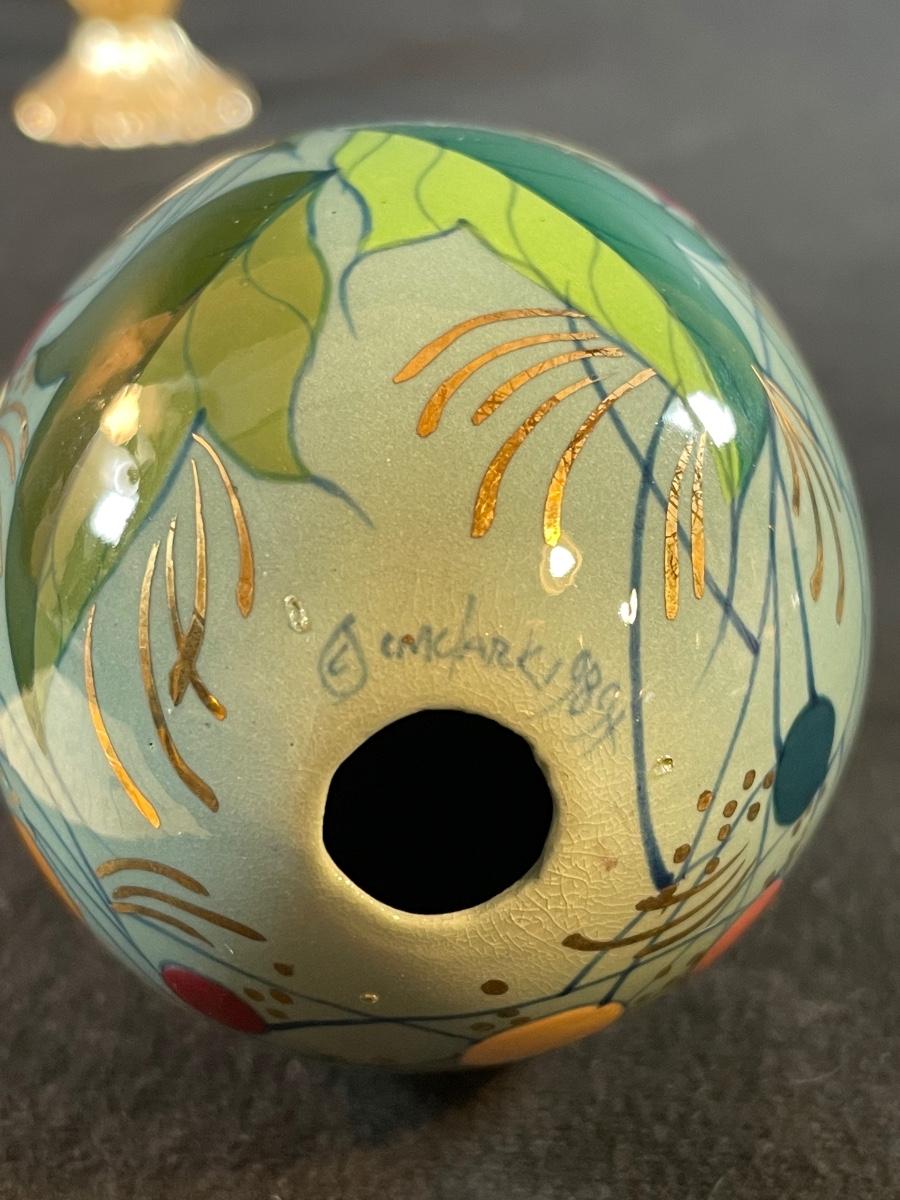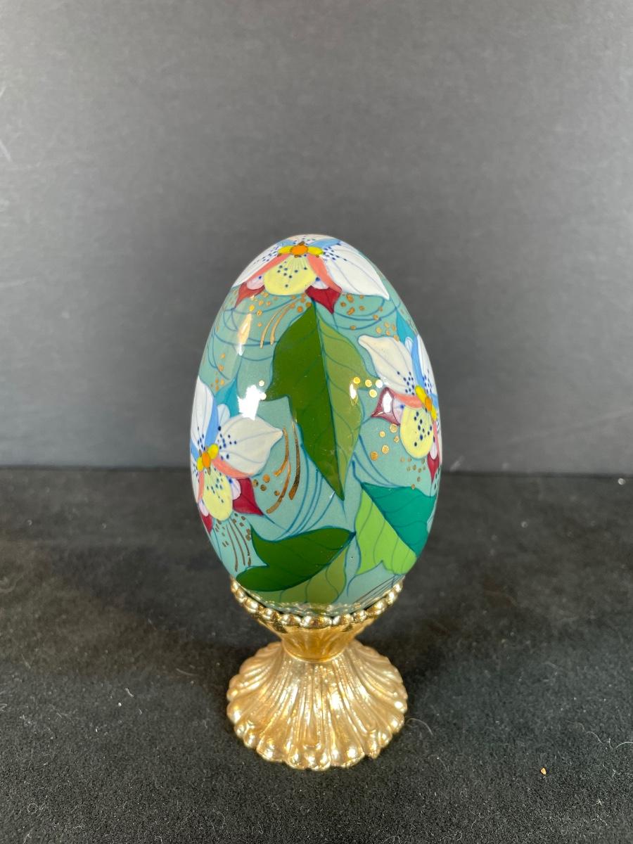 3" tall. Hand-painted on gold-tone stand. by E.M. Clark. 1989