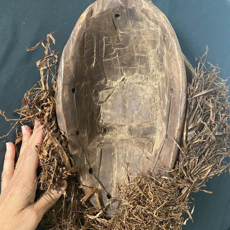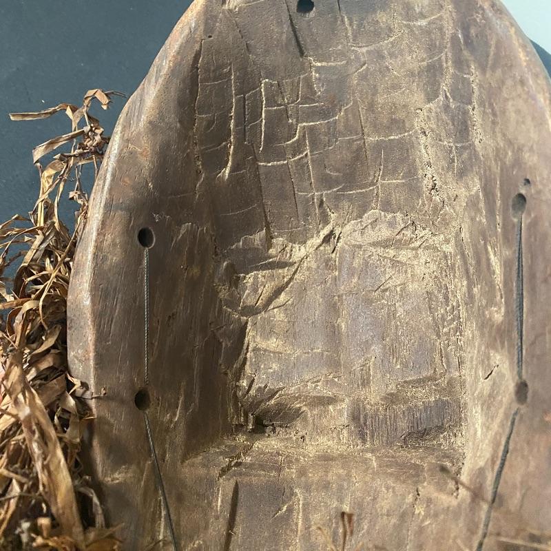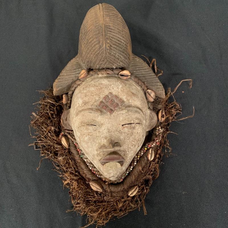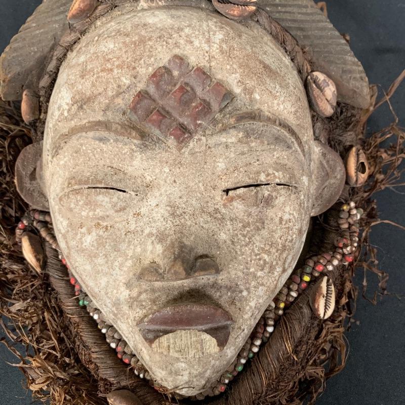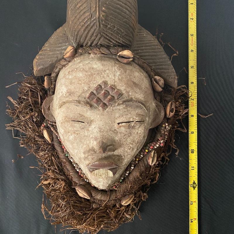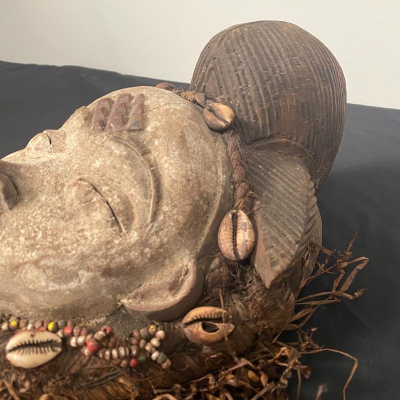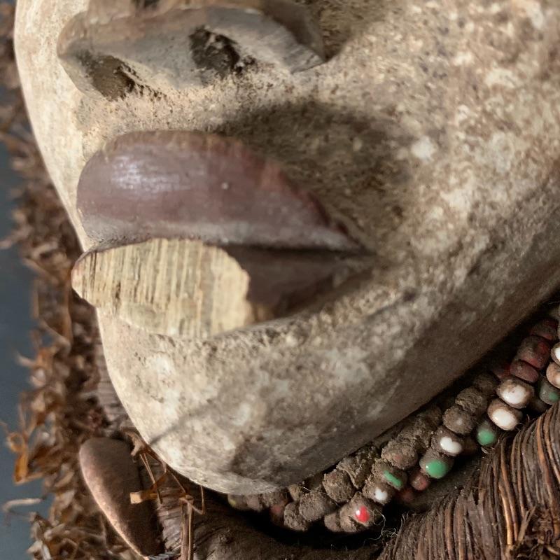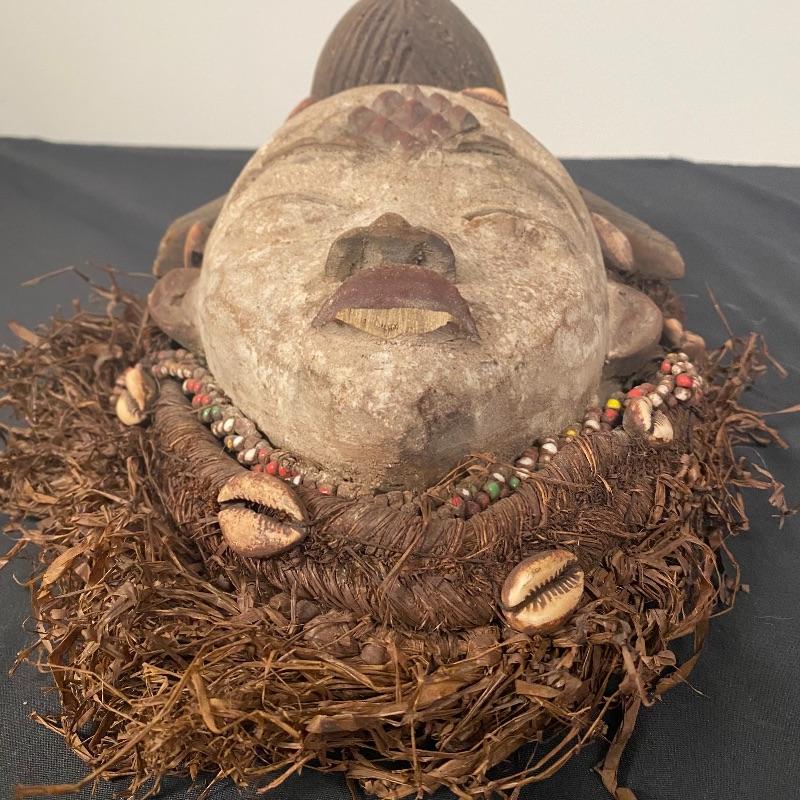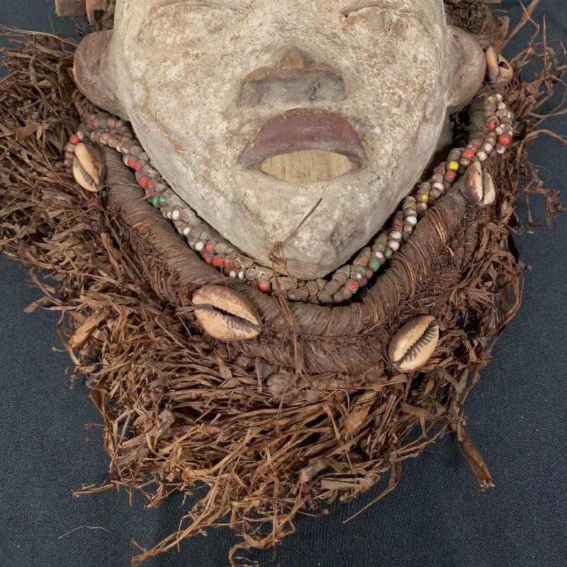 This lot includes one African mask with shells and a rope-like beard. The mask is made out of wood and has a beard that is decorated with rope and shells. There is a chip on the lip of the mask (see pictures for details). It measures about 14in x 8in. Shipping available.