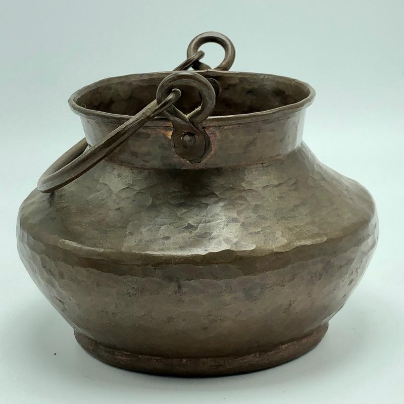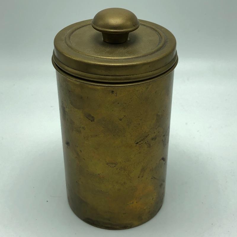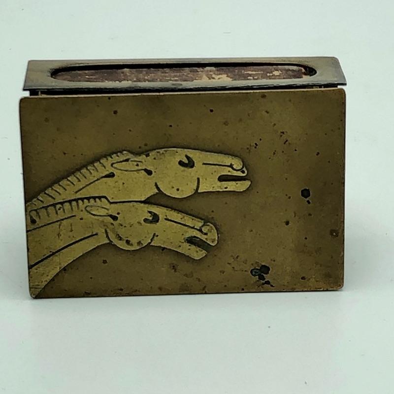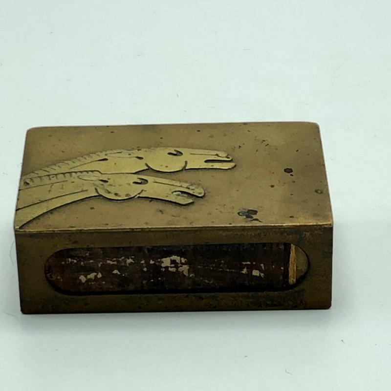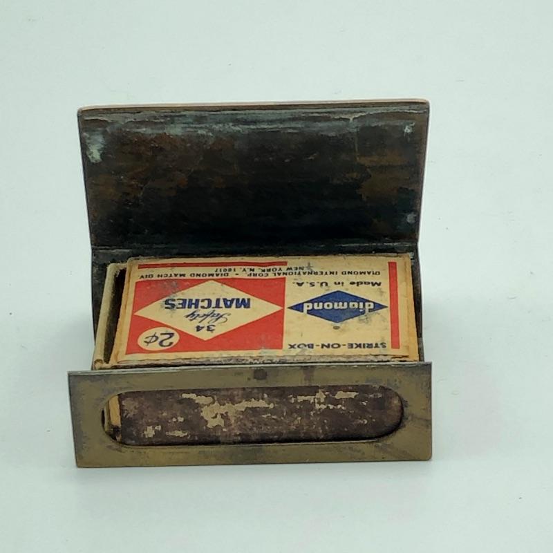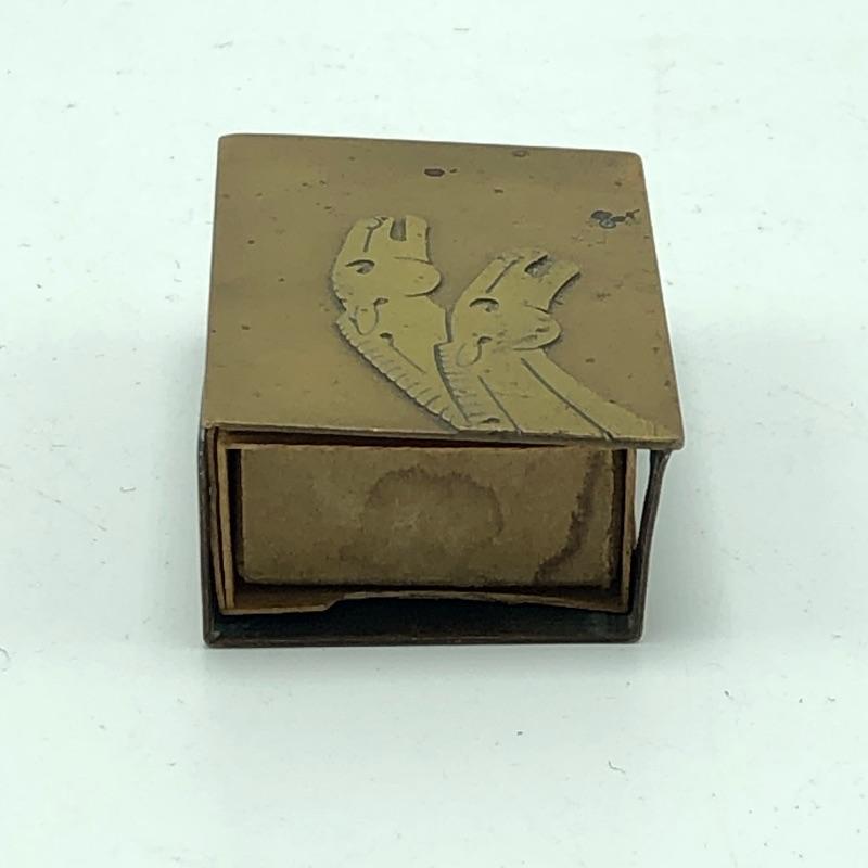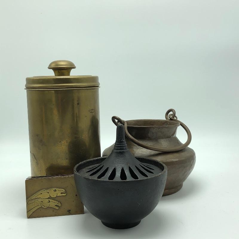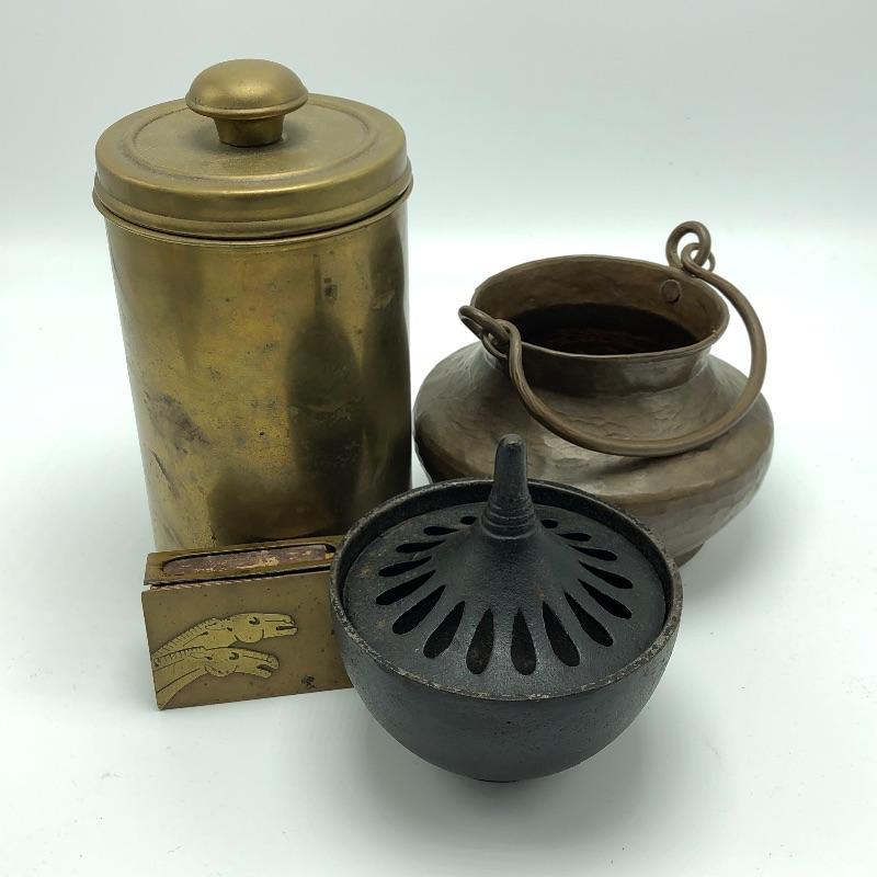 Assortment of metal items with Small copper kettle, brass tobacco humidor w/glass sleeve, heavy metal Incense burner, and decorative matchbox cover by Heinz.