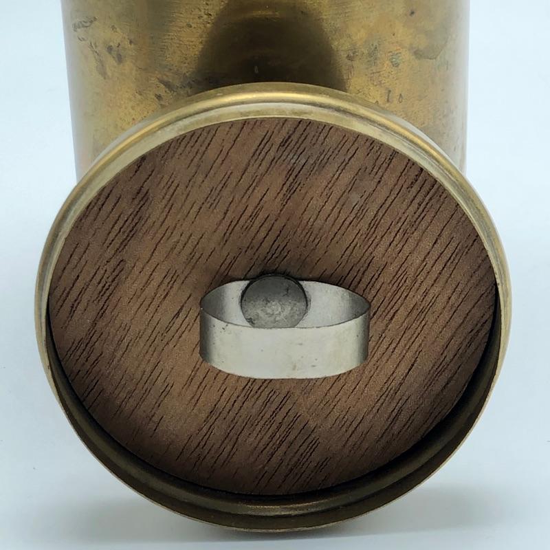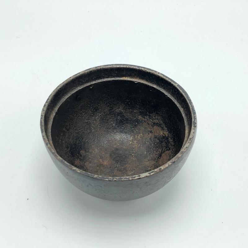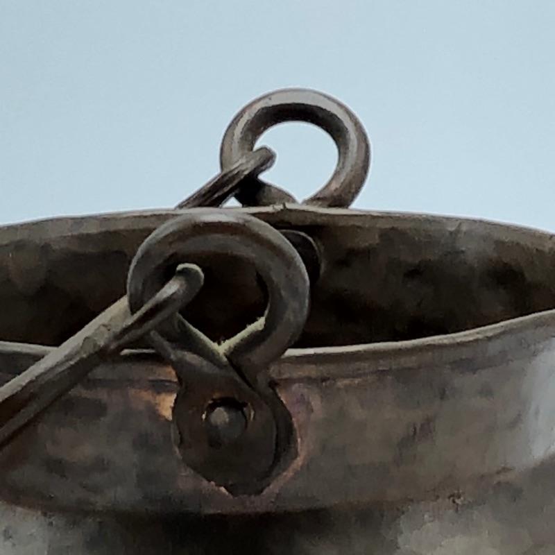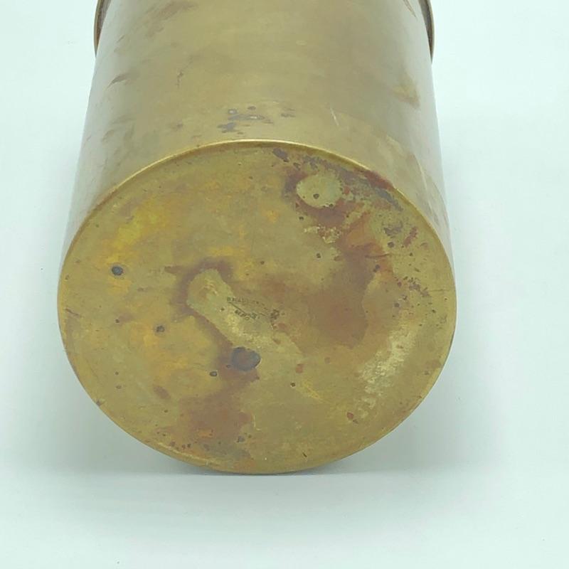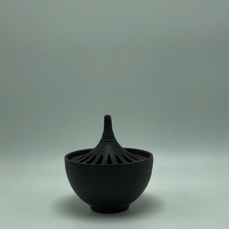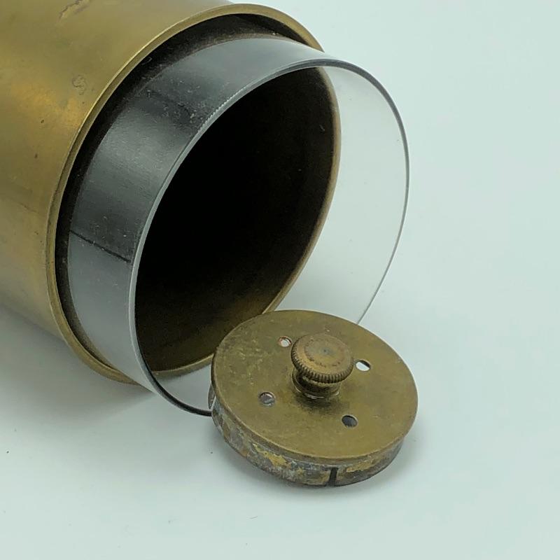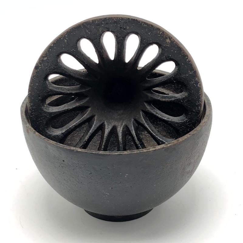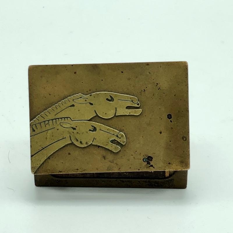 Assortment of metal items with Small copper kettle, brass tobacco humidor w/glass sleeve, heavy metal Incense burner, and decorative matchbox cover by Heinz.