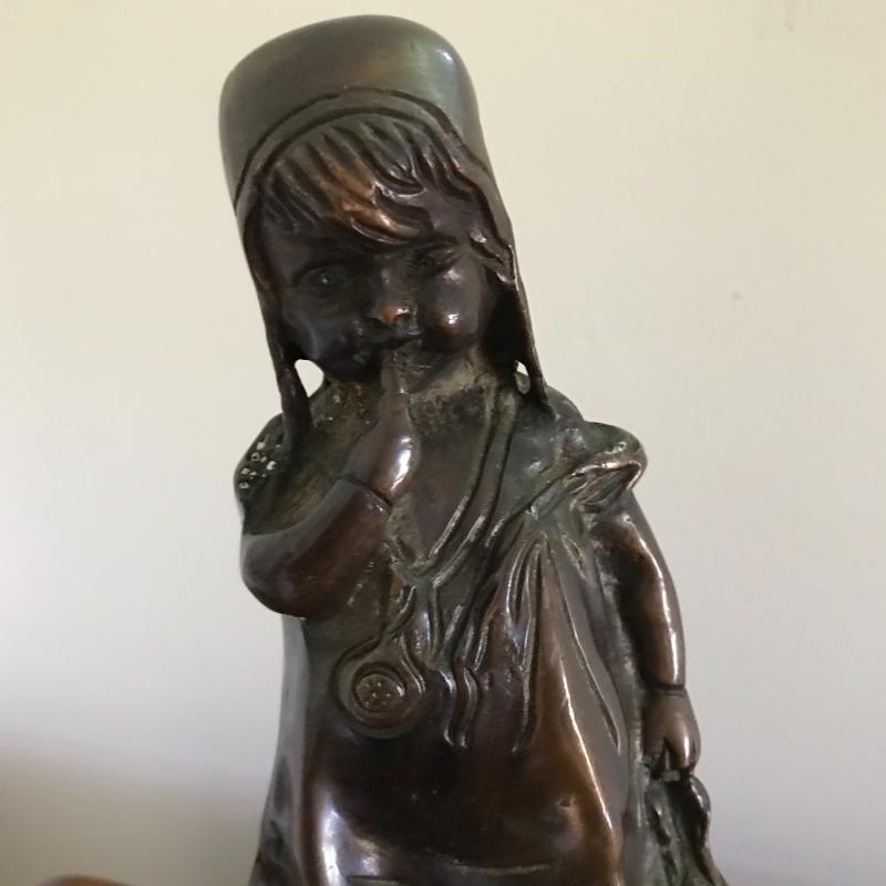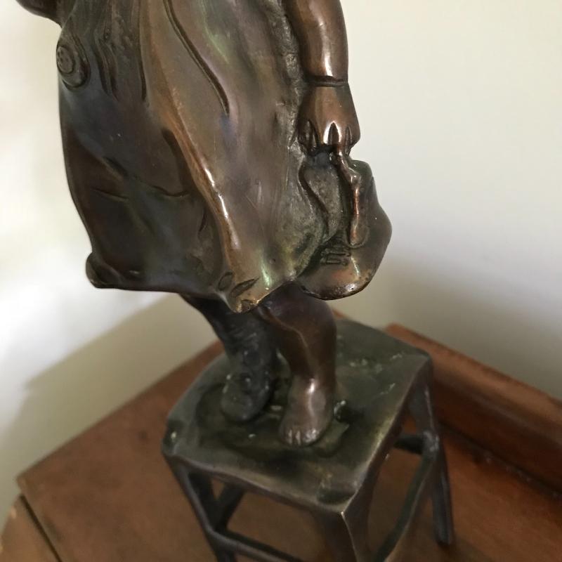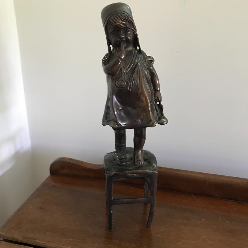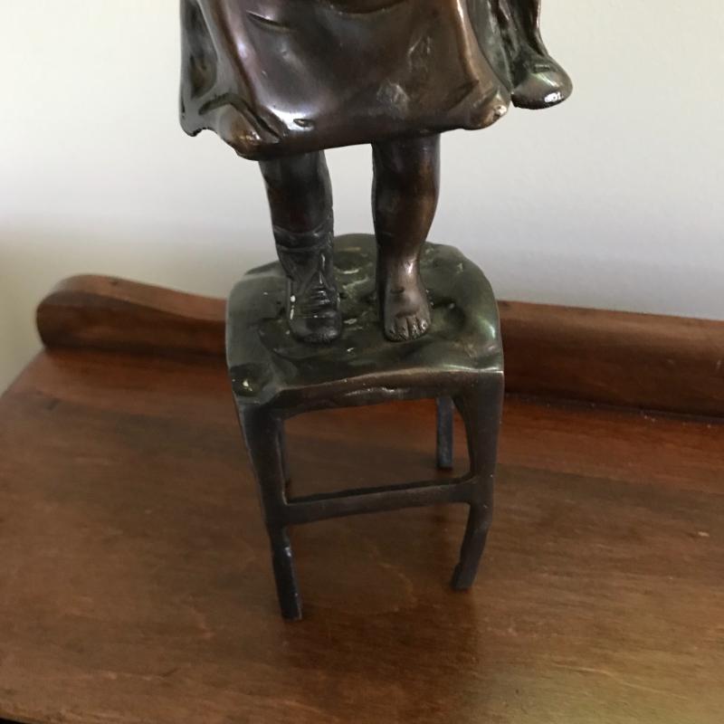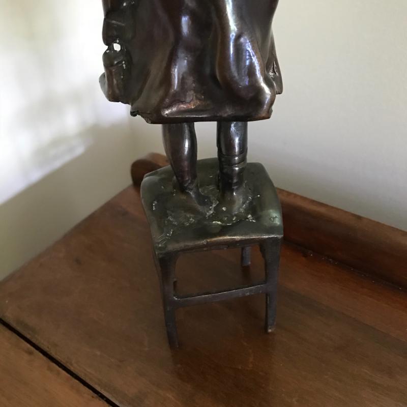 Adorable statue of girl on a stool is heavy and made of unknown metal. No markings found. Approx. 11.5” tall. Shipping available or local pickup in Arden, NC.