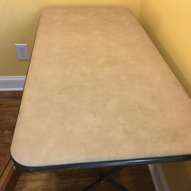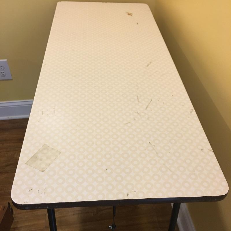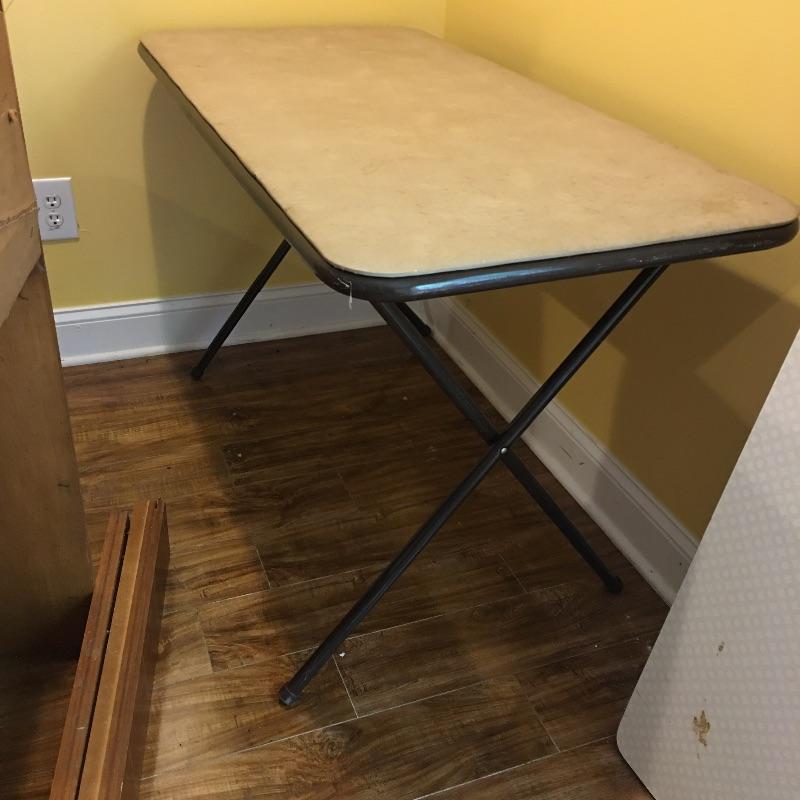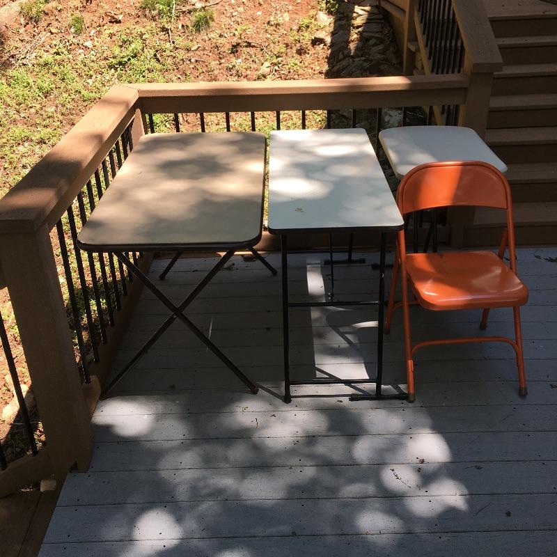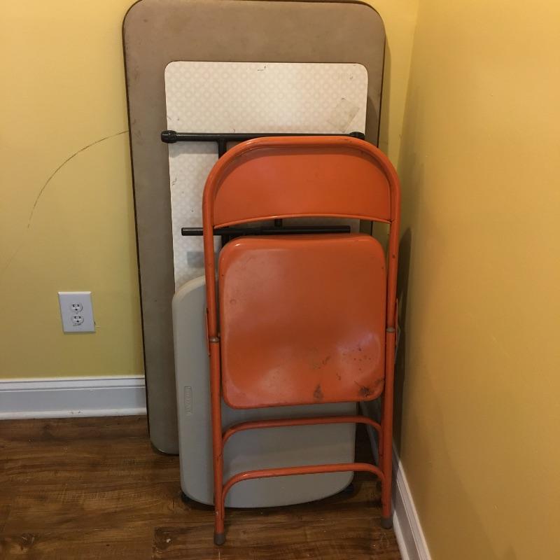 Be ready for any eventuality with this trio of folding tables that includes one with padded top, one with linoleum top and a plastic table. Also includes orange metal folding chair. Largest table measures 24” x 48” x 28.5”.