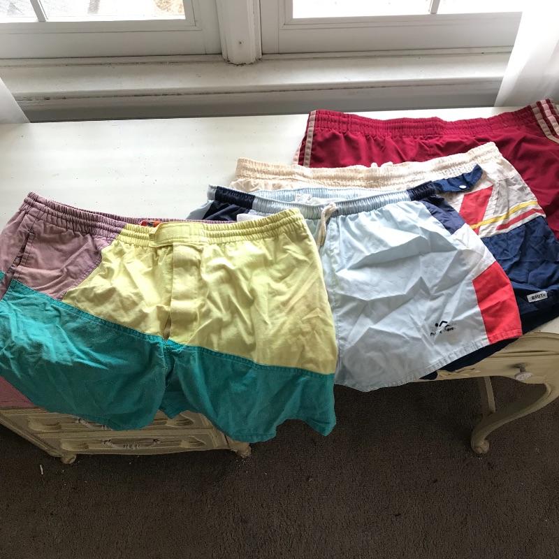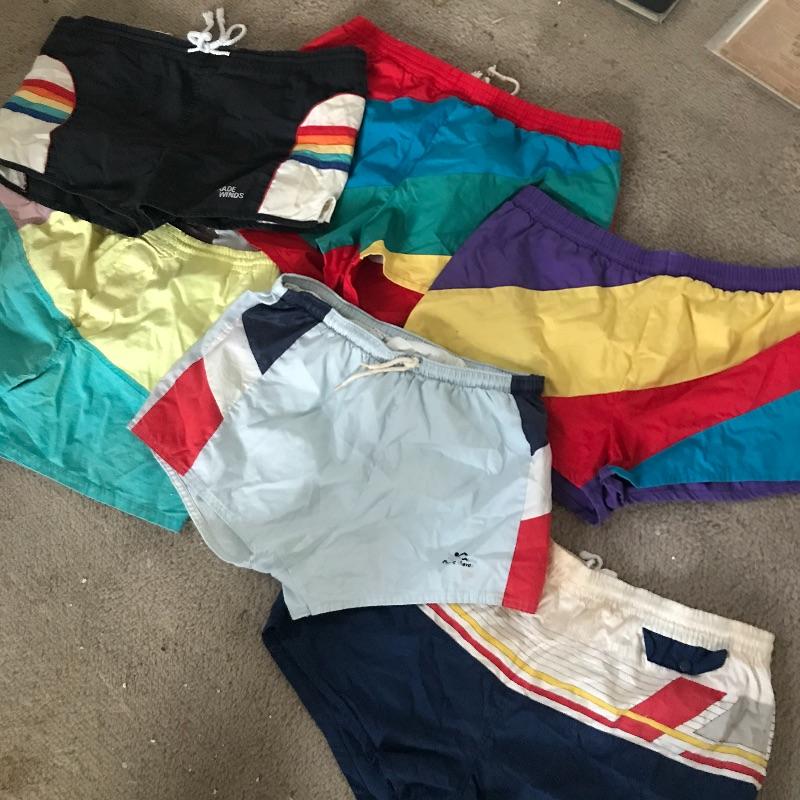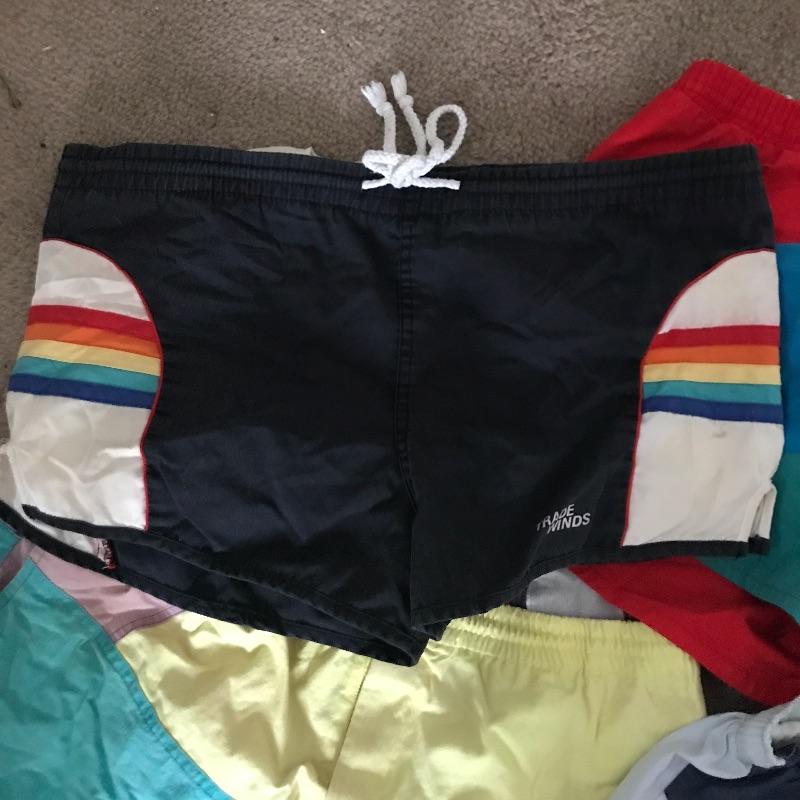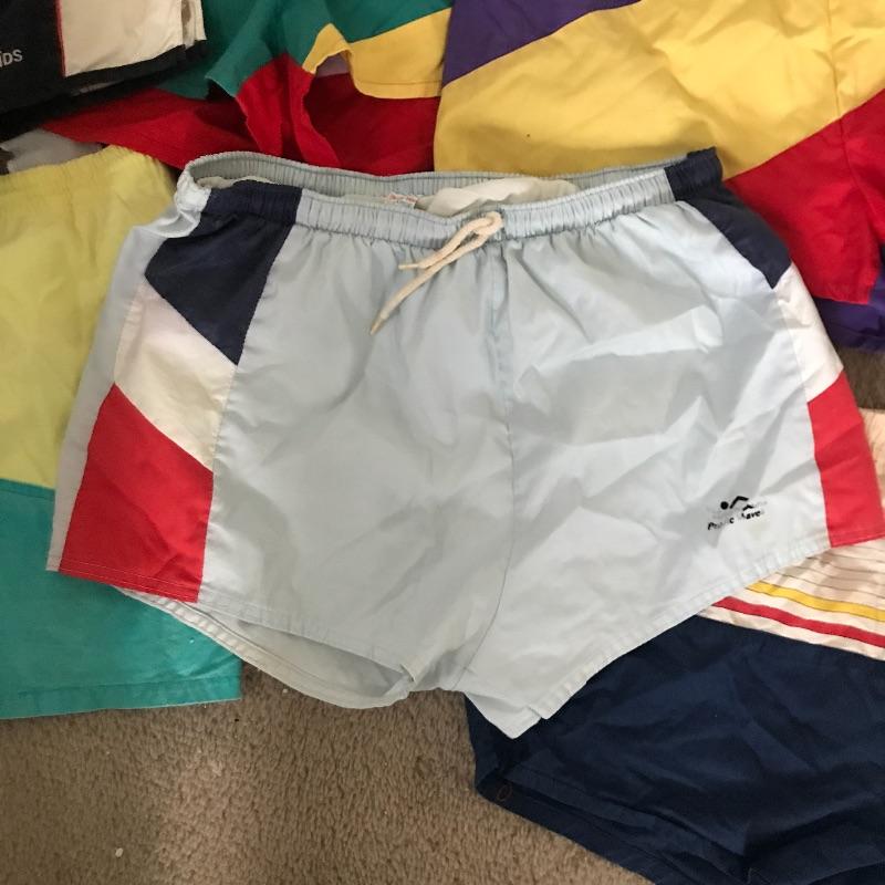 You have to love these colorful men’s swim trunks/Running Shorts! Several men’s sport shorts by Brut, Pacific Waves and Trade Winds in mostly size large. Also includes a Sony Walkman (appears to be in working order but has not been tested.) and Vintage Long Island Marathon T shirt. Shipping available.