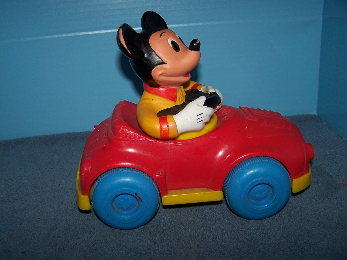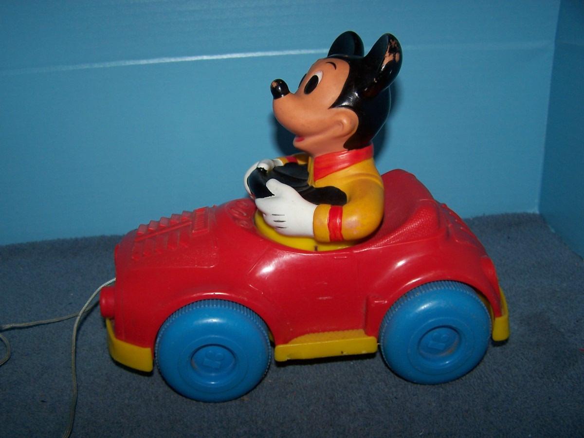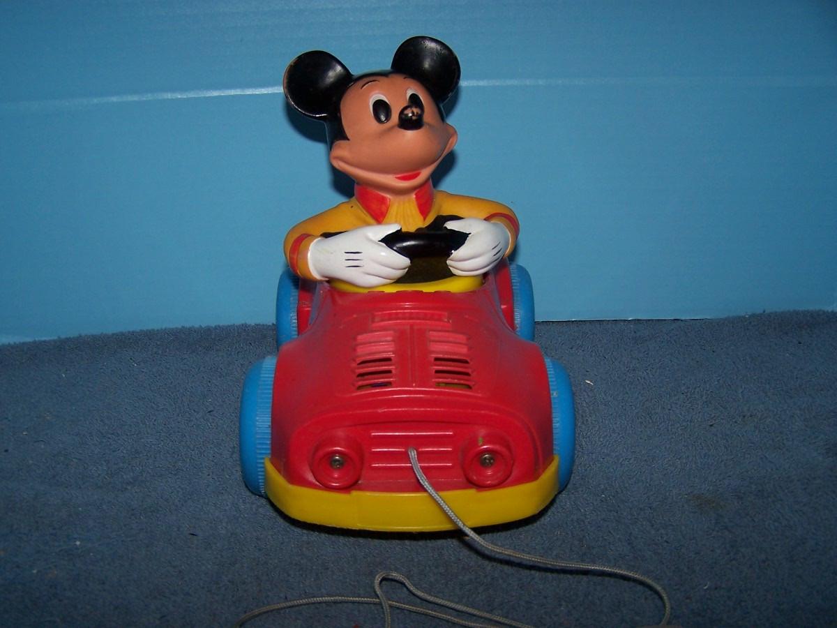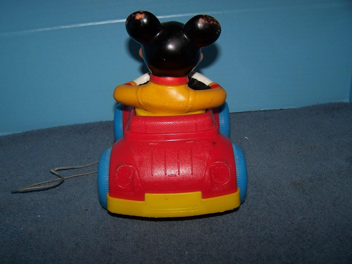 THIS IS A WONDERFUL 1973 KOHNER DISNEY MICKEY MOUSE CAR PULL TOY! 10'' LONG.. LIGHT WEAR/SPOTS/RUBS...
