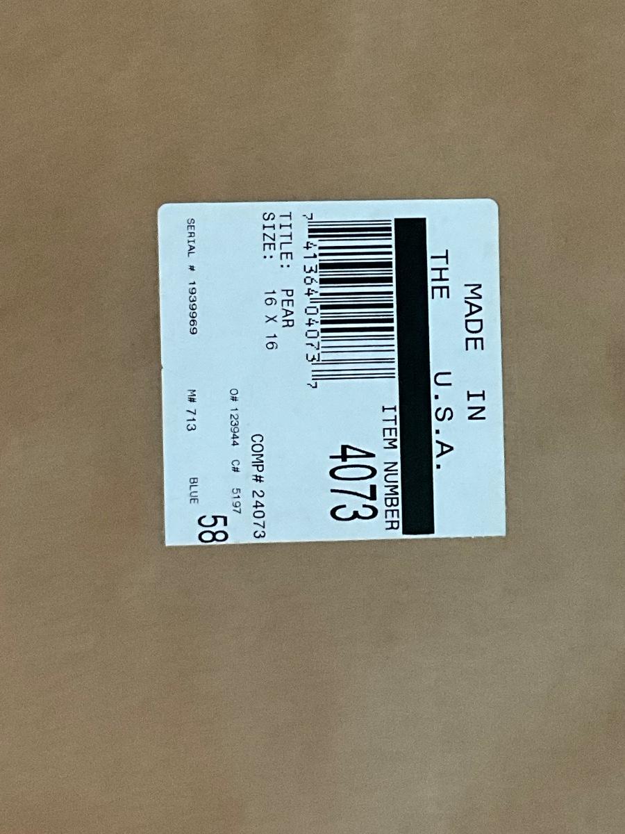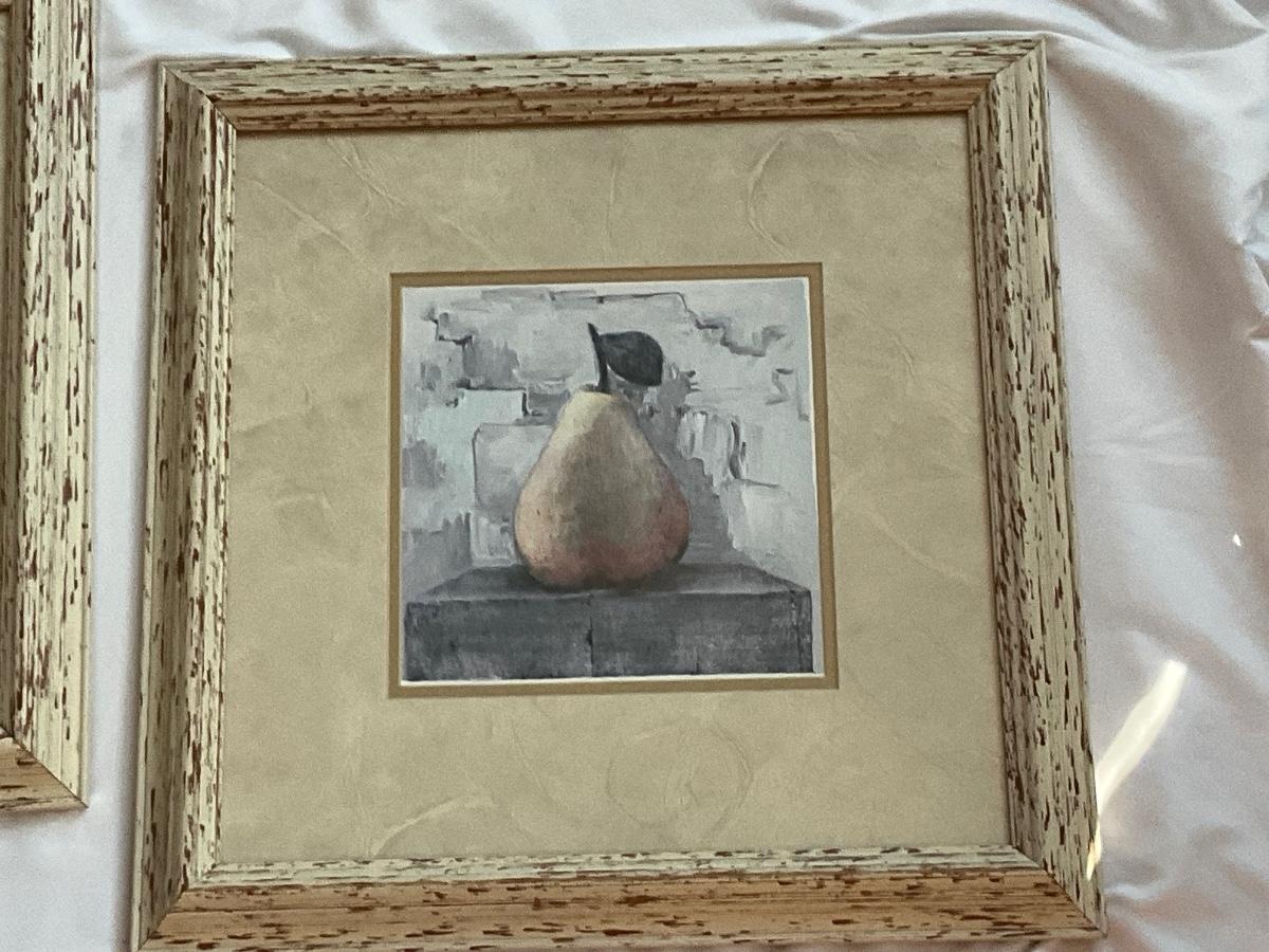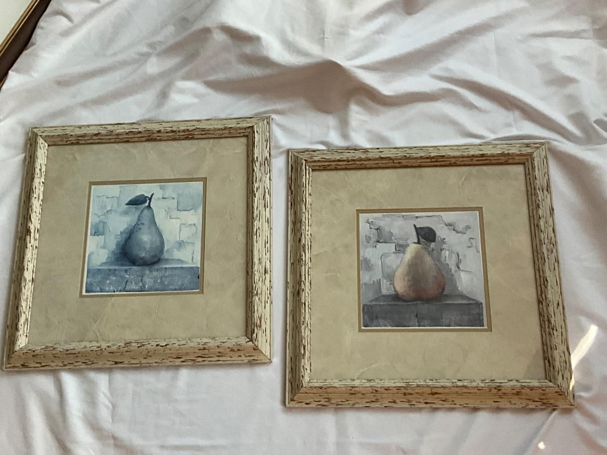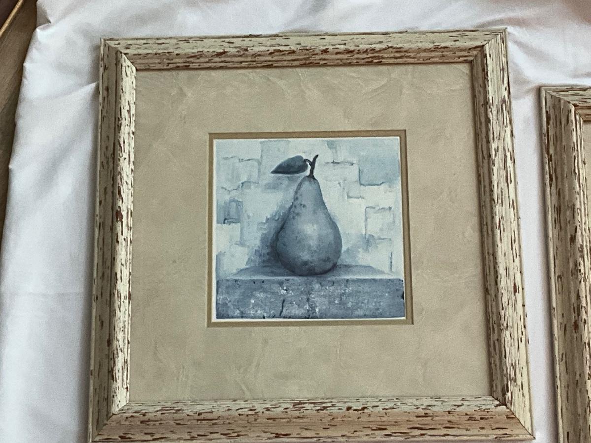 Pair of framed Pear prints. One is color and one is blue and white. Both measure 16 inches by 16 inches