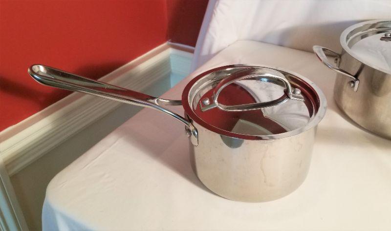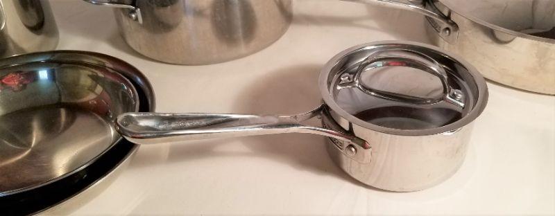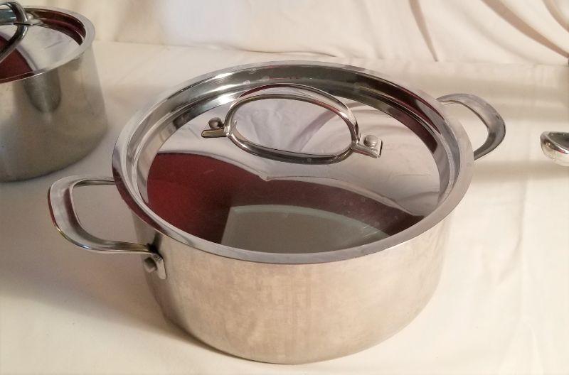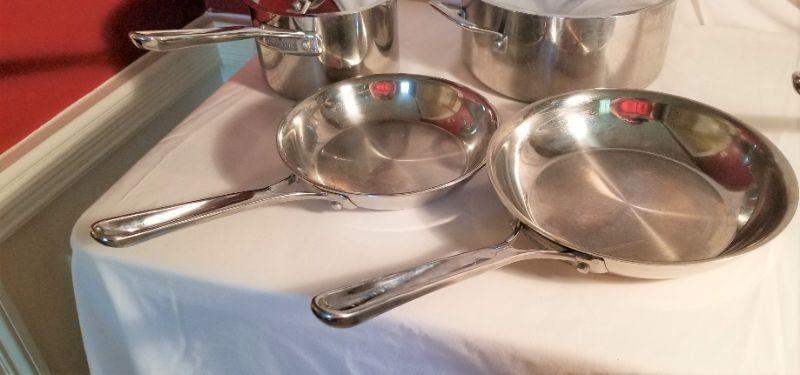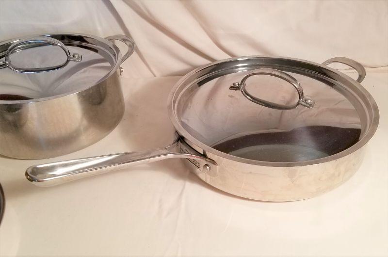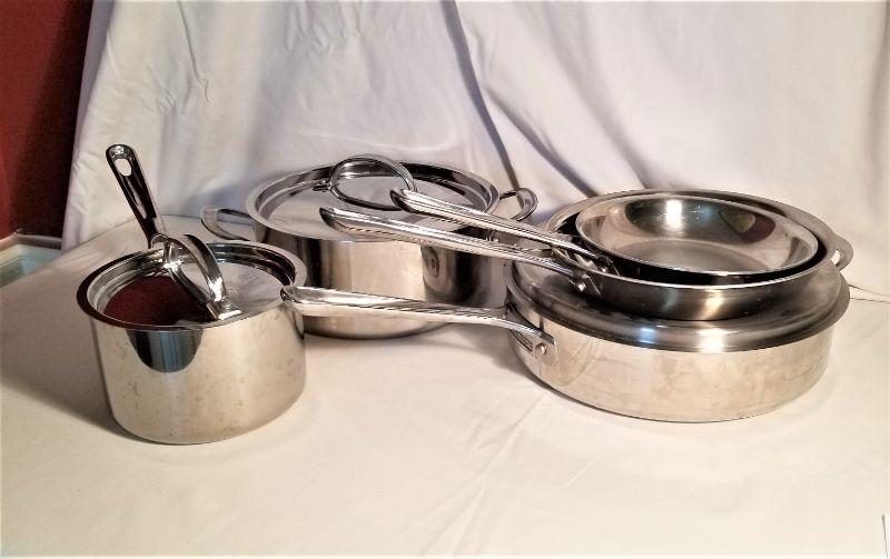 10 pc set of Technique Cookware - gently used. 3 skillets (one with lid) and 3 saucepans with lids. Largest frying pan is 12" across.