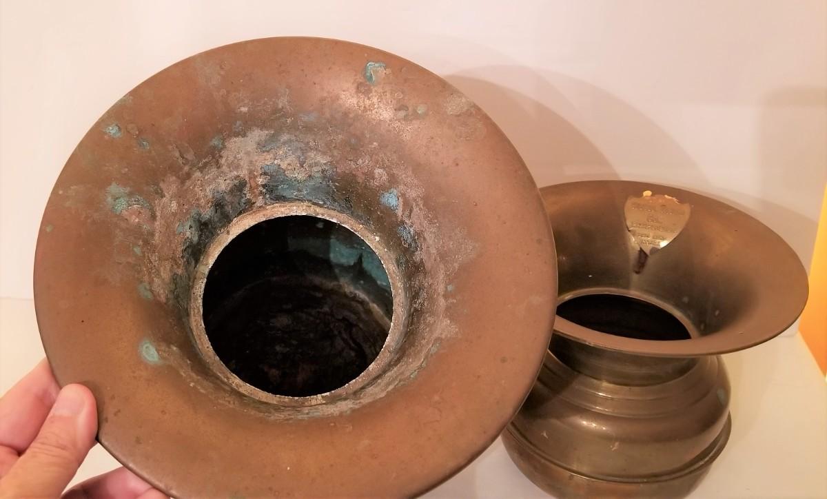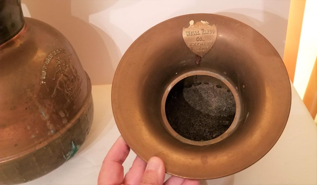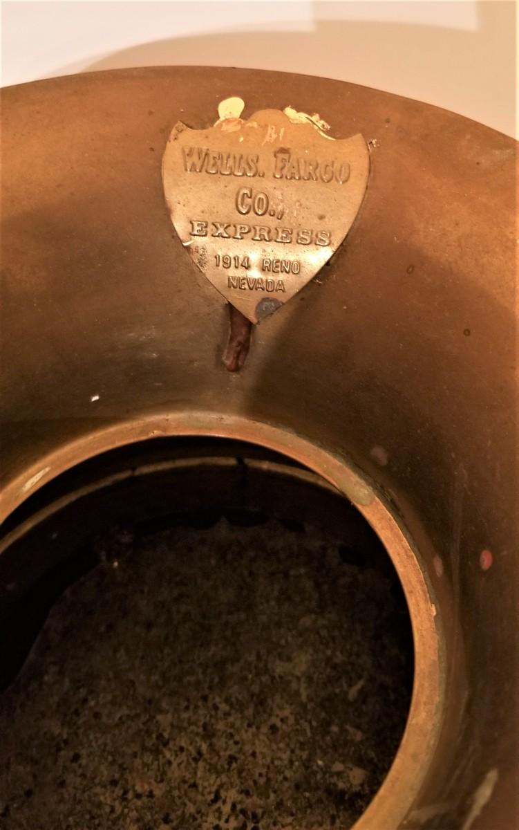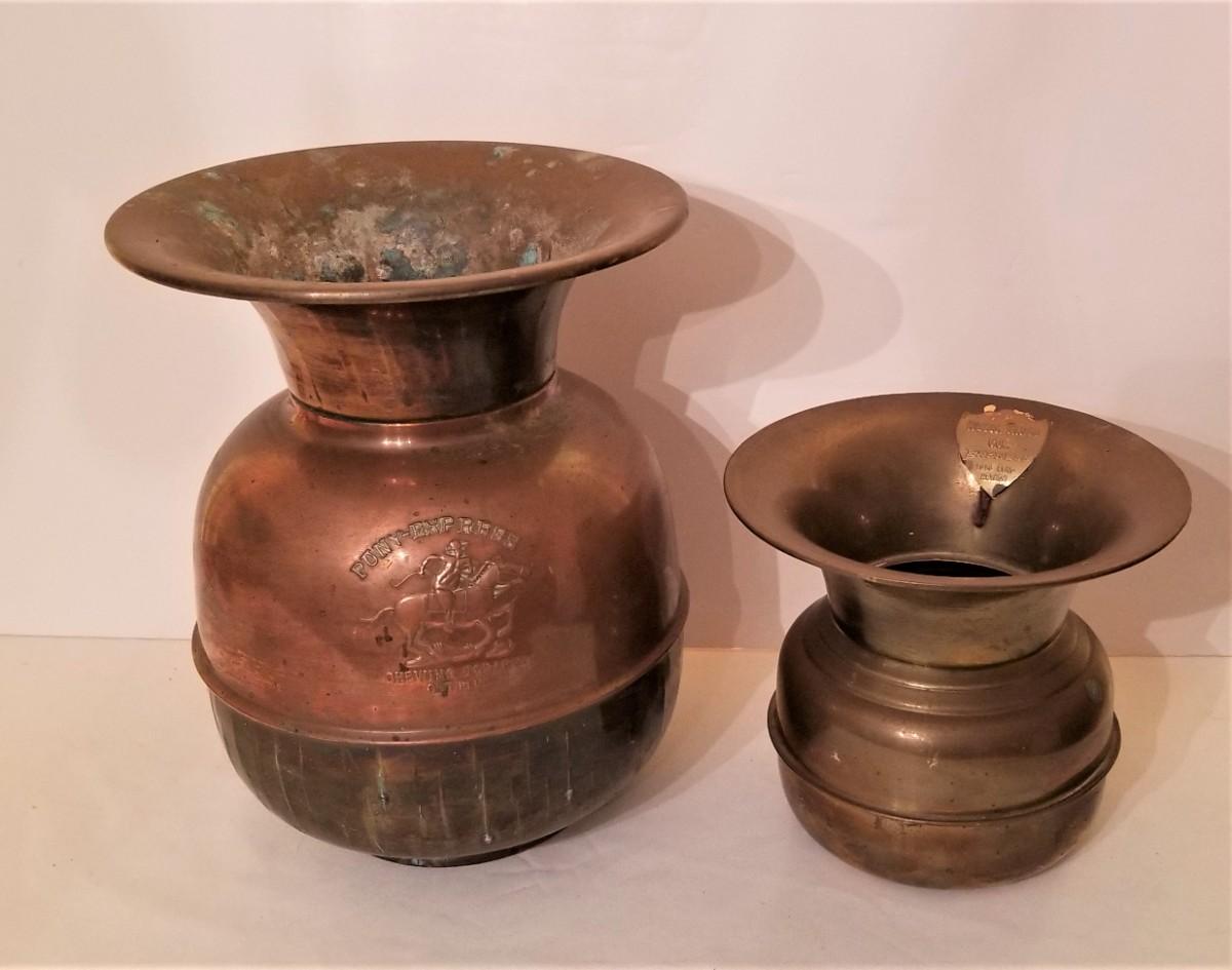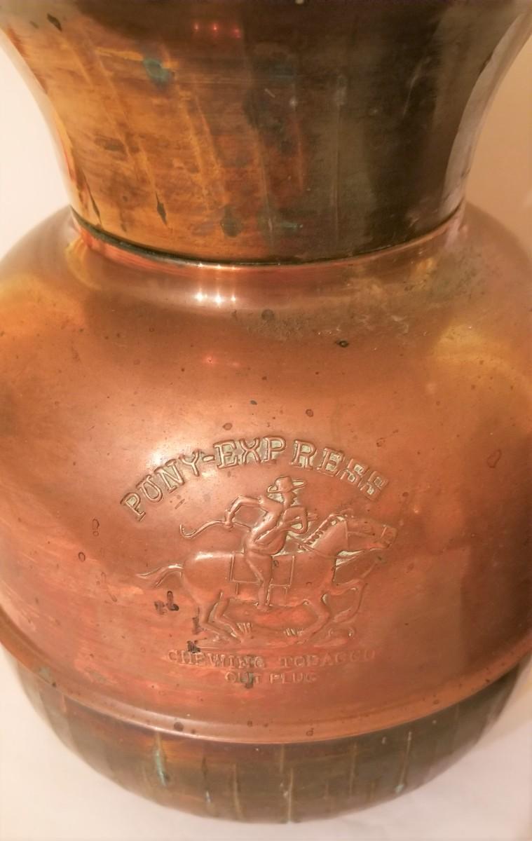 2 vintage brass spittoons - larger Pony Express Chewing Tobacco spittoon is 11" tall, smaller Wells Fargo is 6.5" tall. Larger one is weighted at the bottom. Both have been used. We have not attempted to polish them.