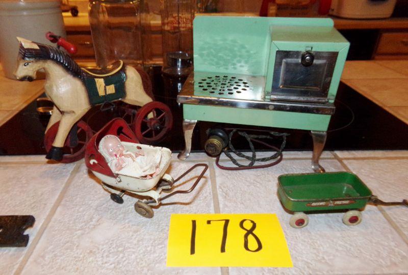 ELECTRIC TOY OVEN, METAL BABY BUGGY, SMALL RADIO FLYER WAGON