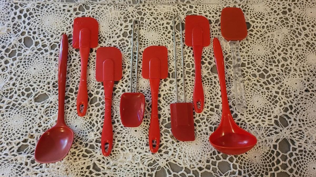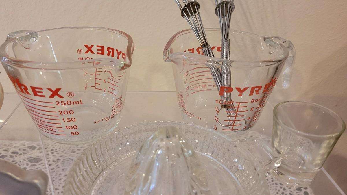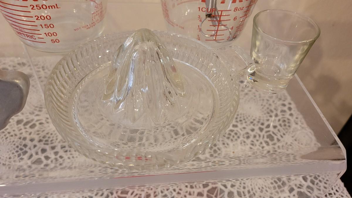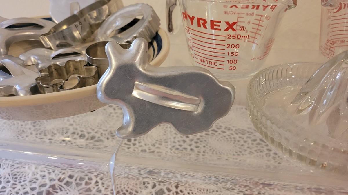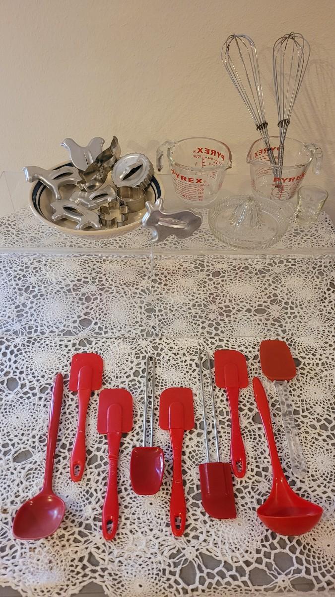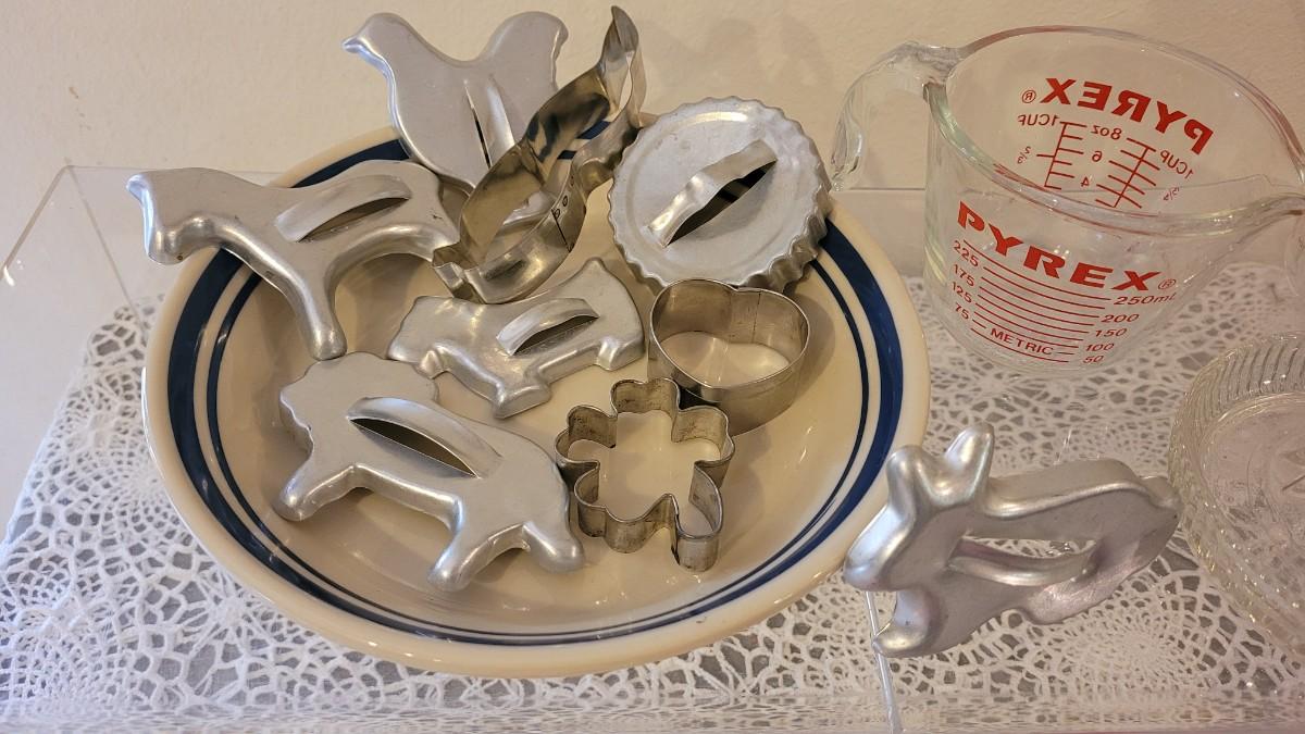 Lot 178: Contemporary Rossville, Ohio Pie Plate, Glass Juicer, Measuring Cups, Kitchen Utensils and Vintage Cookie Cutters
