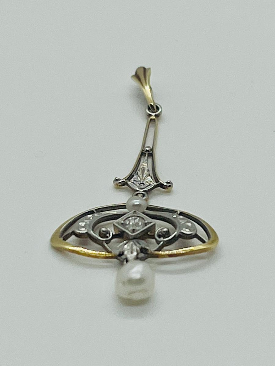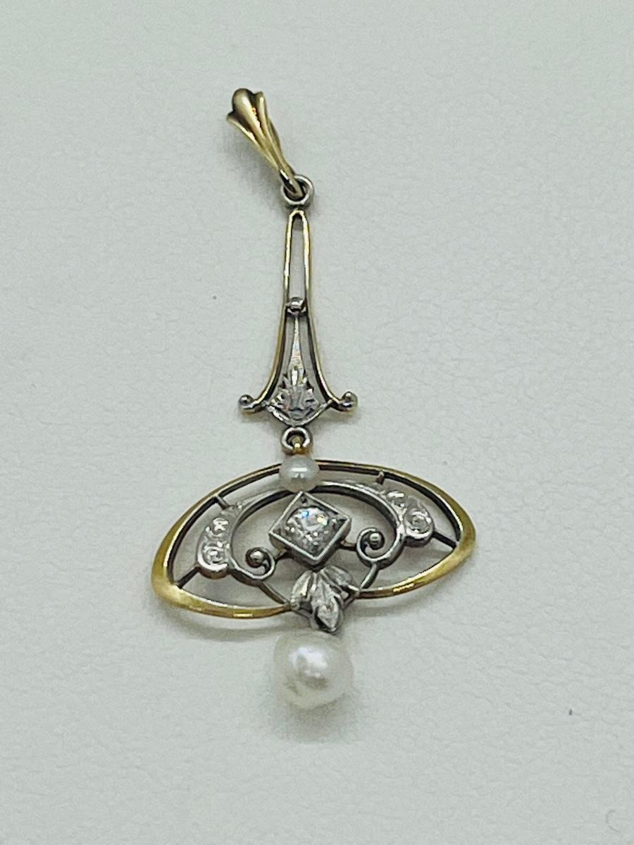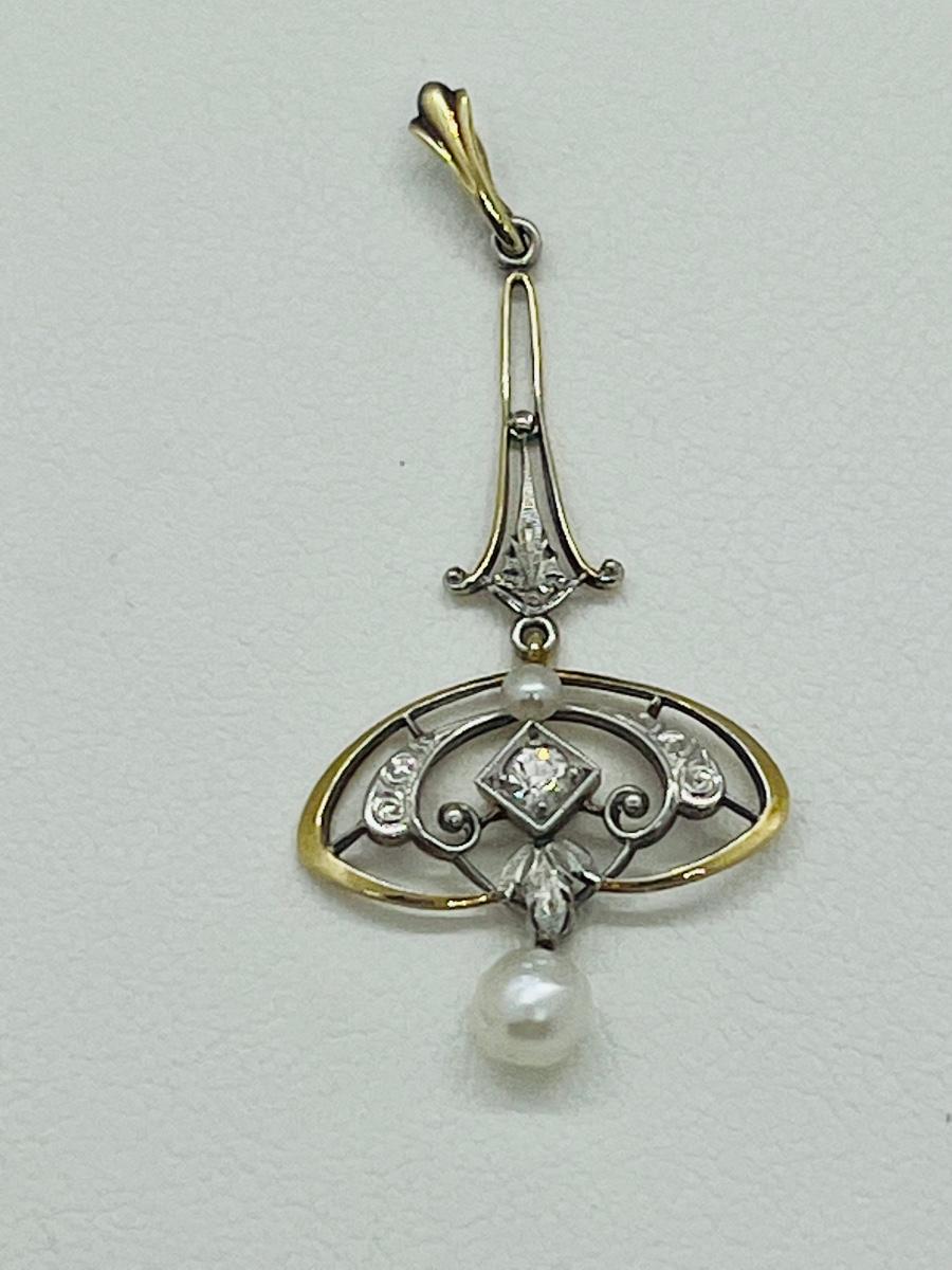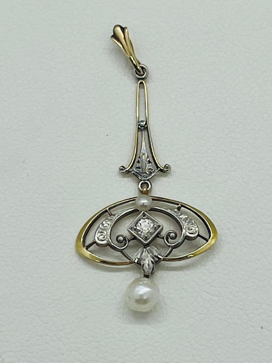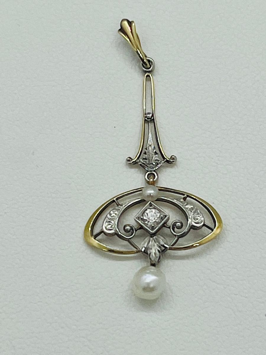 Lot 178: Vintage 14k Two-Tone Gold Pendant with Diamond center & 2 Pearls