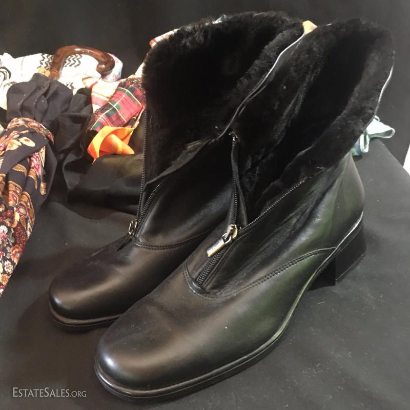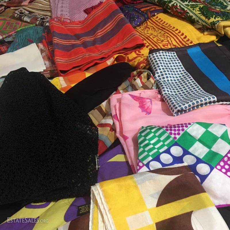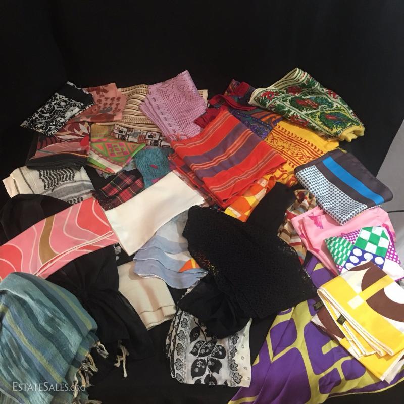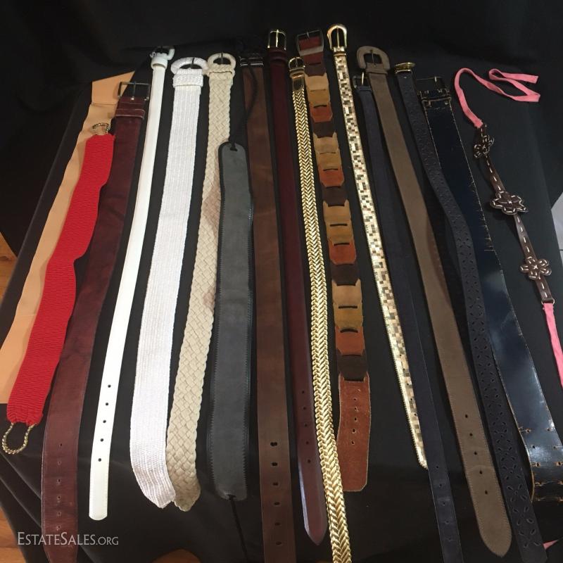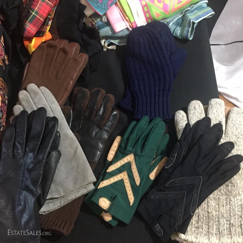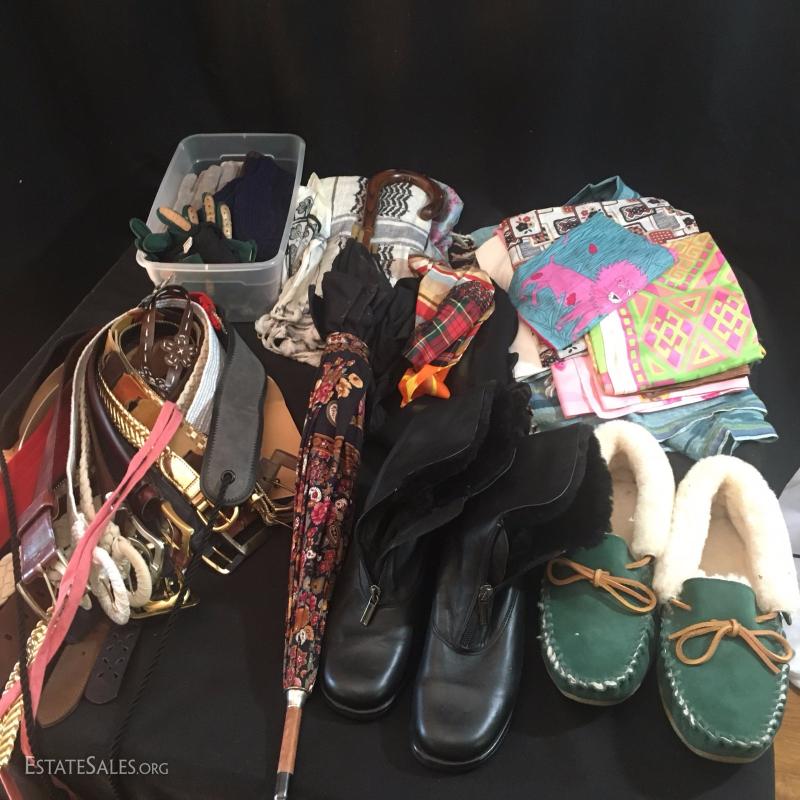 Assorted accessories. Includes several pairs of gloves, scarves, belts, shoes (size 10) and umbrella.