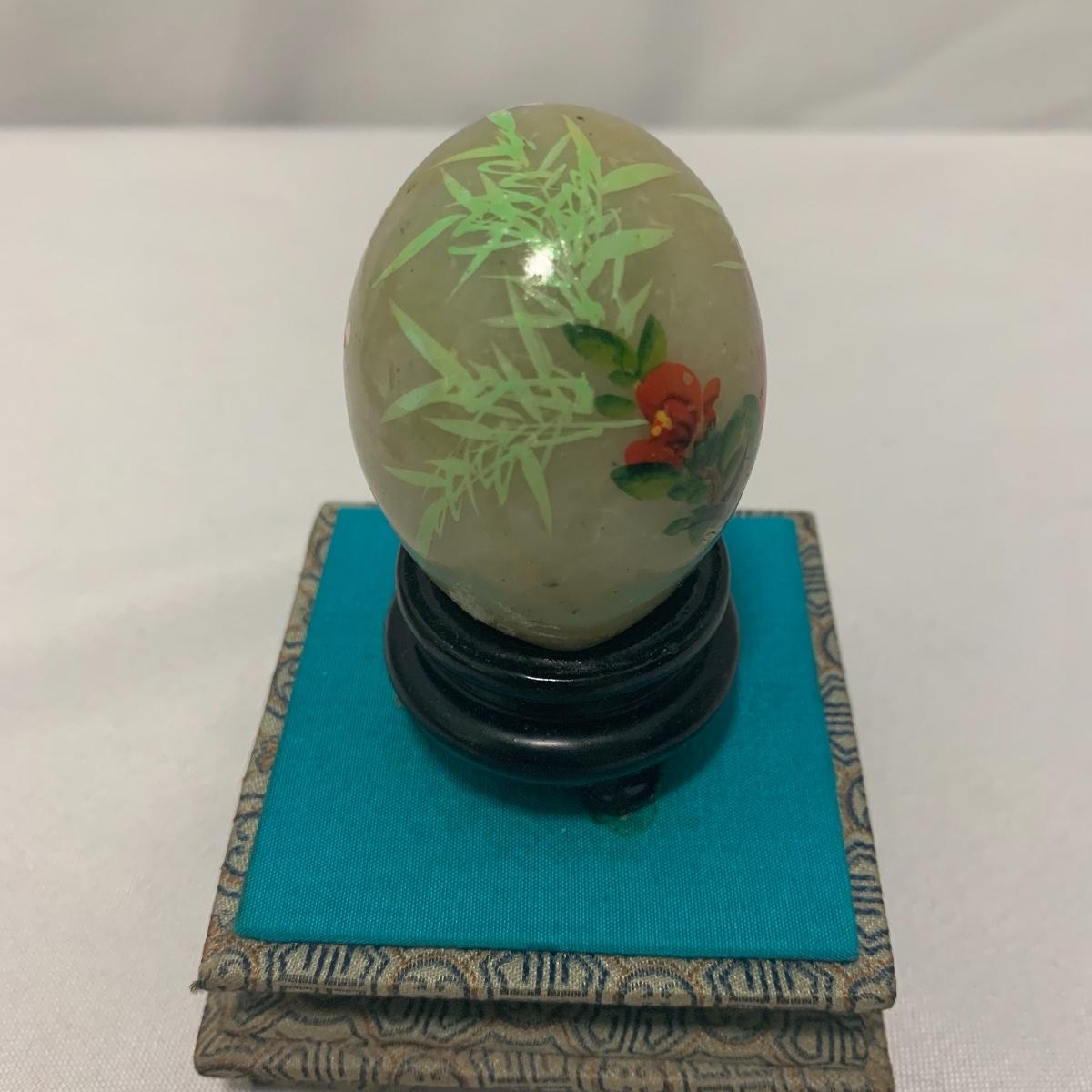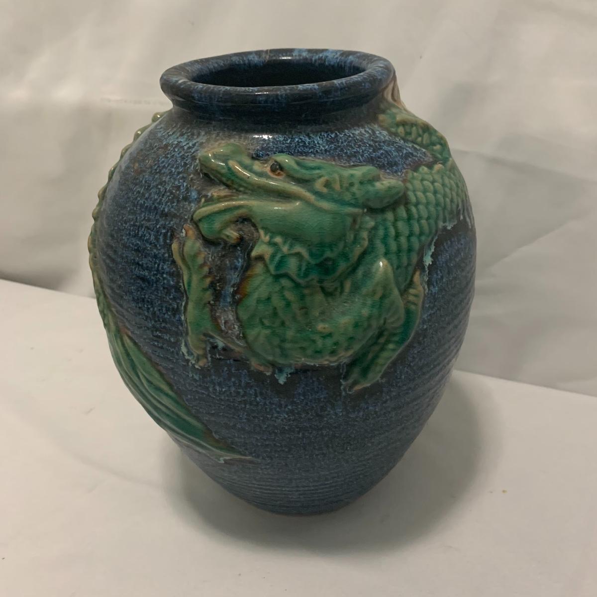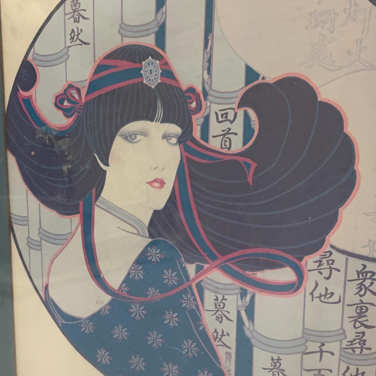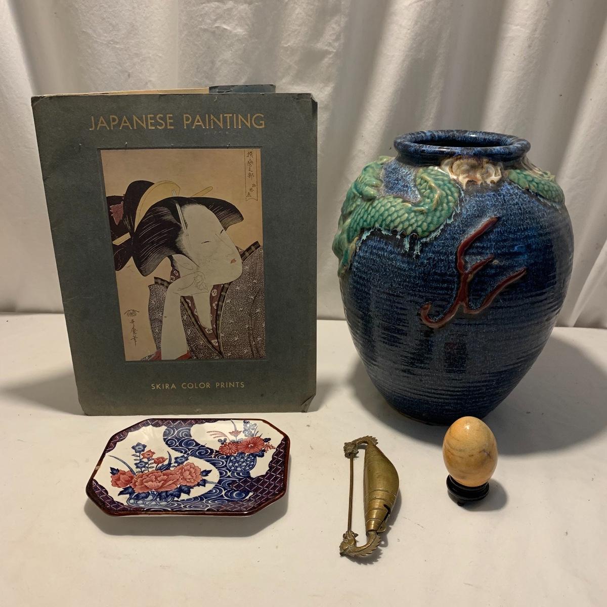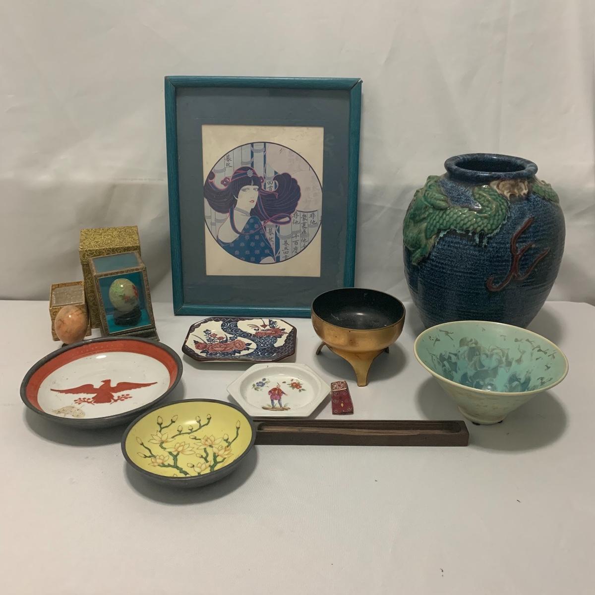 In this lot you will find a variety of Asian themed decorative items. First, there is a blue hued picture of a woman with beautiful flowing hair and a decorated blue dress. The frame and mat board are blue hued too, and both show some wear. You might want to fix up the frame and replace the mat board to give it a fresh look. The frame measures 12” x 15”. Next is a lovely blue ceramic urn with an ornate green dragon wrapped around it. The urn is about 11” tall and 9” in diameter. Also included is a variety of decorative bowls and small dishes, including some hand painted Japanese porcelain dishes. Additionally, there are two decorative marble eggs that come with stands and their original boxes. One egg is hand painted with a bird and flowers. This egg has a display case with its stand. There is also a set of wooden chopsticks with a wooden case (with a splinter missing from one edge) on which you’ll find Asian writing. There is also a neat brass double headed dragon lock. It has a special key that goes into a slot that releases the bar from one of the dragon’s mouths. A very unique piece sure to fascinate and puzzle your friends! There is also a white ceramic face decoration and a small bedazzled pepper shaker. And last but not least is a variety of art prints. Some from Asheville’s Thoms Estate, some from a book, and a whole folder full of Skira color prints of Japanese paintings. These would all be beautiful in frames hanging on your walls! Shipping available.