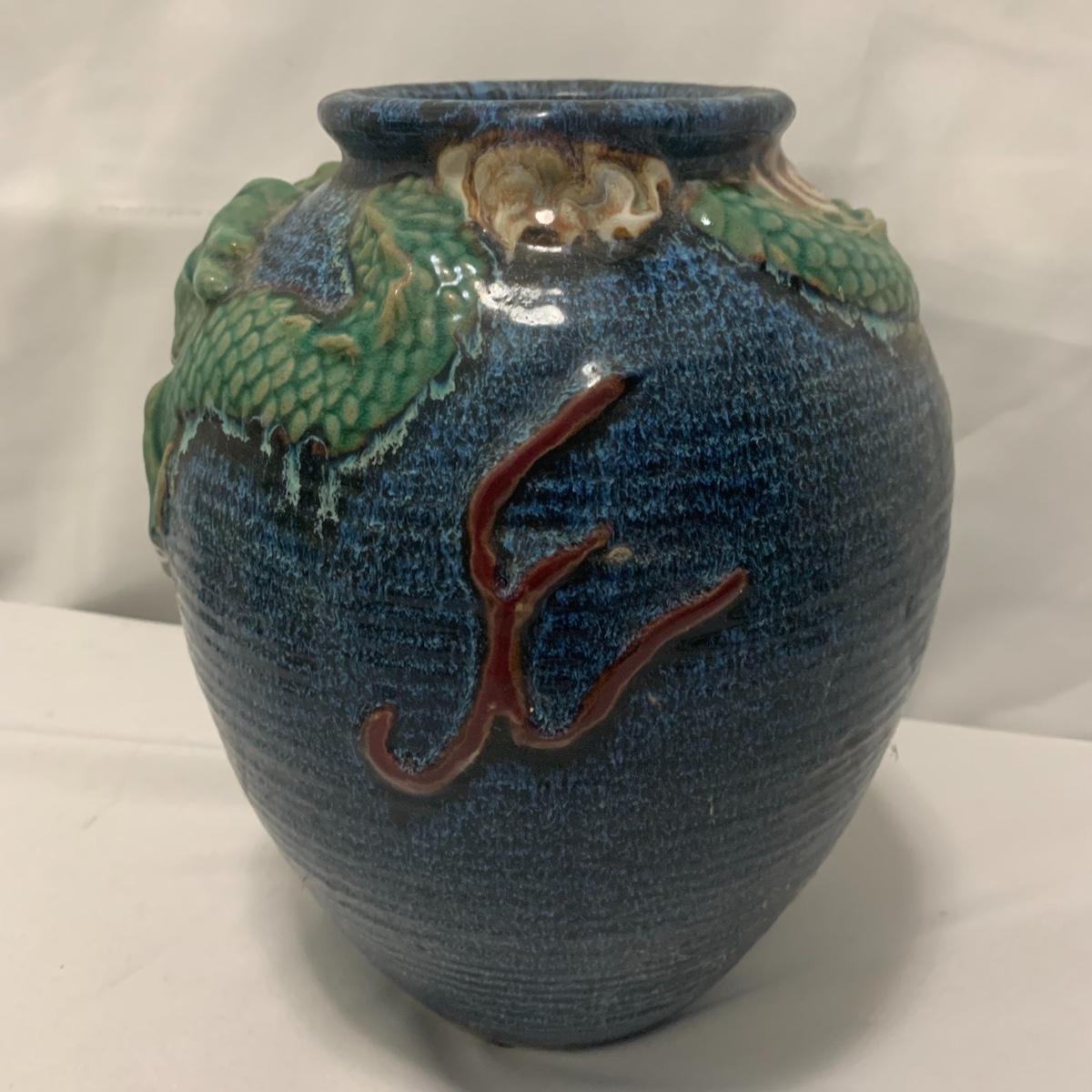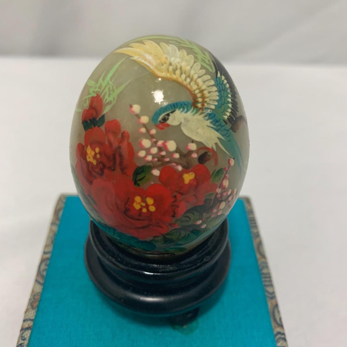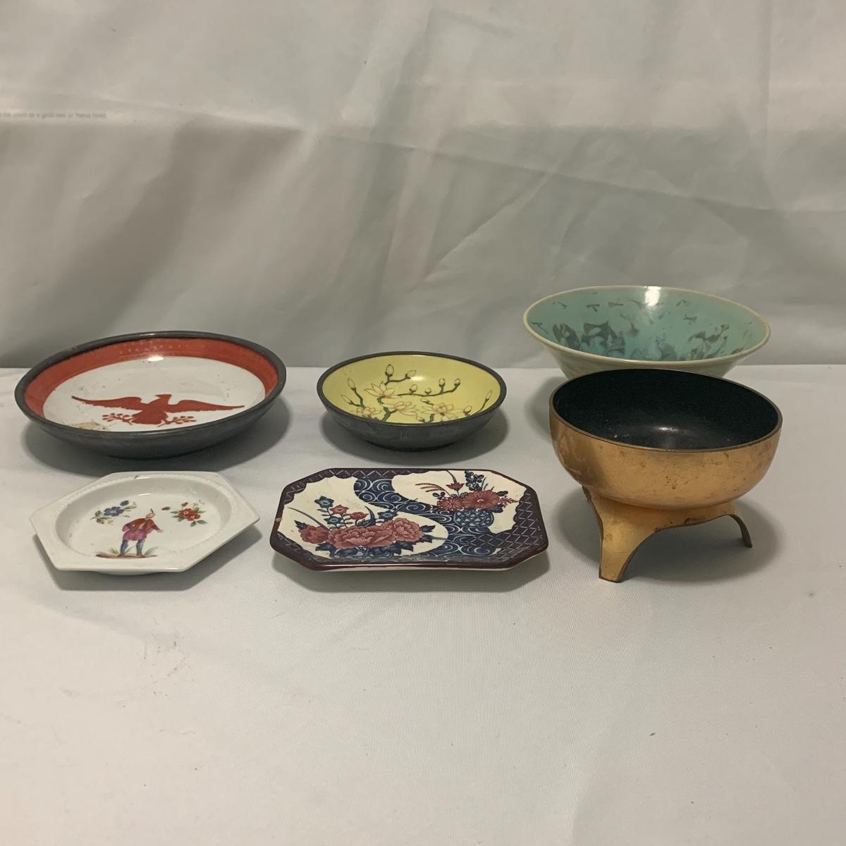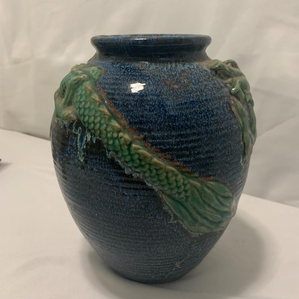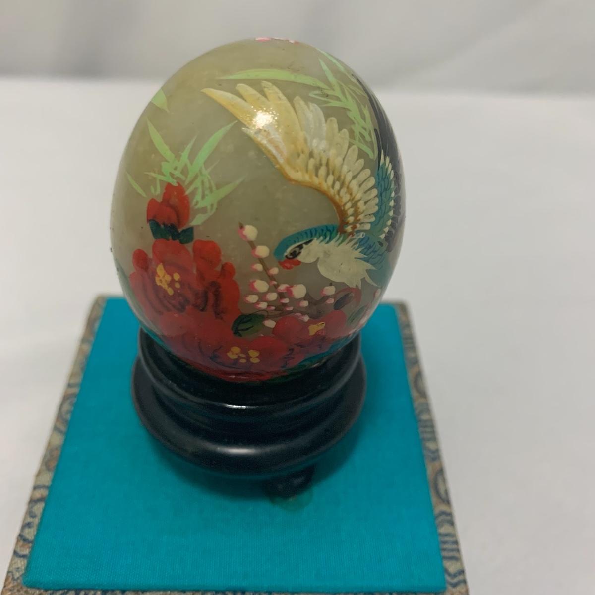 In this lot you will find a variety of Asian themed decorative items. First, there is a blue hued picture of a woman with beautiful flowing hair and a decorated blue dress. The frame and mat board are blue hued too, and both show some wear. You might want to fix up the frame and replace the mat board to give it a fresh look. The frame measures 12” x 15”. Next is a lovely blue ceramic urn with an ornate green dragon wrapped around it. The urn is about 11” tall and 9” in diameter. Also included is a variety of decorative bowls and small dishes, including some hand painted Japanese porcelain dishes. Additionally, there are two decorative marble eggs that come with stands and their original boxes. One egg is hand painted with a bird and flowers. This egg has a display case with its stand. There is also a set of wooden chopsticks with a wooden case (with a splinter missing from one edge) on which you’ll find Asian writing. There is also a neat brass double headed dragon lock. It has a special key that goes into a slot that releases the bar from one of the dragon’s mouths. A very unique piece sure to fascinate and puzzle your friends! There is also a white ceramic face decoration and a small bedazzled pepper shaker. And last but not least is a variety of art prints. Some from Asheville’s Thoms Estate, some from a book, and a whole folder full of Skira color prints of Japanese paintings. These would all be beautiful in frames hanging on your walls! Shipping available.