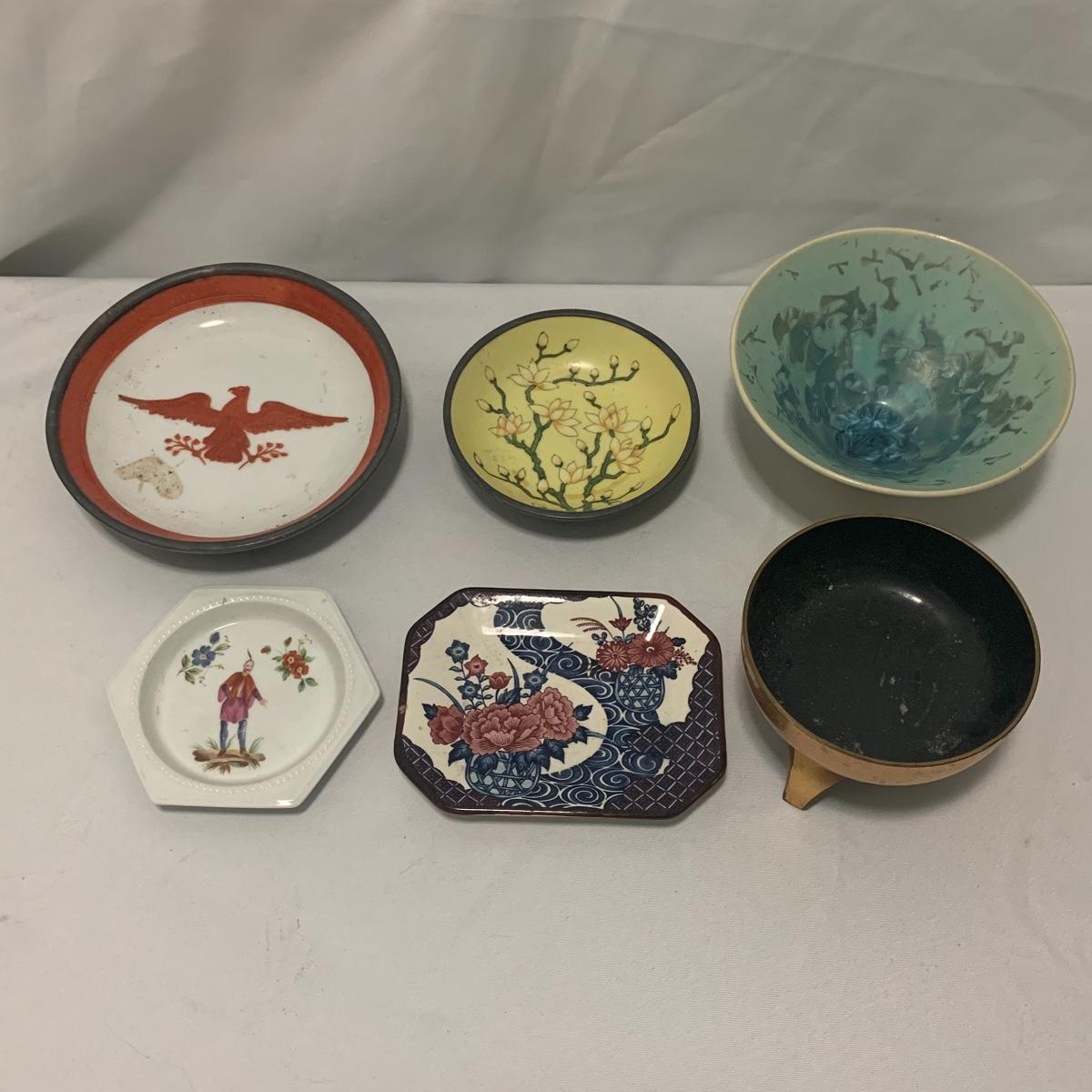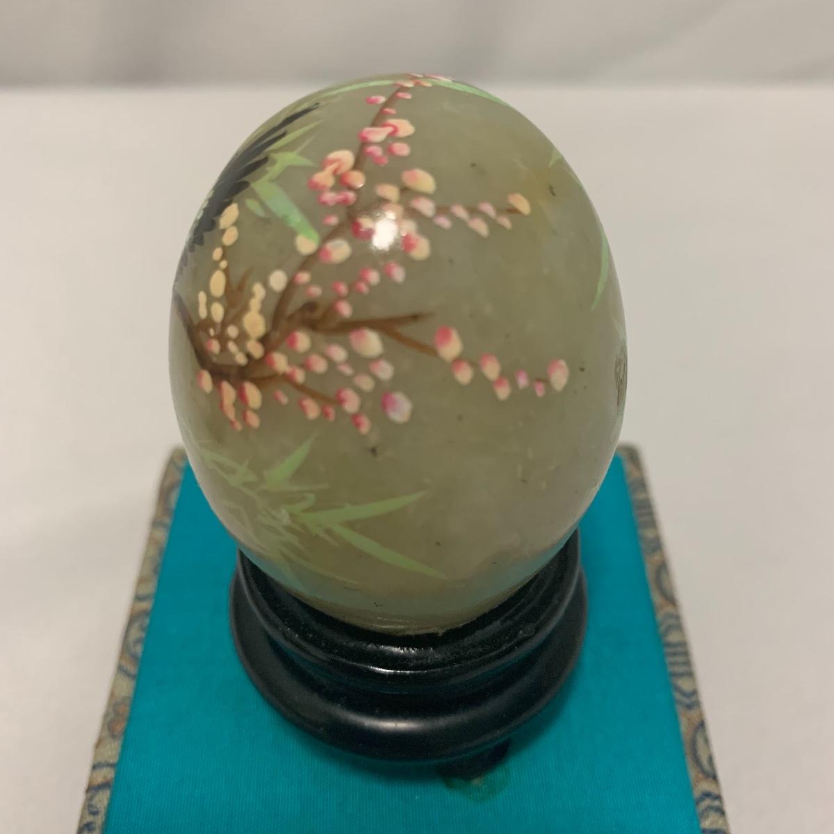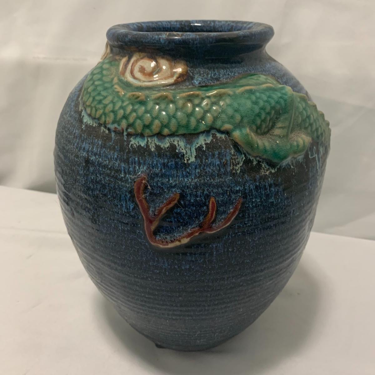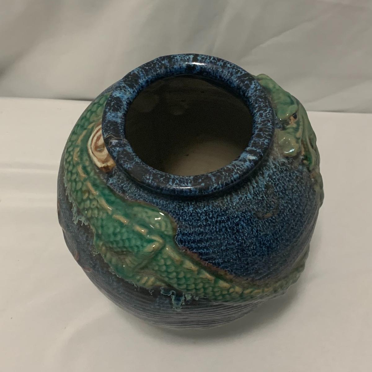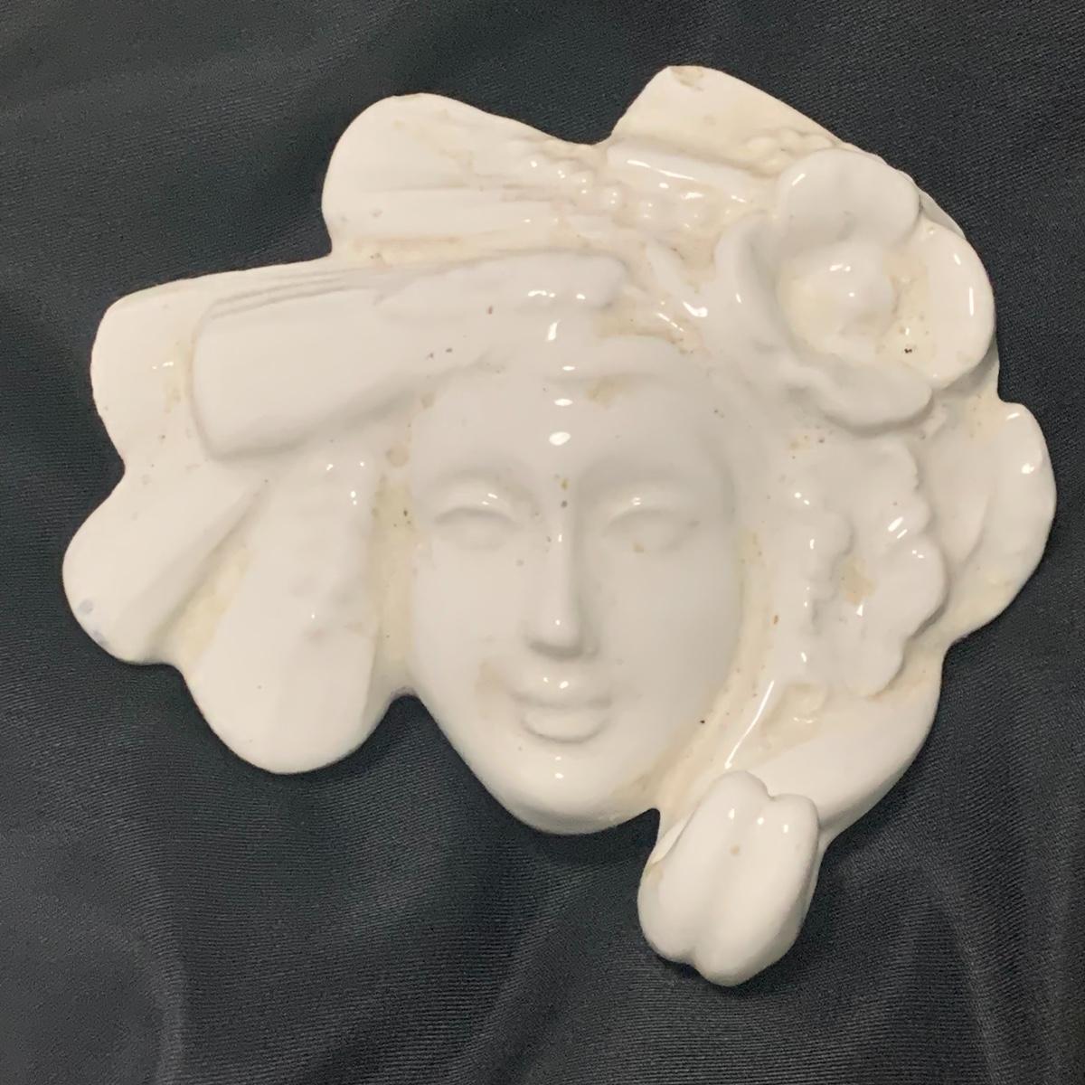 In this lot you will find a variety of Asian themed decorative items. First, there is a blue hued picture of a woman with beautiful flowing hair and a decorated blue dress. The frame and mat board are blue hued too, and both show some wear. You might want to fix up the frame and replace the mat board to give it a fresh look. The frame measures 12” x 15”. Next is a lovely blue ceramic urn with an ornate green dragon wrapped around it. The urn is about 11” tall and 9” in diameter. Also included is a variety of decorative bowls and small dishes, including some hand painted Japanese porcelain dishes. Additionally, there are two decorative marble eggs that come with stands and their original boxes. One egg is hand painted with a bird and flowers. This egg has a display case with its stand. There is also a set of wooden chopsticks with a wooden case (with a splinter missing from one edge) on which you’ll find Asian writing. There is also a neat brass double headed dragon lock. It has a special key that goes into a slot that releases the bar from one of the dragon’s mouths. A very unique piece sure to fascinate and puzzle your friends! There is also a white ceramic face decoration and a small bedazzled pepper shaker. And last but not least is a variety of art prints. Some from Asheville’s Thoms Estate, some from a book, and a whole folder full of Skira color prints of Japanese paintings. These would all be beautiful in frames hanging on your walls! Shipping available.