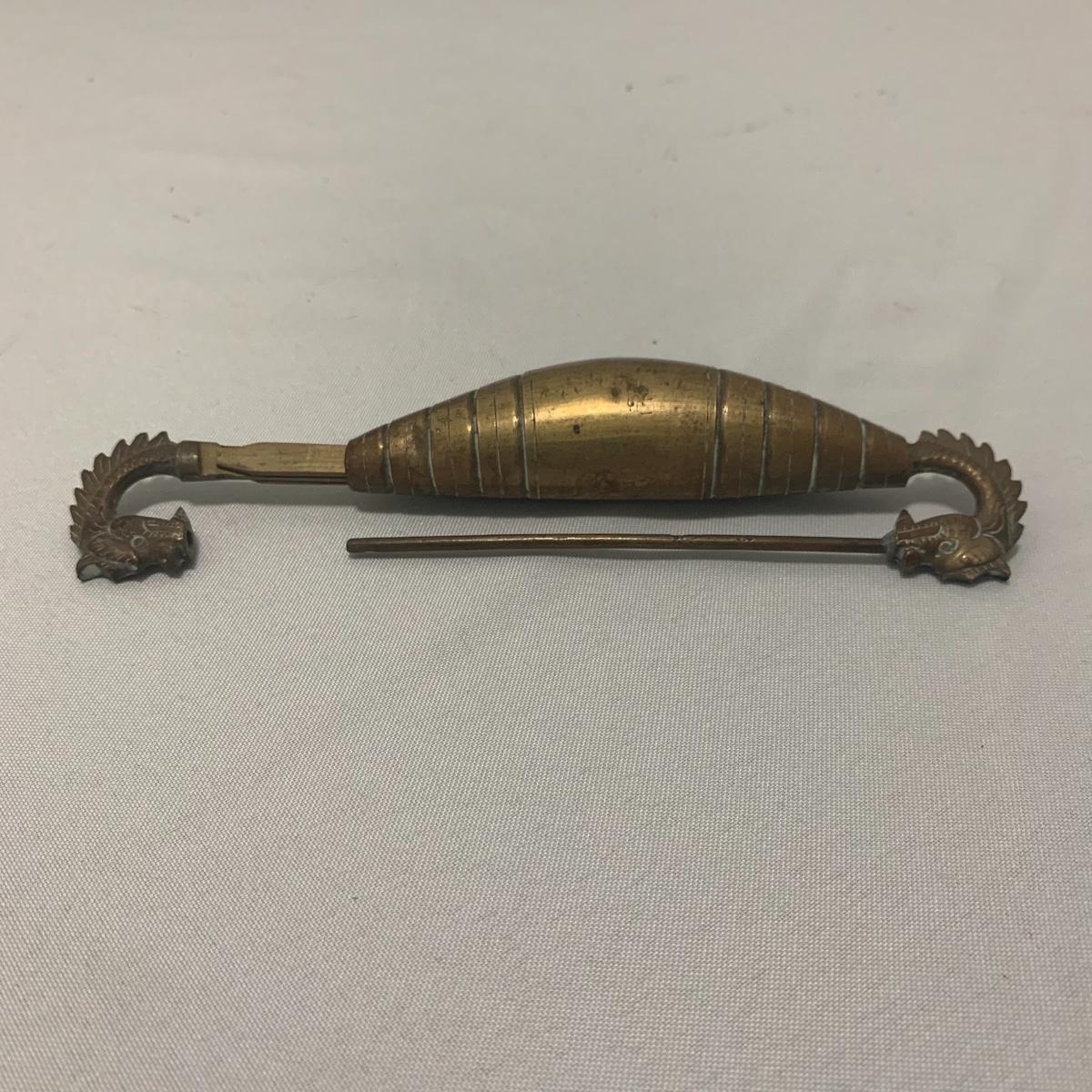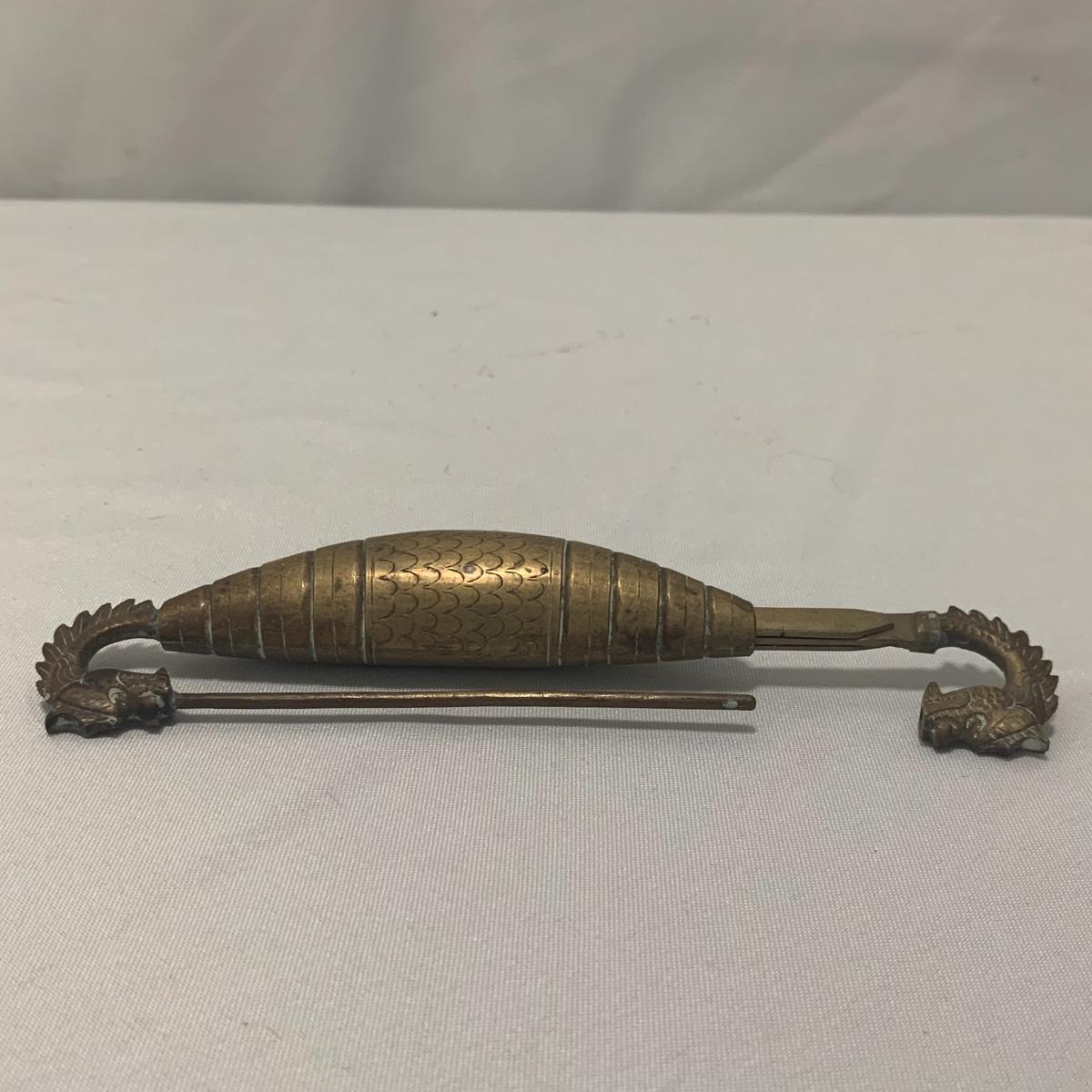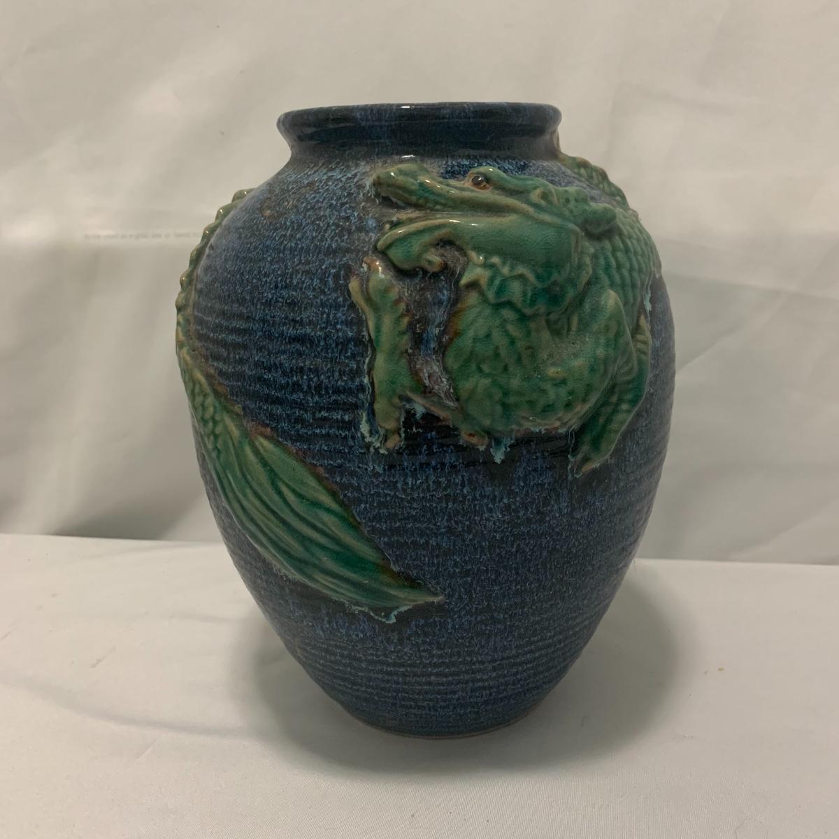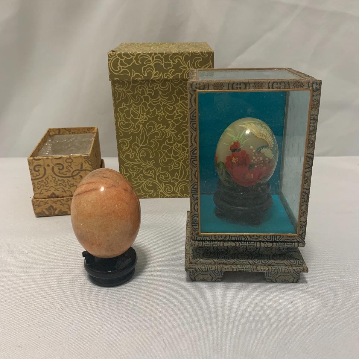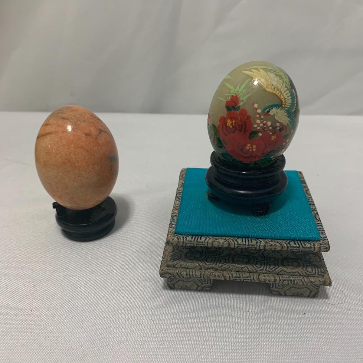 In this lot you will find a variety of Asian themed decorative items. First, there is a blue hued picture of a woman with beautiful flowing hair and a decorated blue dress. The frame and mat board are blue hued too, and both show some wear. You might want to fix up the frame and replace the mat board to give it a fresh look. The frame measures 12” x 15”. Next is a lovely blue ceramic urn with an ornate green dragon wrapped around it. The urn is about 11” tall and 9” in diameter. Also included is a variety of decorative bowls and small dishes, including some hand painted Japanese porcelain dishes. Additionally, there are two decorative marble eggs that come with stands and their original boxes. One egg is hand painted with a bird and flowers. This egg has a display case with its stand. There is also a set of wooden chopsticks with a wooden case (with a splinter missing from one edge) on which you’ll find Asian writing. There is also a neat brass double headed dragon lock. It has a special key that goes into a slot that releases the bar from one of the dragon’s mouths. A very unique piece sure to fascinate and puzzle your friends! There is also a white ceramic face decoration and a small bedazzled pepper shaker. And last but not least is a variety of art prints. Some from Asheville’s Thoms Estate, some from a book, and a whole folder full of Skira color prints of Japanese paintings. These would all be beautiful in frames hanging on your walls! Shipping available.