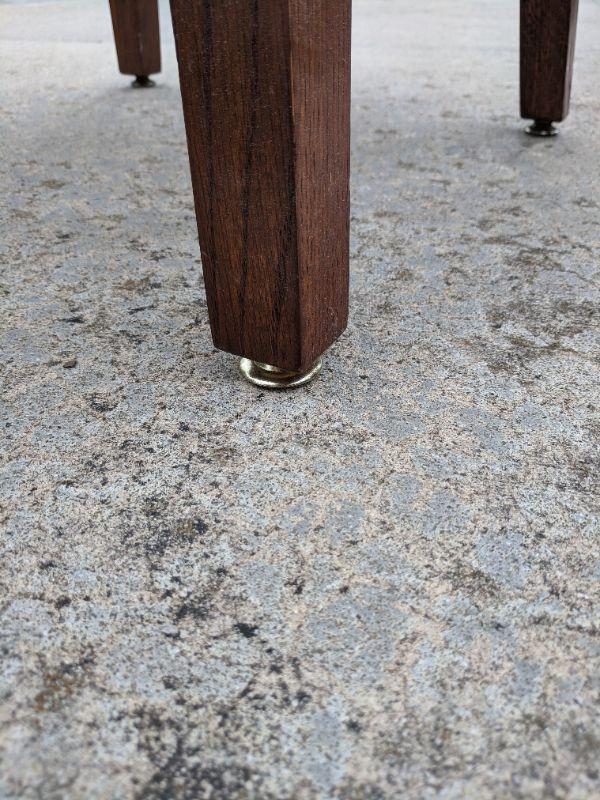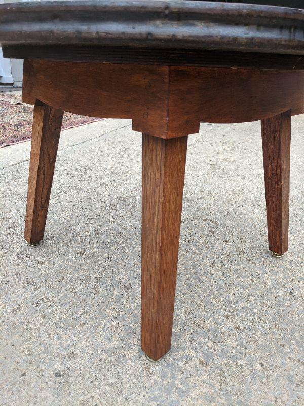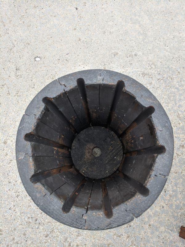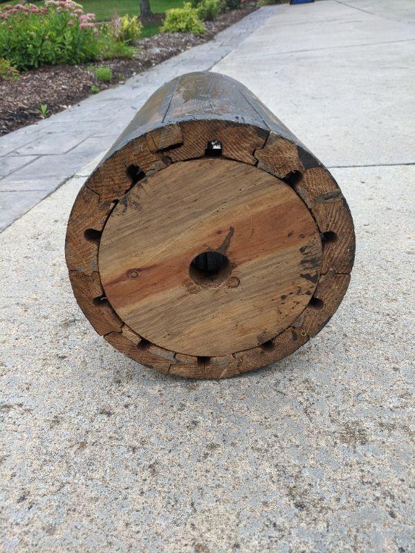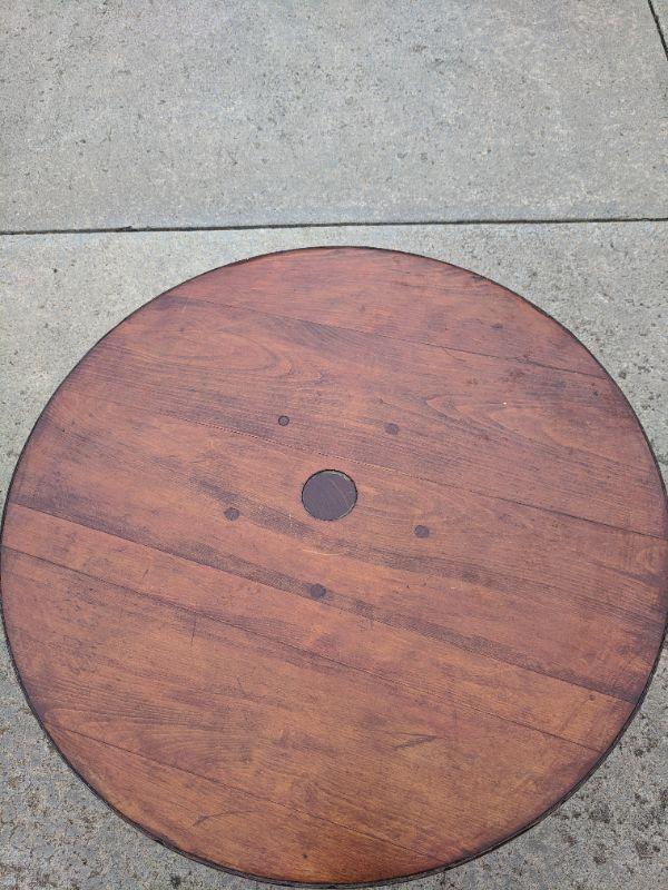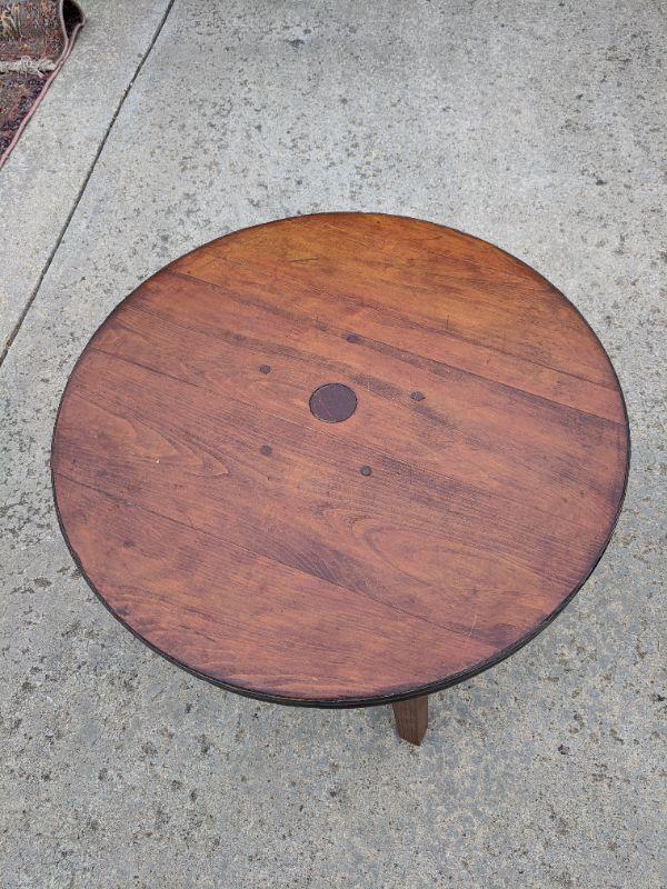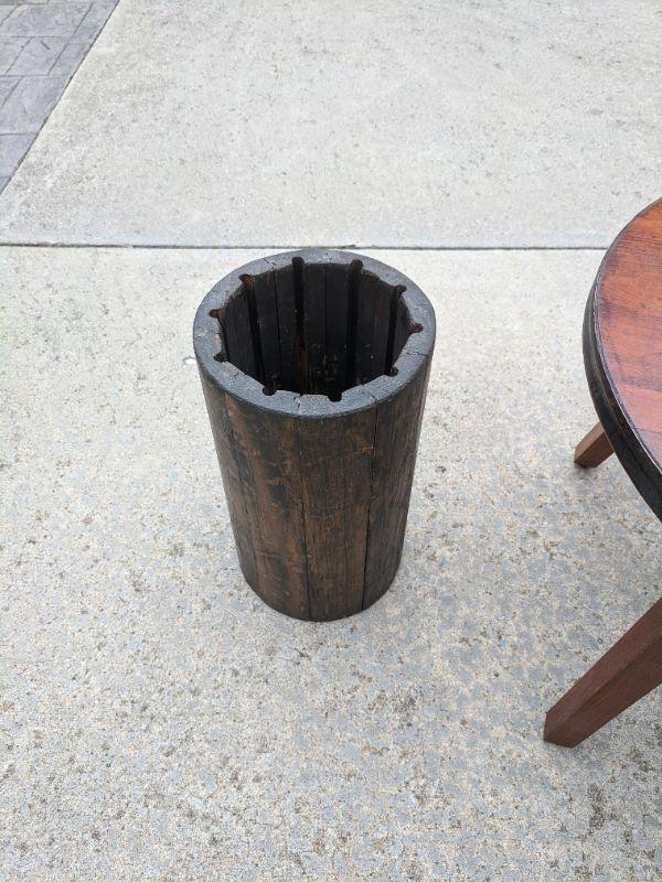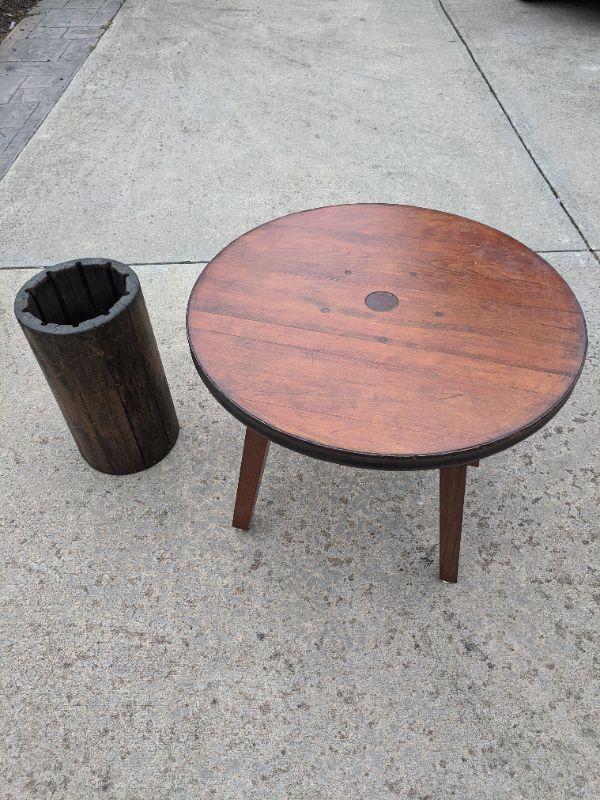 A rustic side table that is made from the end of a barrel, there is a sticker at the bottom that shows more details. Also included in this lot is a sturdy wooden umbrella stand. Measurements for the round table: diameter 2'3" height 1'8". The umbrella stand: diameter 10" height 1'6". No shipping.