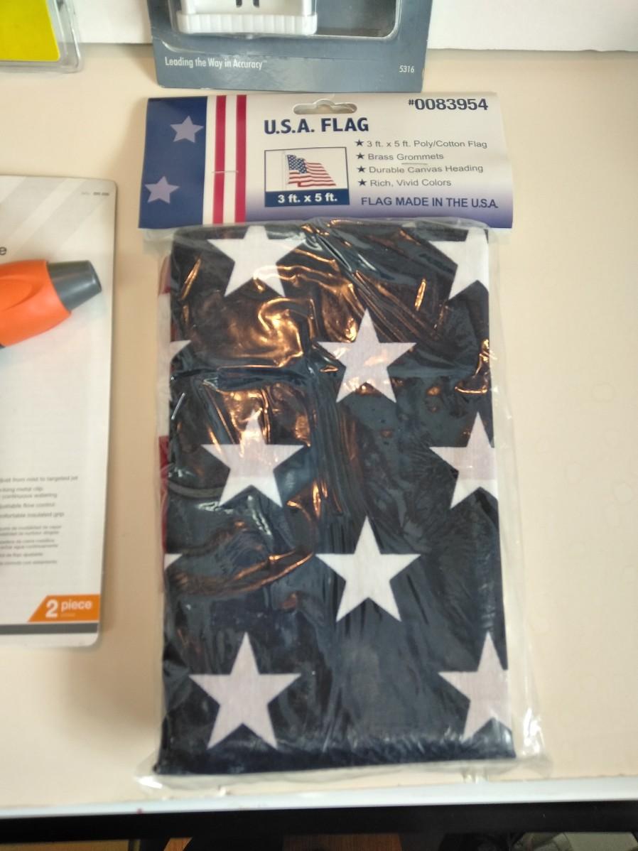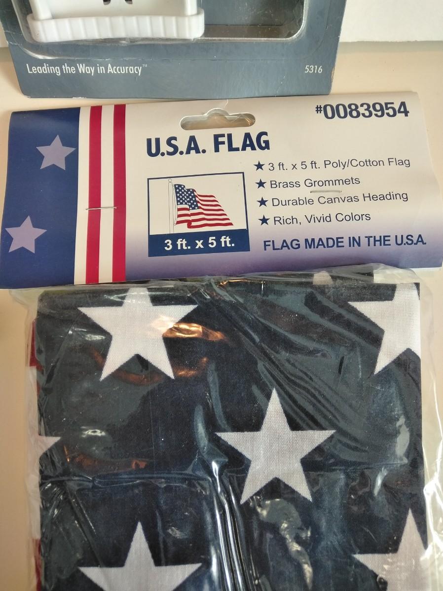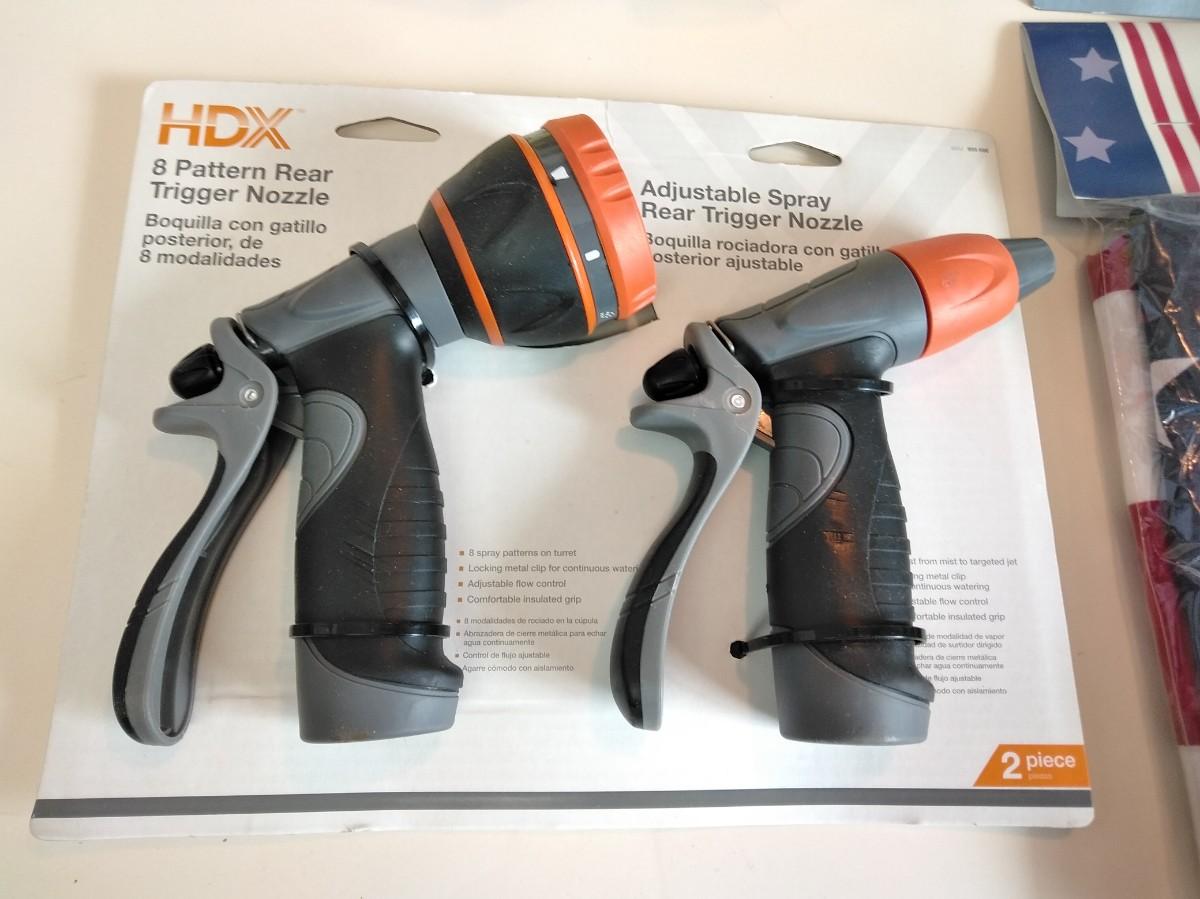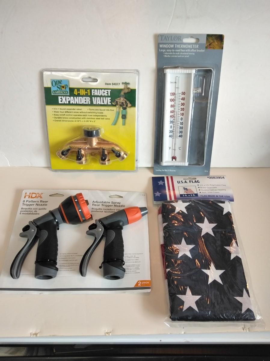 4-IN-1 FAUCET EXPANDER VALVE, BRAND NEW THERMOMETER, TWO HDX 8 PATTERN REAR TRIGGER NOZZLE, AND A U.S.A. 3 FT. X 5 FT. POLY / COTTON FLAG WITH BRASS GROMMETS.