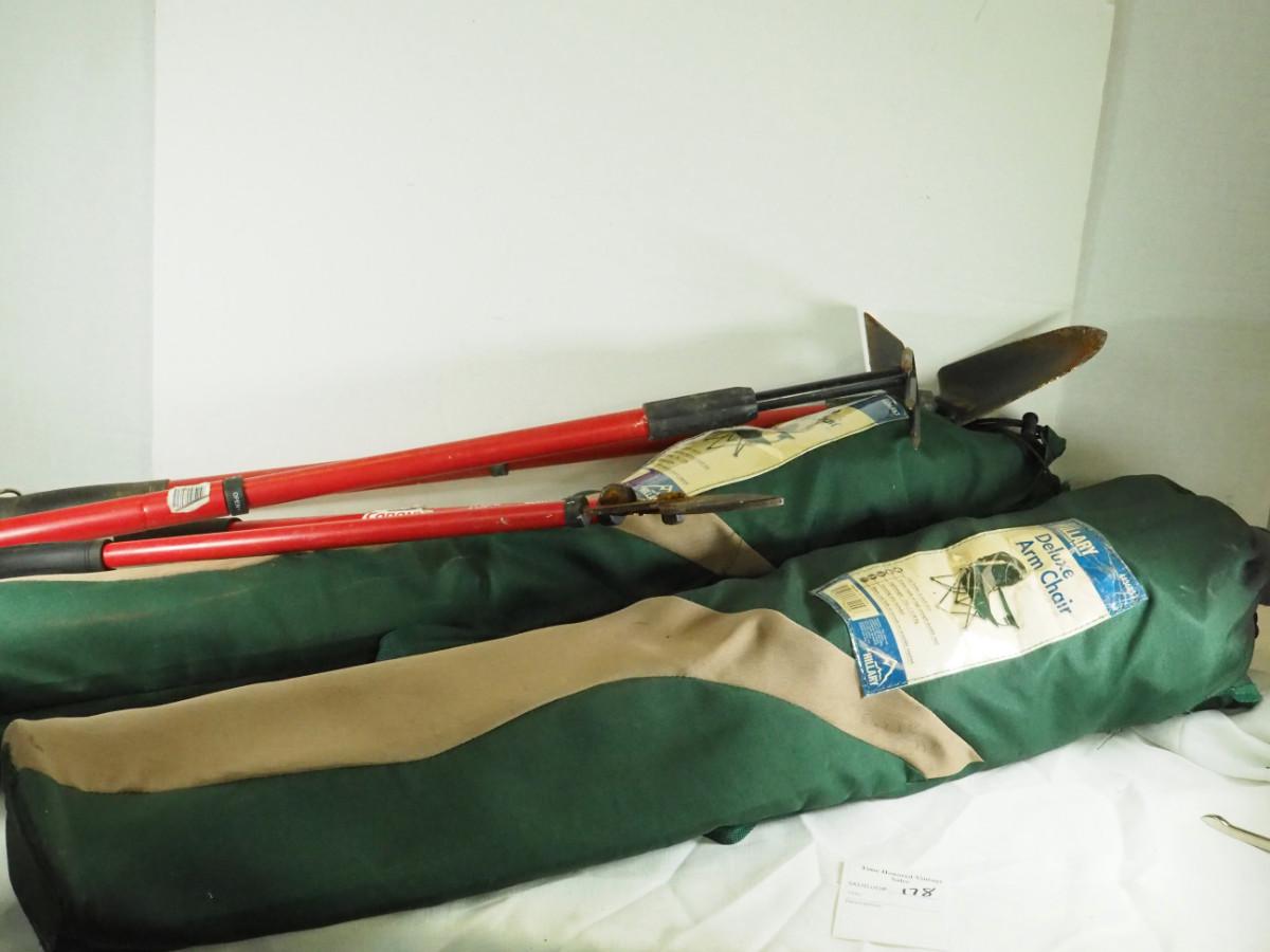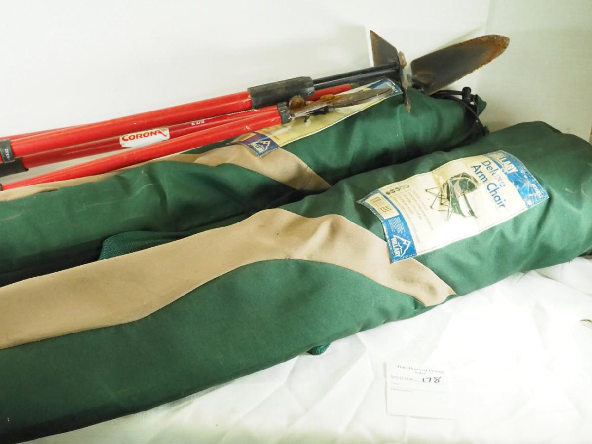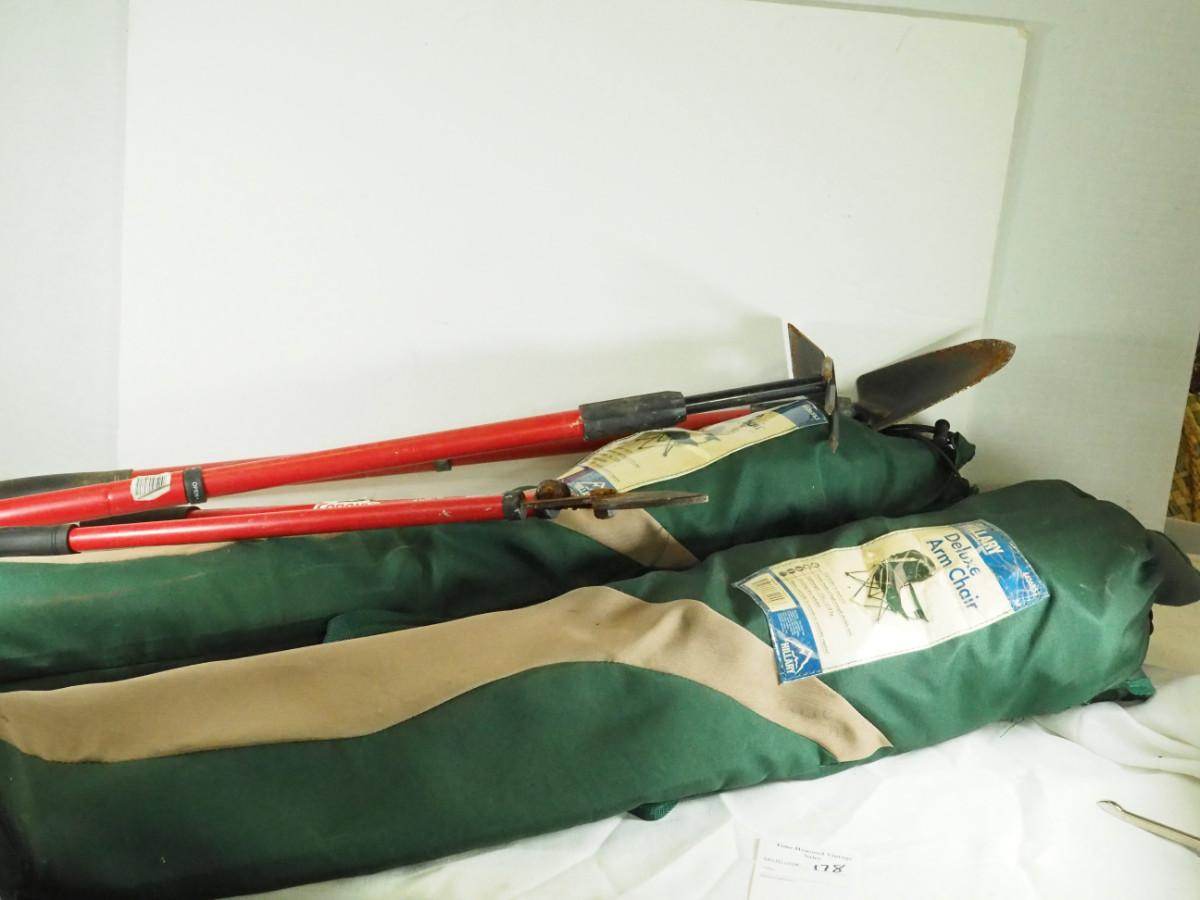 Lot 178- Camp chairs and garden tools, chairs untested, tools used some rust.