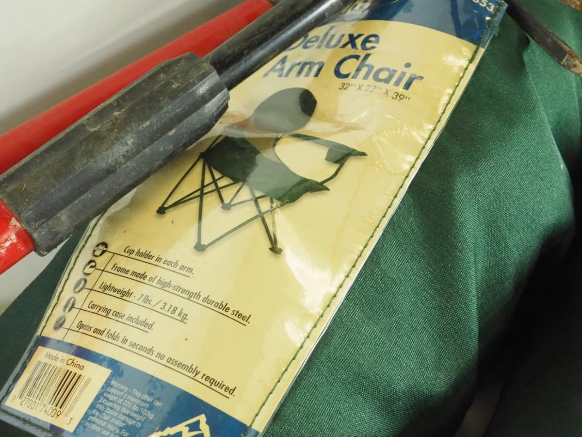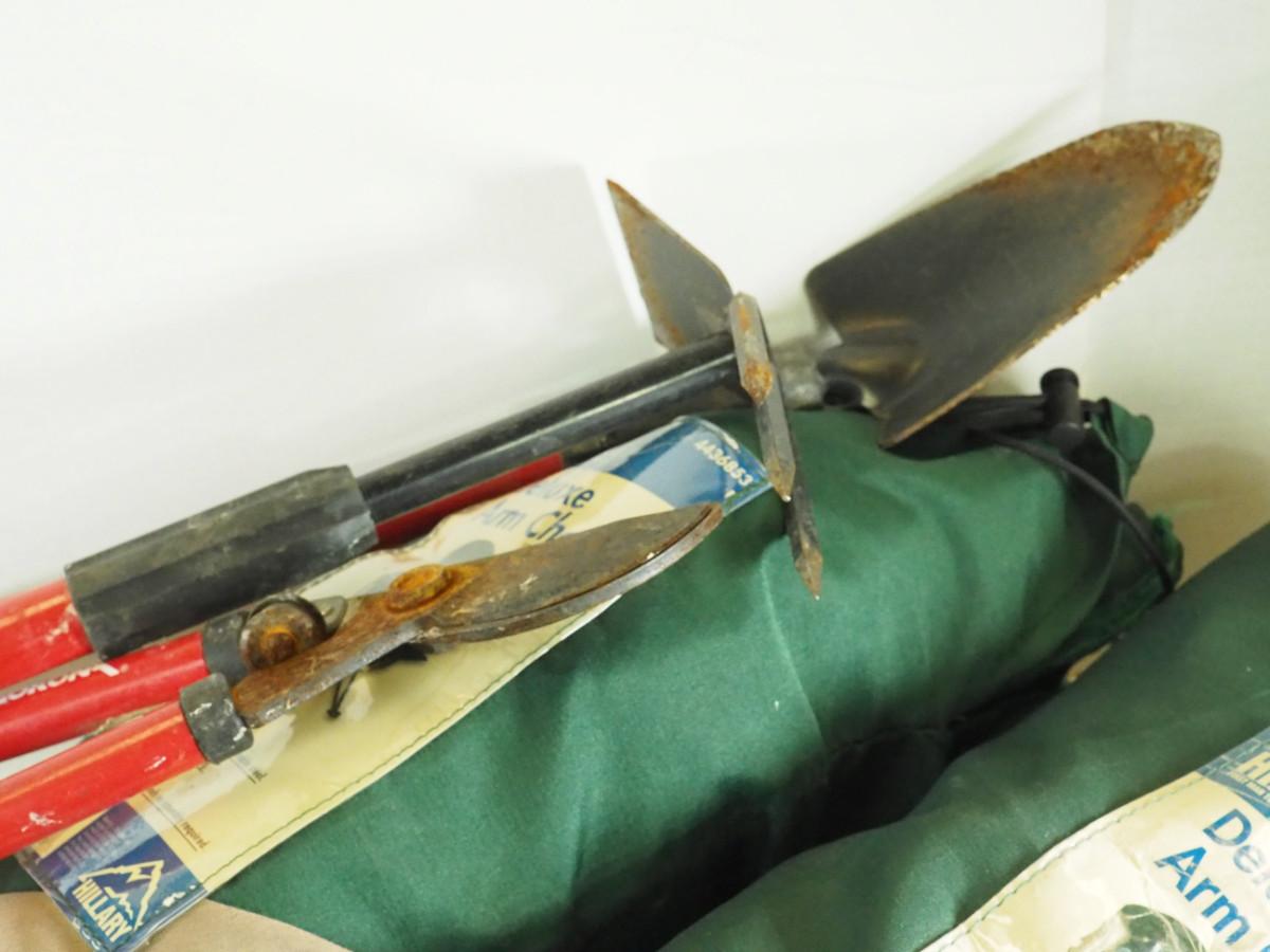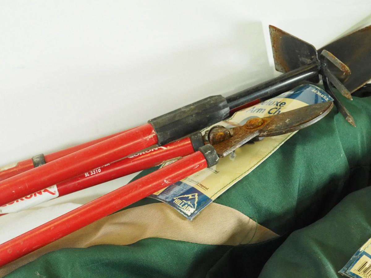 Lot 178- Camp chairs and garden tools, chairs untested, tools used some rust.