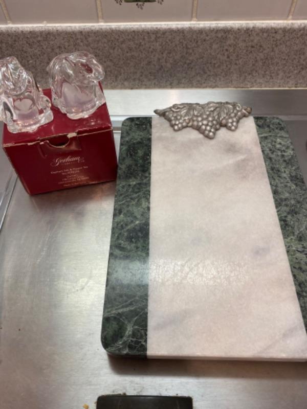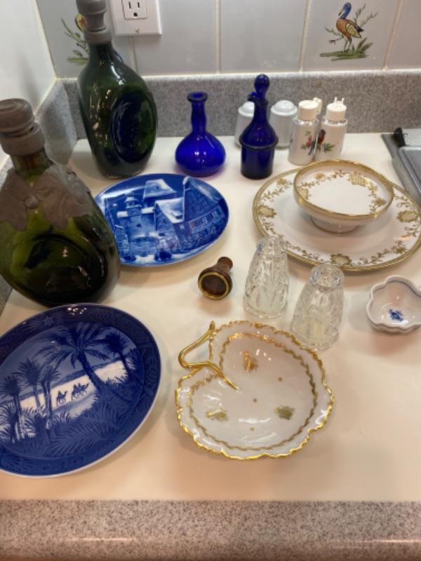 Lot of two pinch decanters, nippon, collector plates , cheese board, Gotham slap and pepper