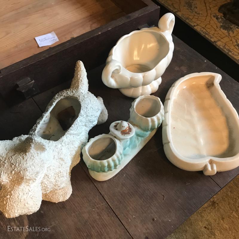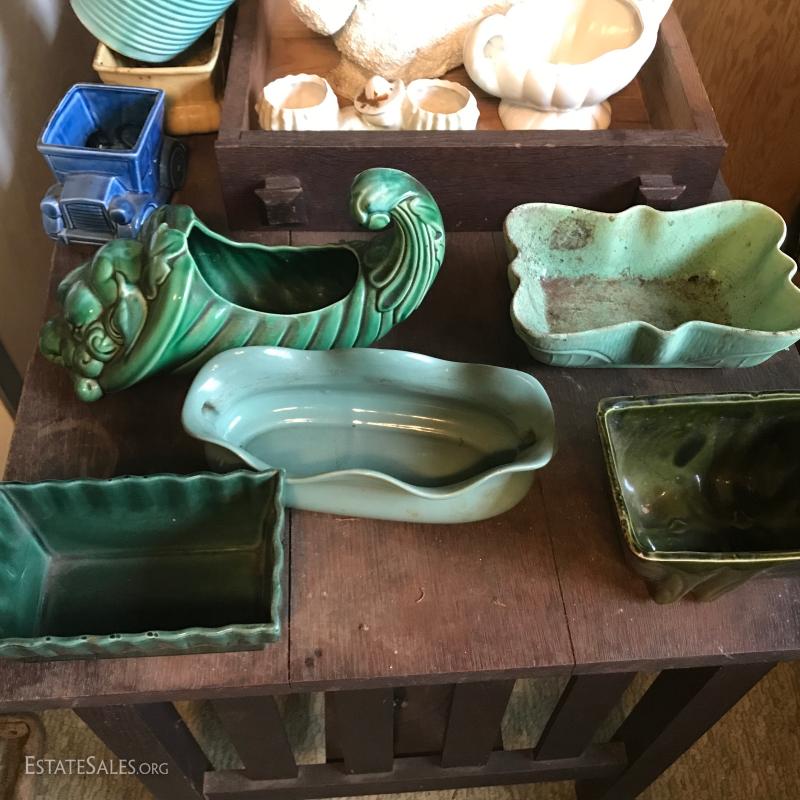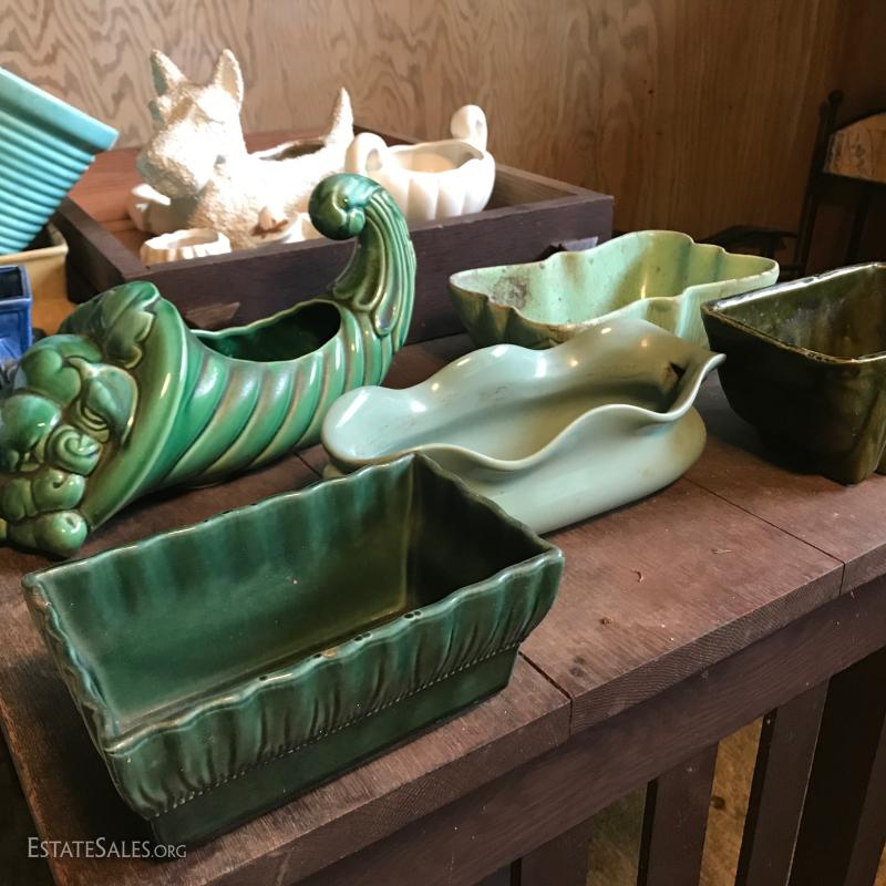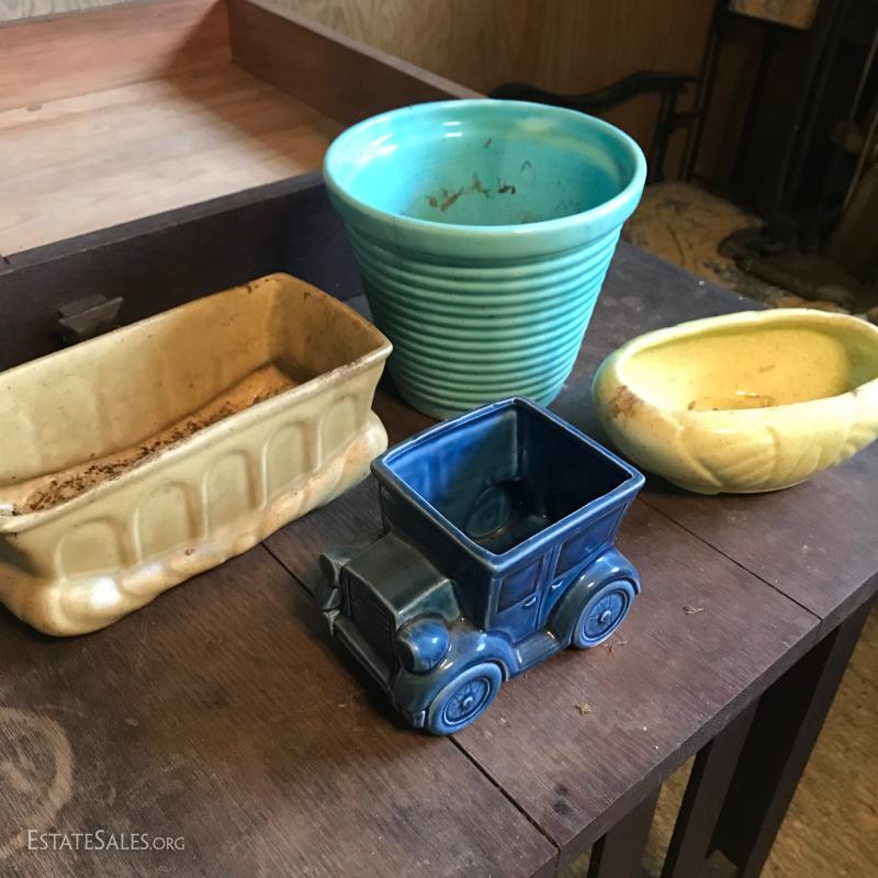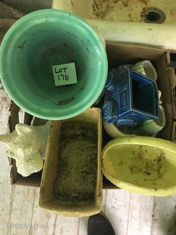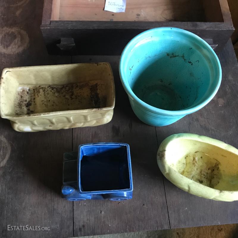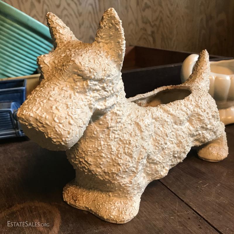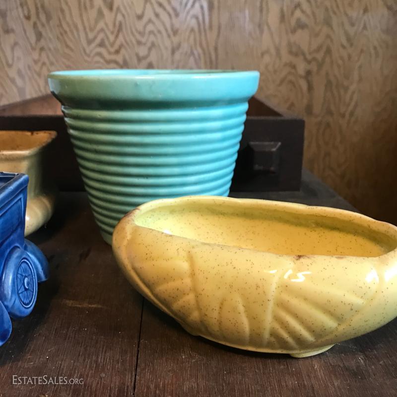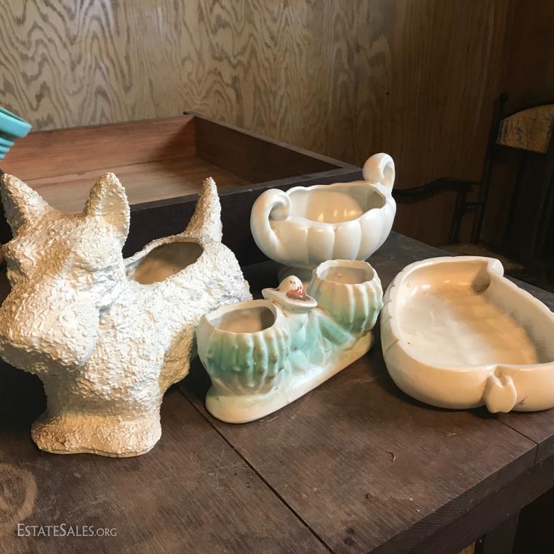 Lot of Vintage colored ceramic planters. Includes cute Scottish Terrier planter. See photos for markings and details. Various styles, colors and sizes.
