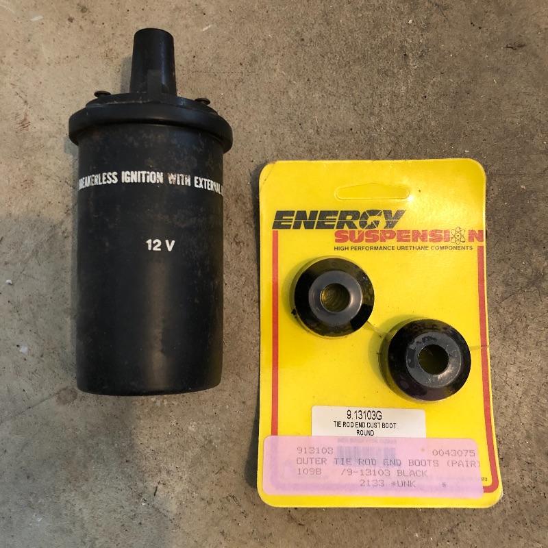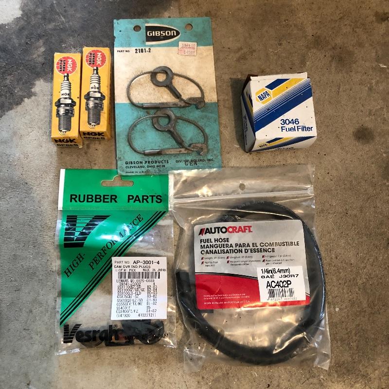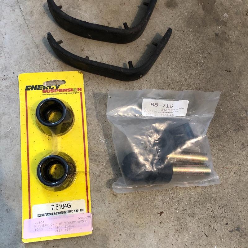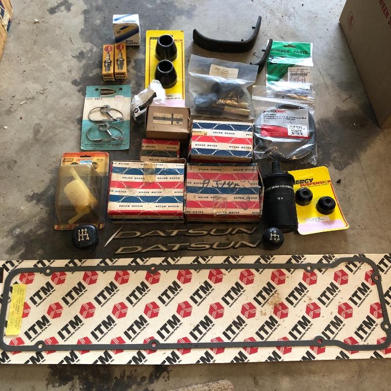 Get these hard to find parts for your 240Z. Log includes NOS two over riders, marker lamp, plate and strainer. Also includes valve cover gasket, suspension bushings, coil and other parts.