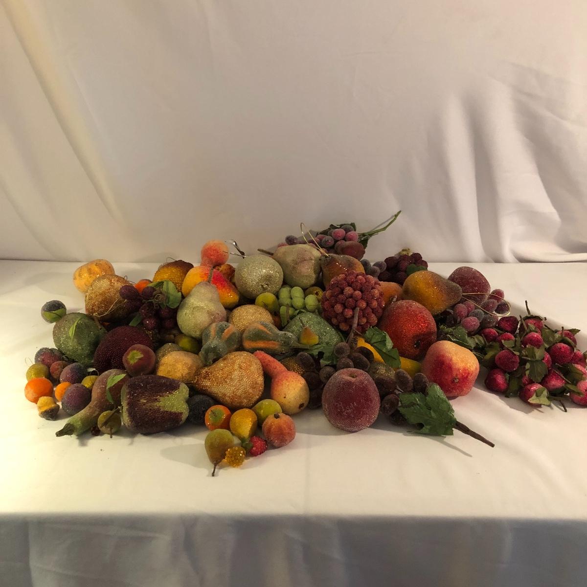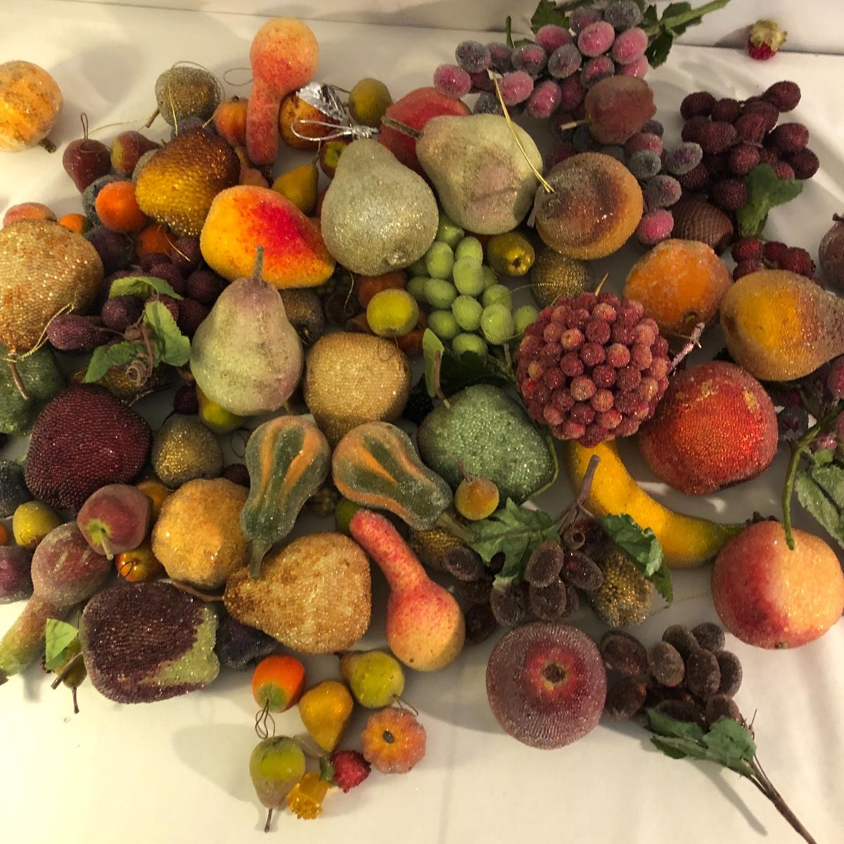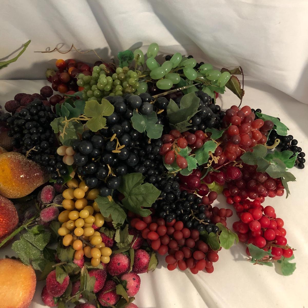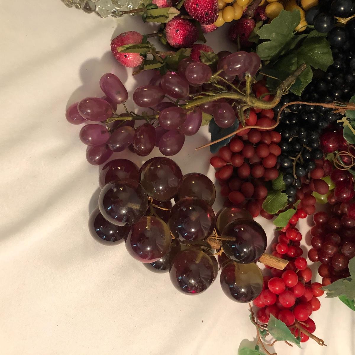 Decorate your table or fill your bowls or baskets with this decorative fruit. You can be ready for the holidays and everyday with this bountiful collection of fruit. The fruit is made of glass, plastic and other materials. Some fruit looks lifelike and other looks blingy, see pictures. Purple grapes measure 3” x 3” x 9”.