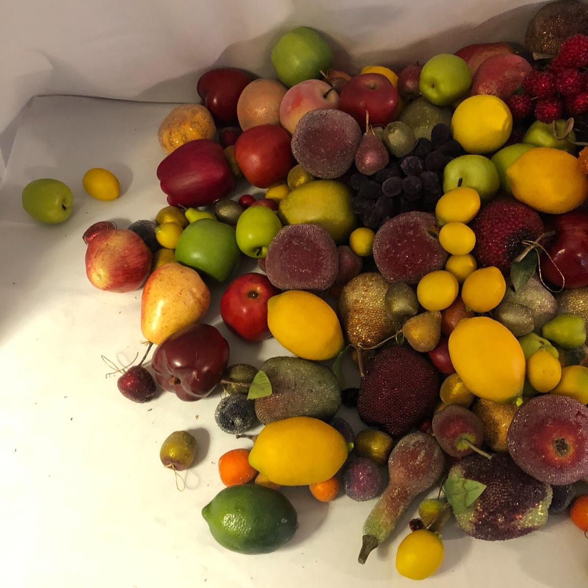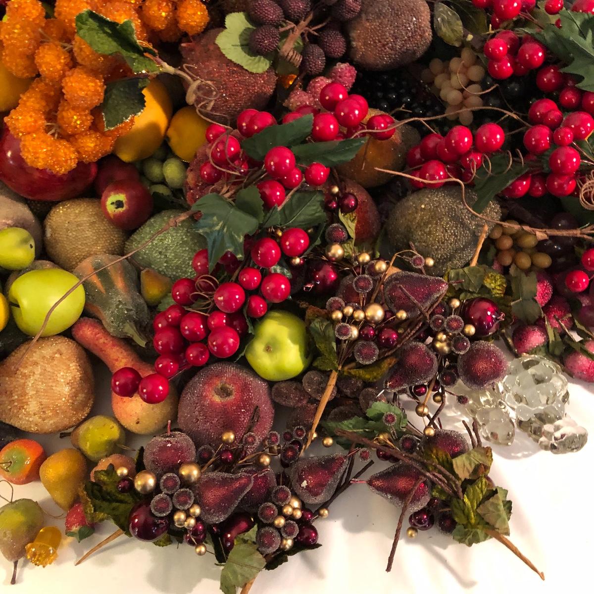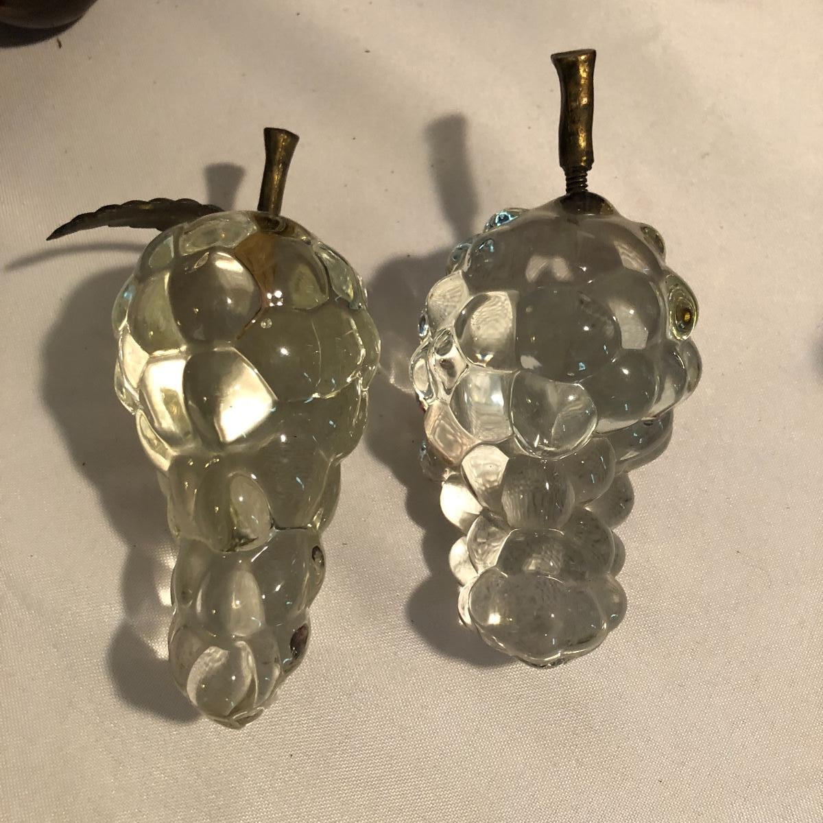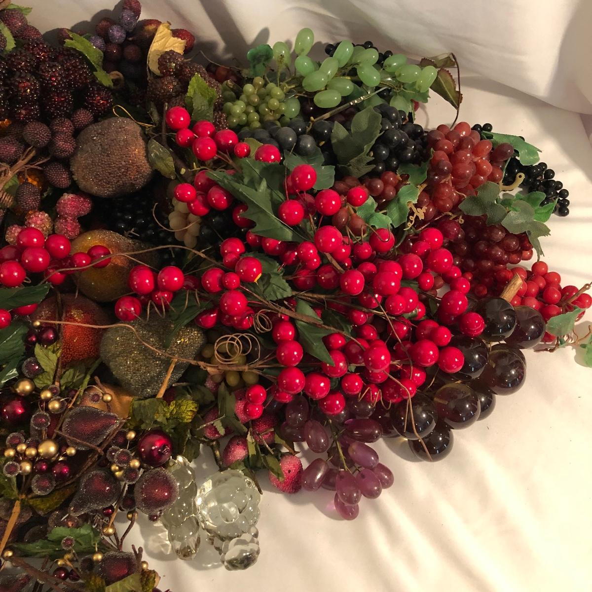 Decorate your table or fill your bowls or baskets with this decorative fruit. You can be ready for the holidays and everyday with this bountiful collection of fruit. The fruit is made of glass, plastic and other materials. Some fruit looks lifelike and other looks blingy, see pictures. Purple grapes measure 3” x 3” x 9”.