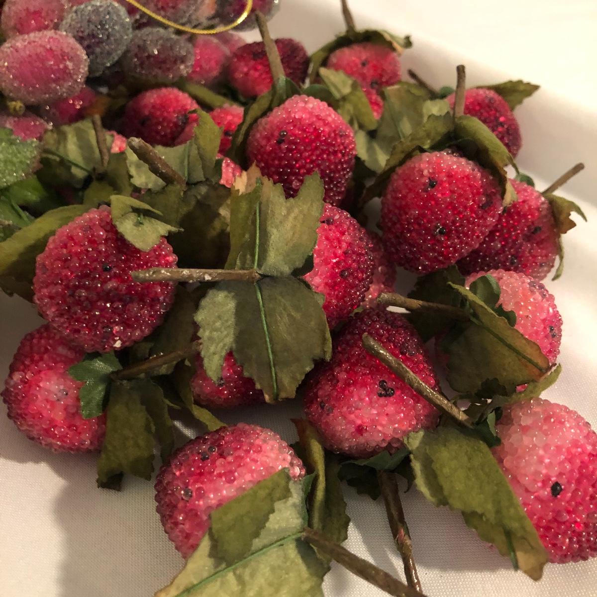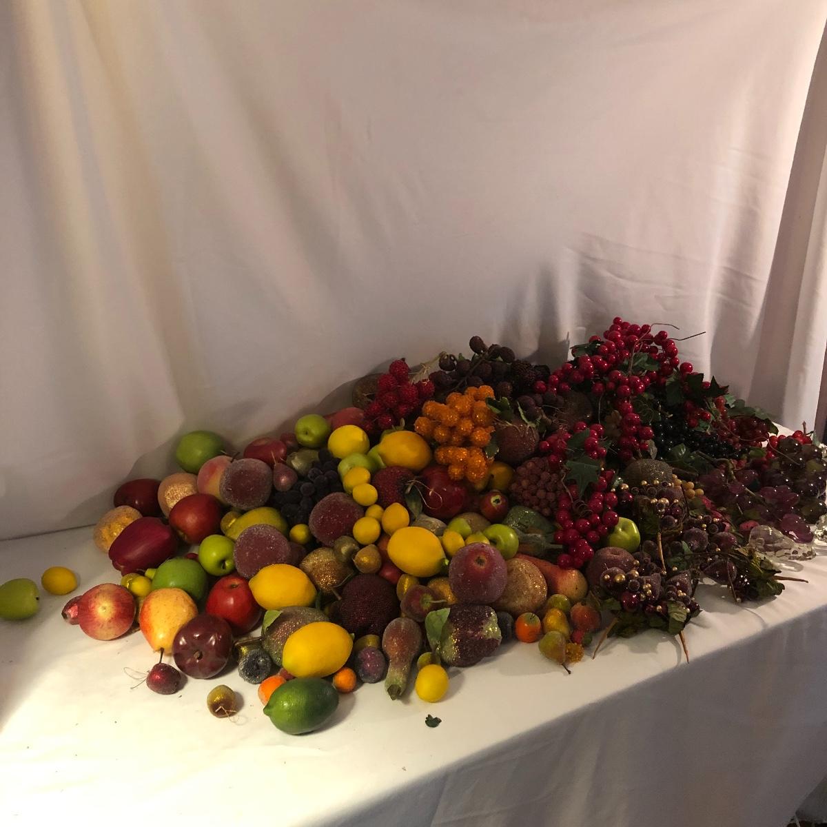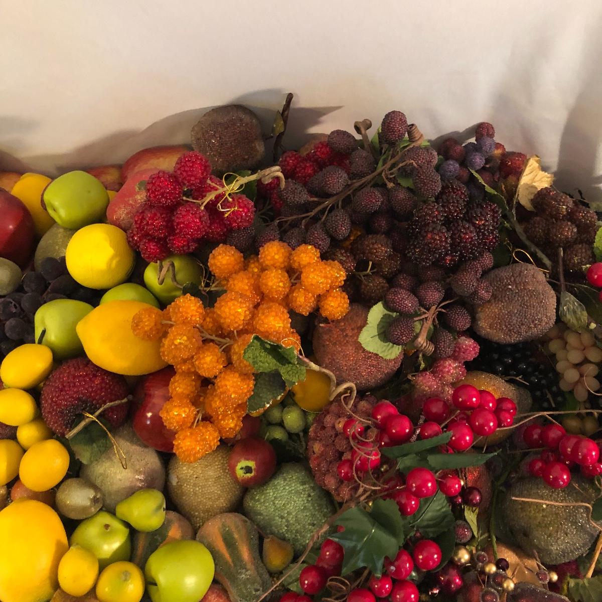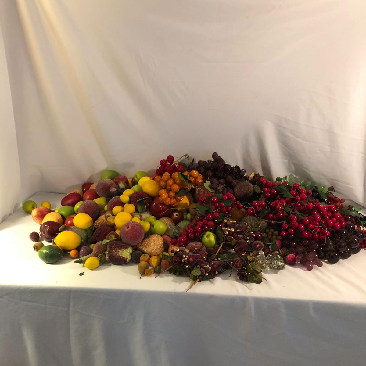 Decorate your table or fill your bowls or baskets with this decorative fruit. You can be ready for the holidays and everyday with this bountiful collection of fruit. The fruit is made of glass, plastic and other materials. Some fruit looks lifelike and other looks blingy, see pictures. Purple grapes measure 3” x 3” x 9”.