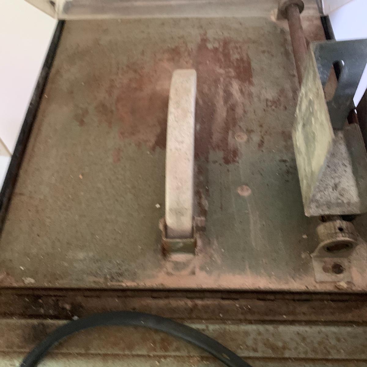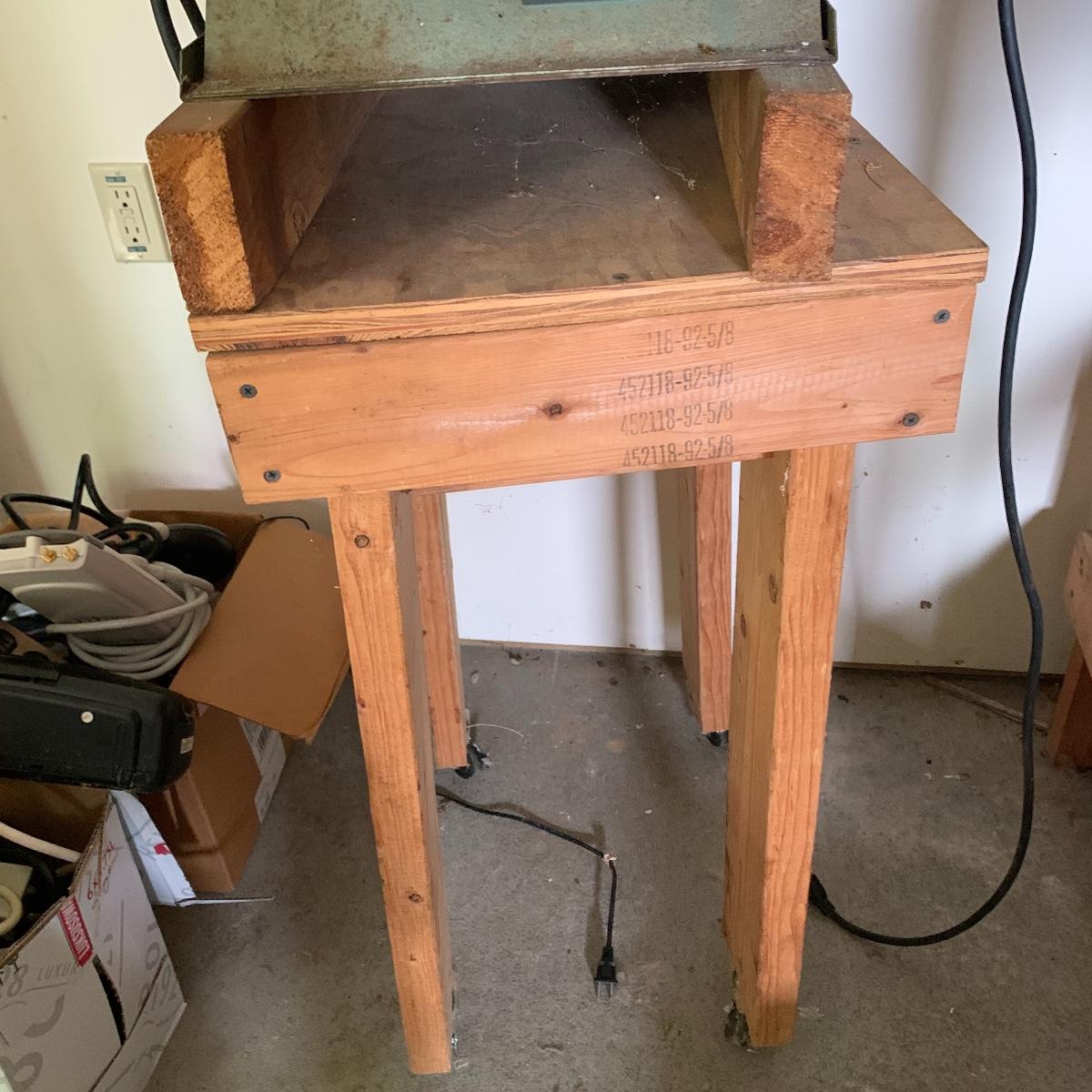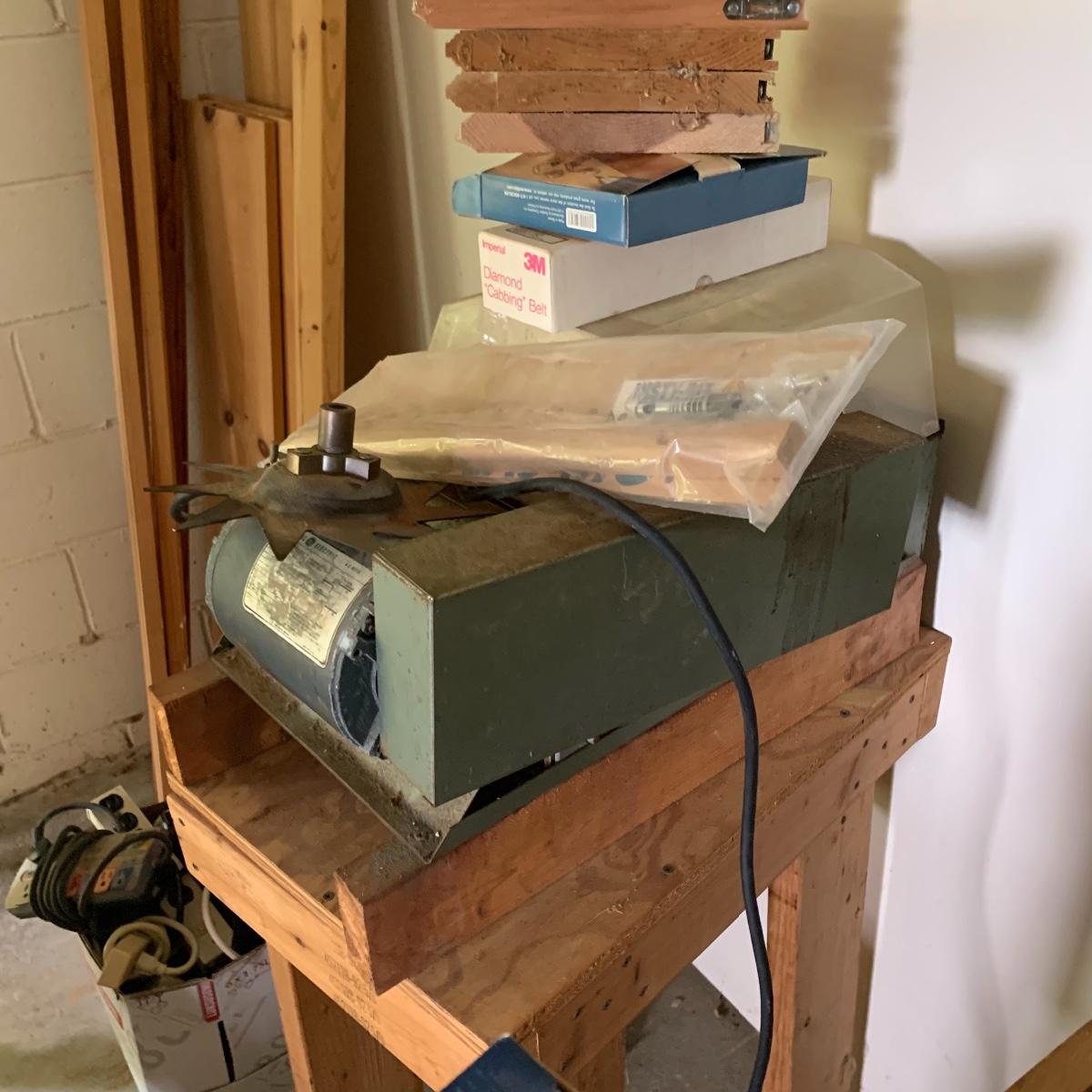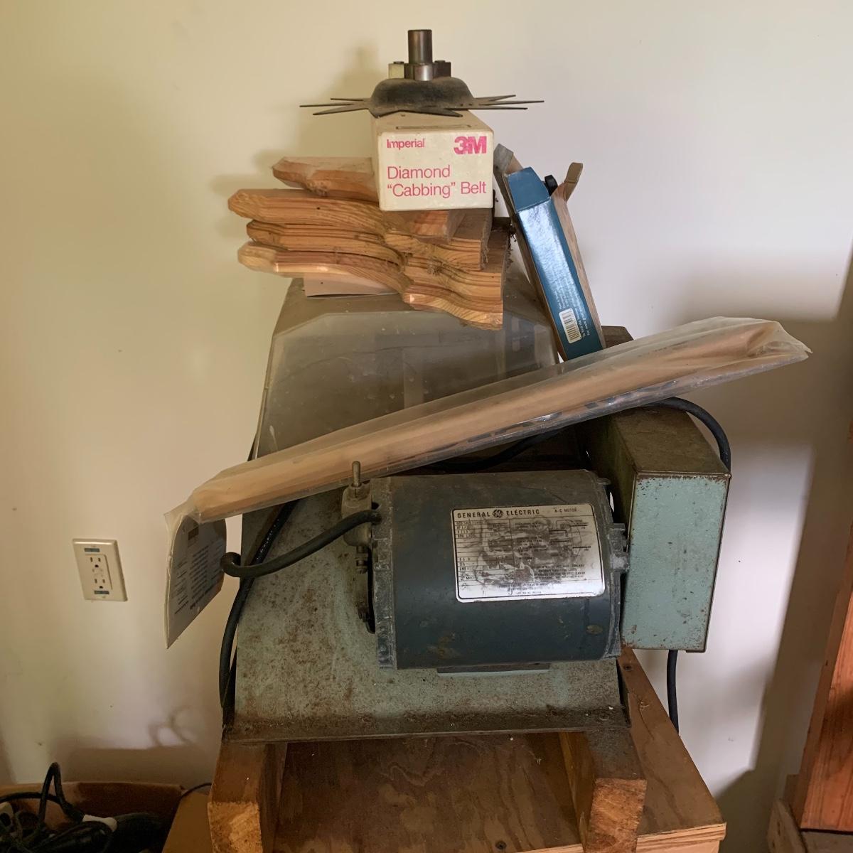 Wood workers take note! This is a GE wood cutting machine in working condition. Included are four wooden corbels, a diamond “cabbing” belt, blades, and more. This comes with a homemade base as well. Local pickup only.
