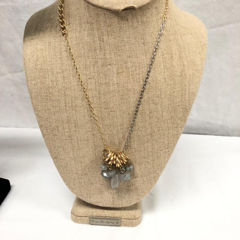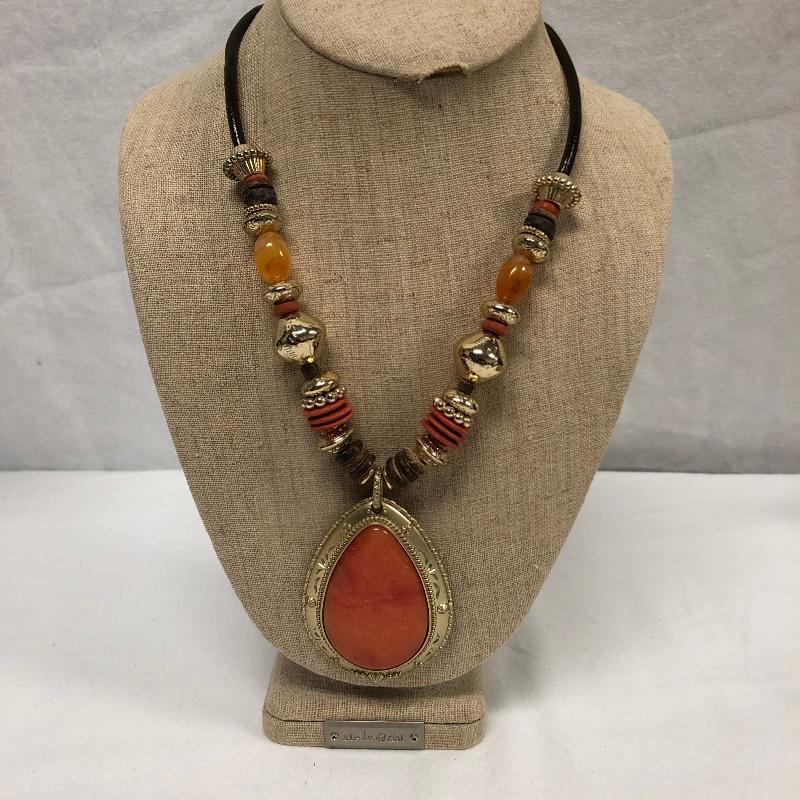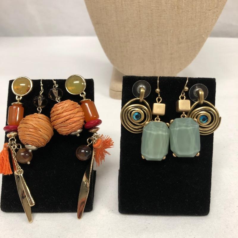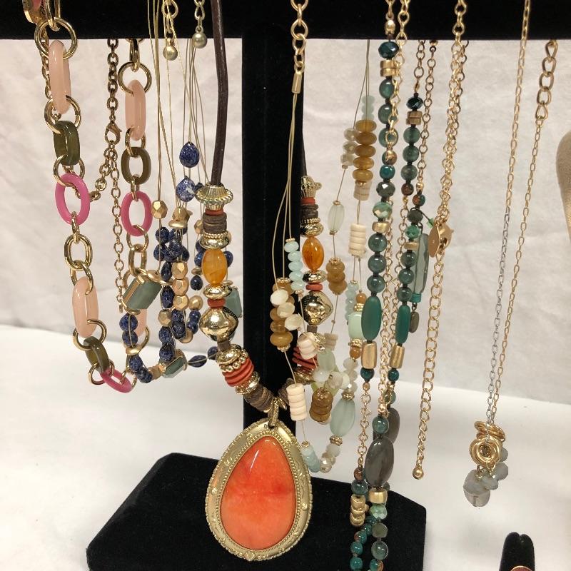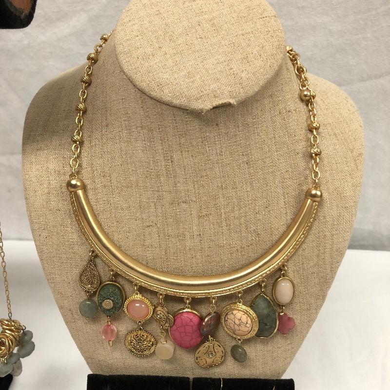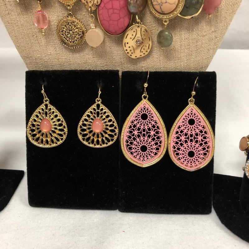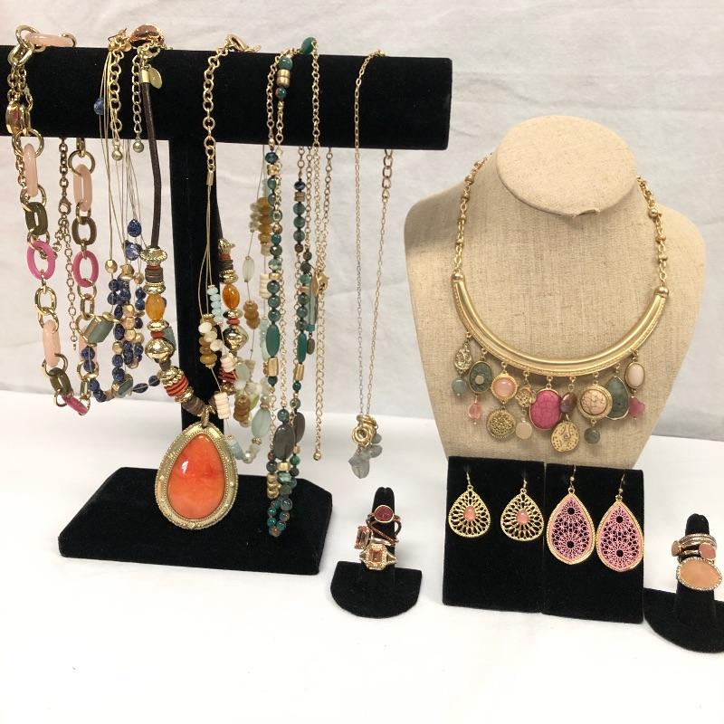 Opulent elegance abounds with these many and varied gold colored pieces with splashes of pinkish hues. Includes a plethora of necklaces, rings and earrings.