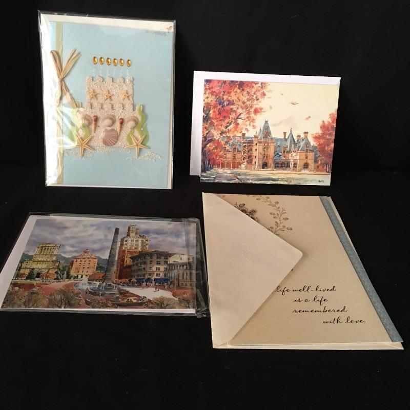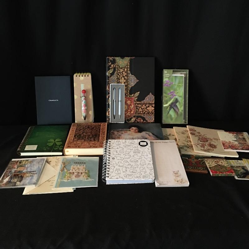 This is a great way to write your thought with this collection of journals and more. Lot includes five journals , six notepads, pen and pencil set, two boxes of cards, three lovepop cards and more cards. All papers appear to be unused.