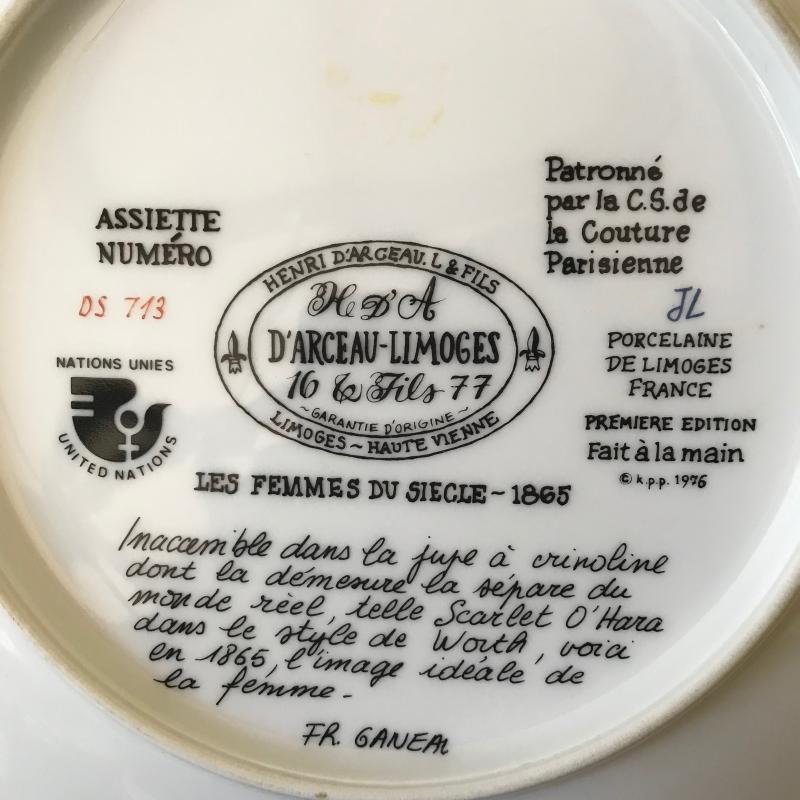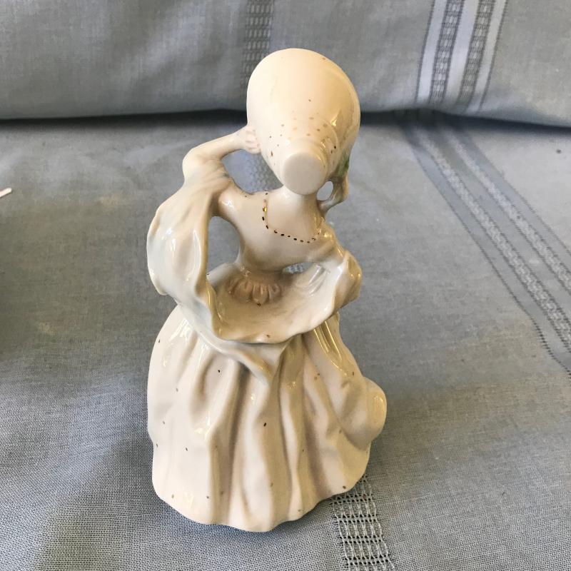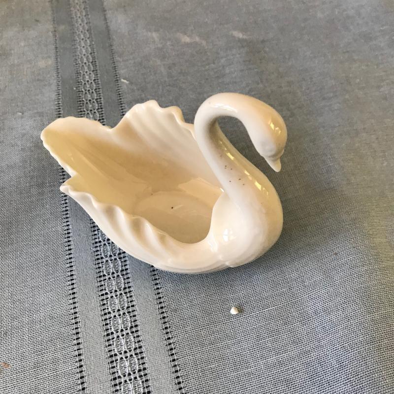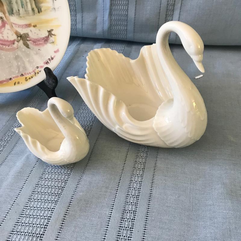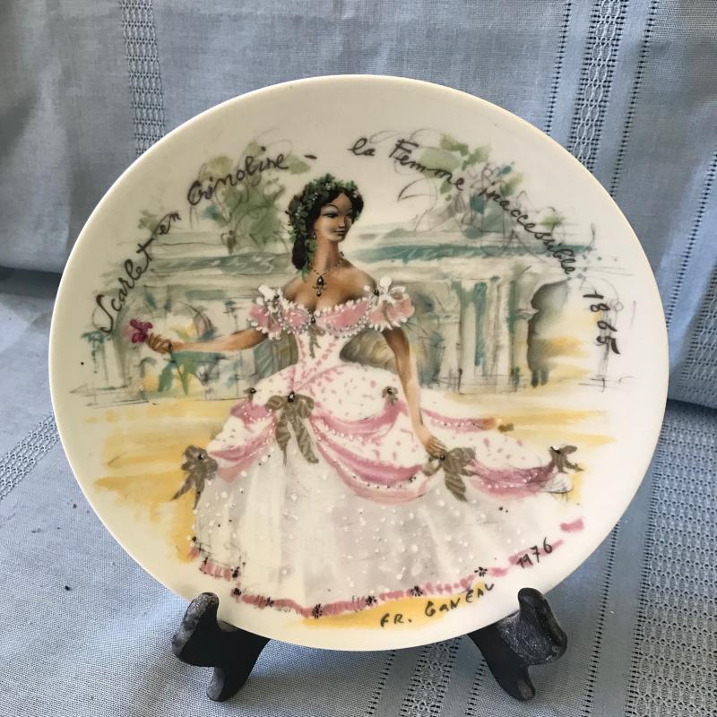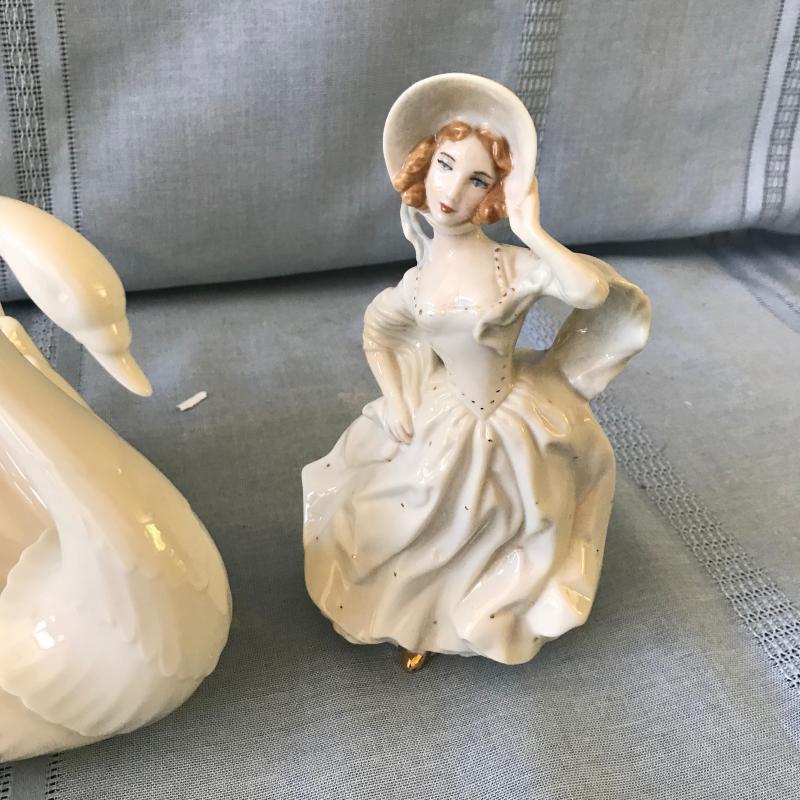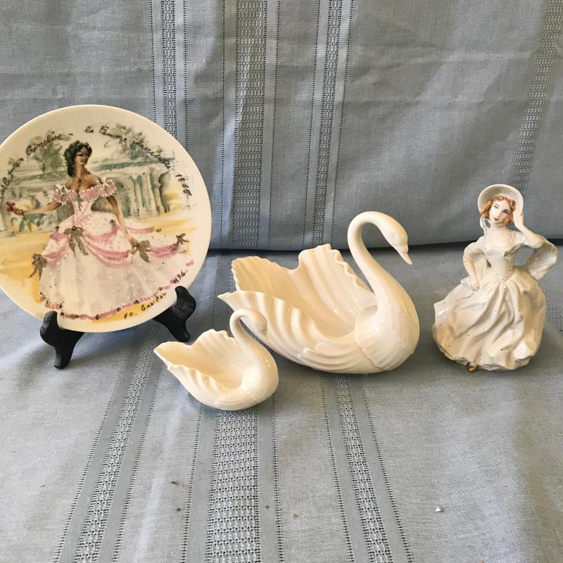 Pair of Lenox swans, larger one is approx. 9” x 6” x 7”. Collectible porcelain lady “Sophie” (1964) is approx. 4” x 3” x 7”. “Scarlet en Crinoline” plate is described in French on back. See pics. Shipping available or local pickup.