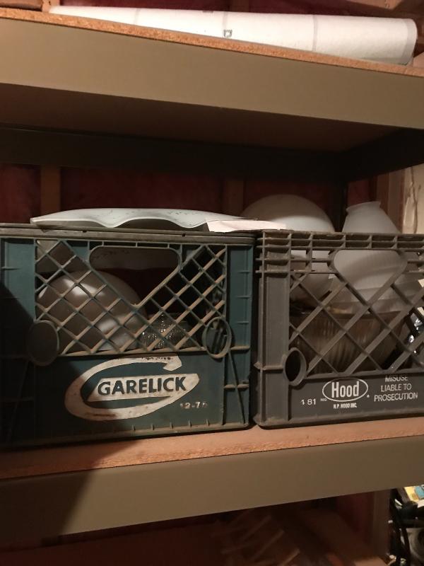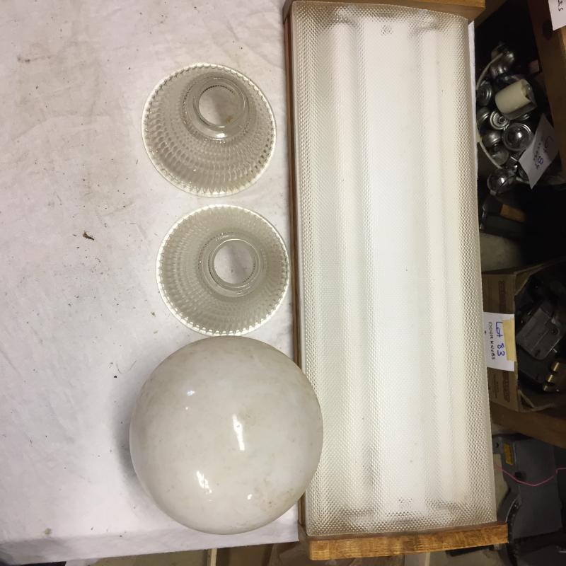 Light Fixture and Glass globes for Light Fixtures. Fluorescent light fixture is 26” x9.5” and square center mount ceiling globe is 9” x9”. Two Milk crates included in Lot.